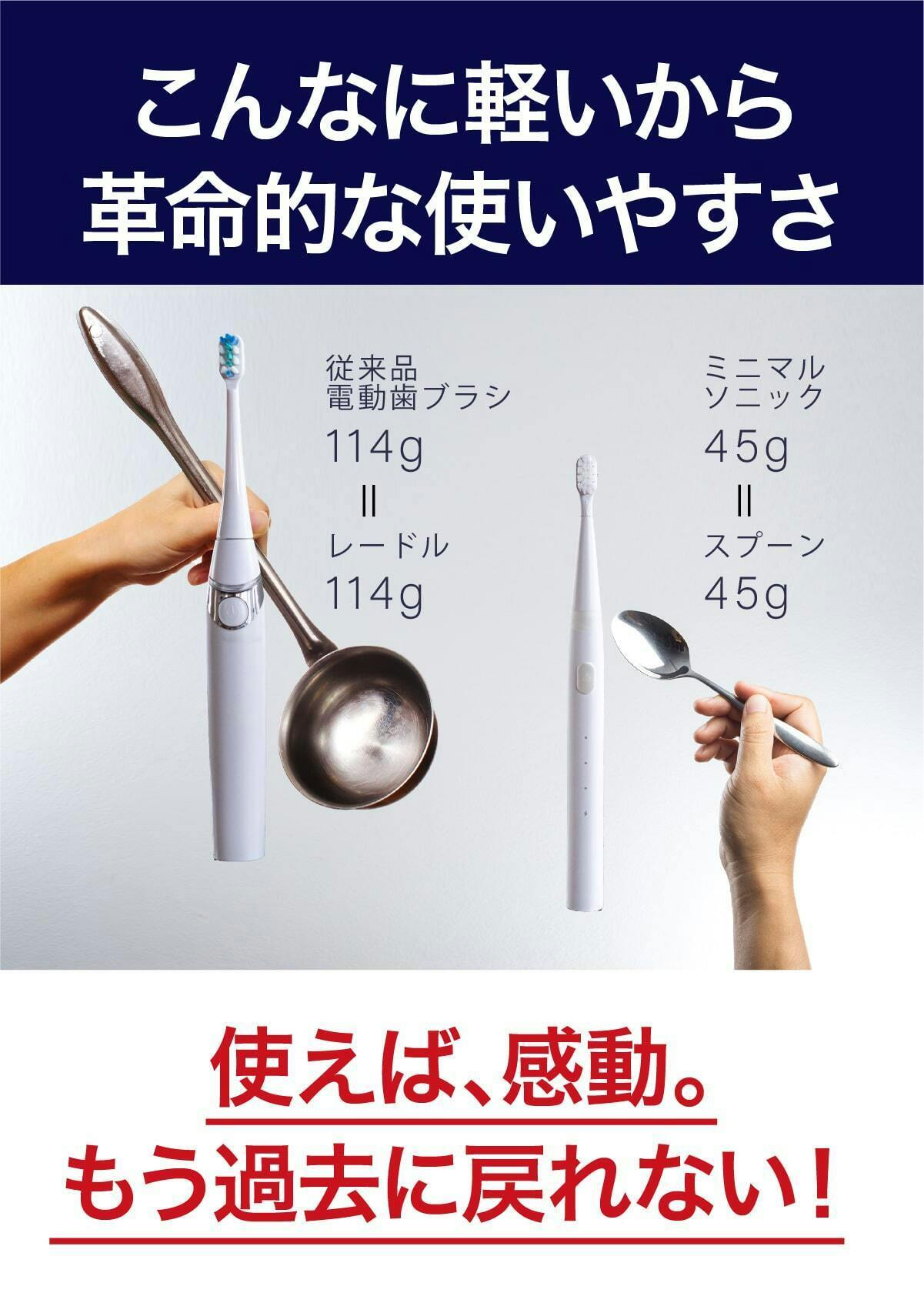 今までの電動歯ブラシを大きいと感じたことはありませんか?普通の歯ブラシから電動歯ブラシに変えた時にそれを大きく感じると思います。電動歯ブラシは構造上、大型化してしまうのですが、常識に囚われずまったく新しい電動歯ブラシを設計したのがこのミニマルソニックです。新発想の構造で小型でパワフル。未来の体験をはじめましょう。