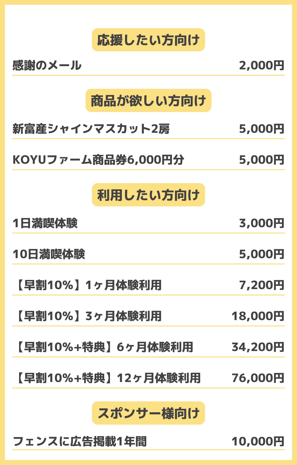 今回のプロジェクトのリターンにはDOG RUN新富を体験できるものをはじめとしてKOYUファームの製品など、DOG RUN新富と児湯の魅力に触れられるものをご用意致しました。