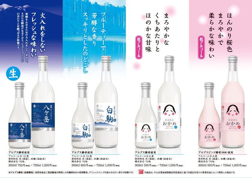 米は八ヶ岳山麓のヨネシロ、酵母は長野県の酵母アルプス酵母、水は八ヶ岳伏流水を用い長野の清酒製造技術を使ったどぶろくです。