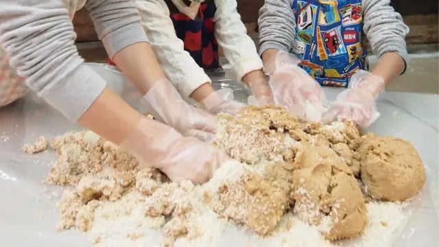 ⑤つぶした大豆の熱が取れたら塩と米麹を入れ、種水を加減しながら混ぜて、耳たぶぐらい の柔らかさになるまで、よくこねる。
