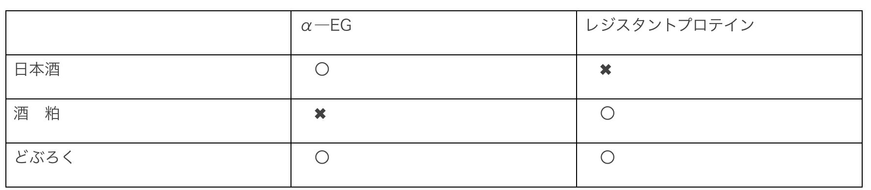 ※α-EGはアルコールと糖が結びついて生成されており、どぶろくと日本酒には含まれますが酒粕には含まれません。