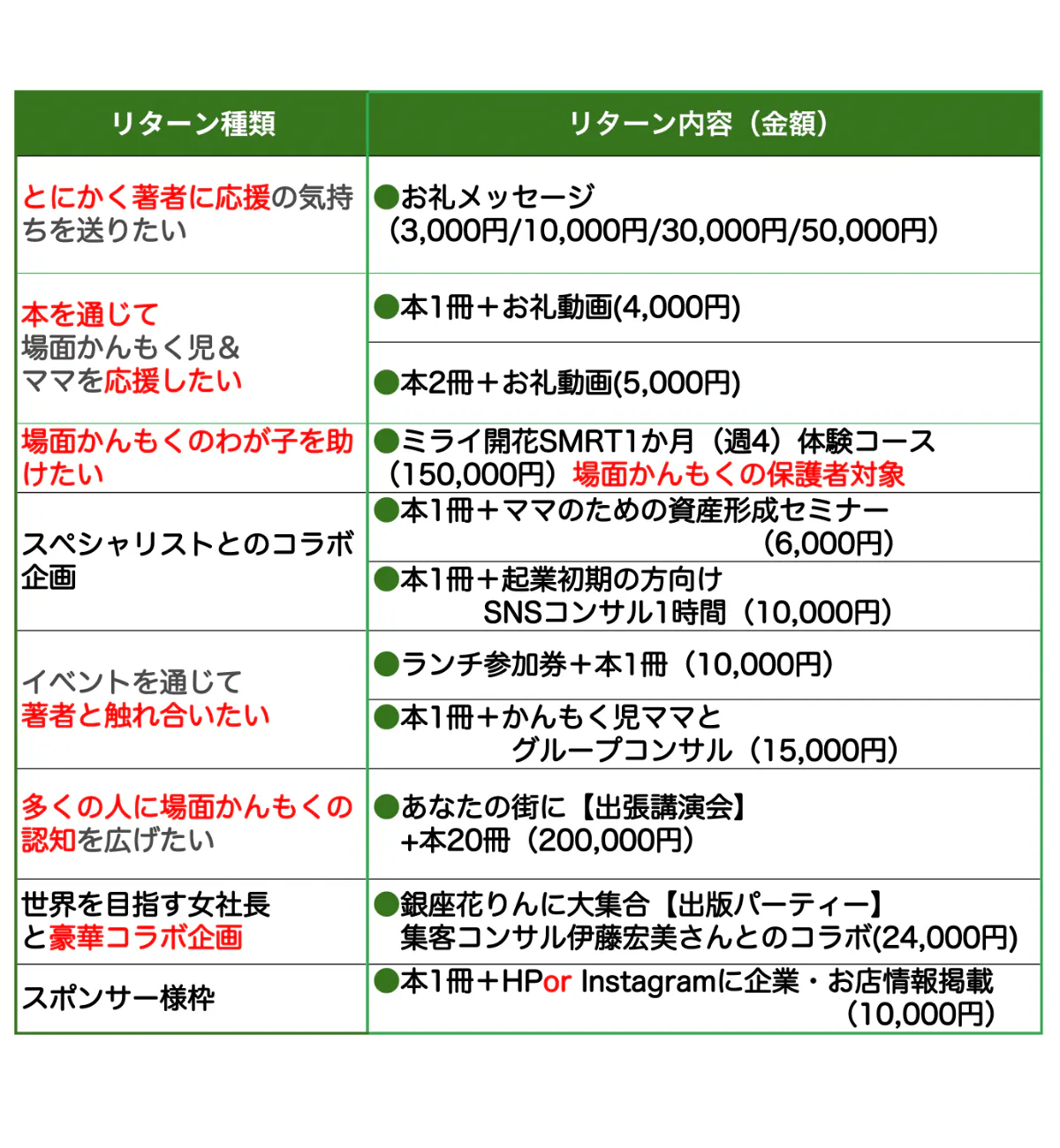 リターン一覧から、希望するリターンを選んでご支援ください。支援者の皆様には、本の完成後にお礼としてサイン入りの本をお届けするほか、このプロジェクトだけの特別なリターンもご用意しております。