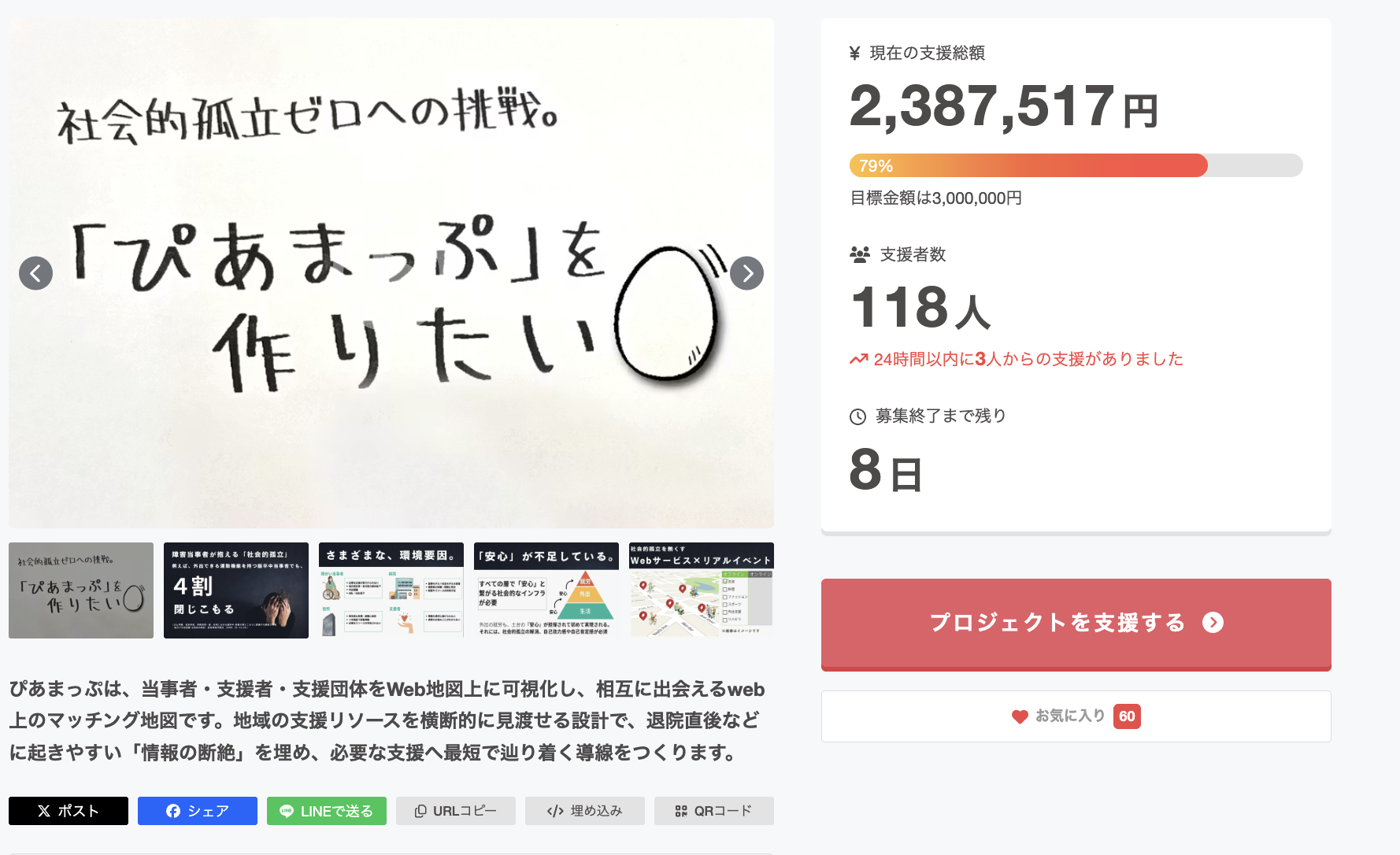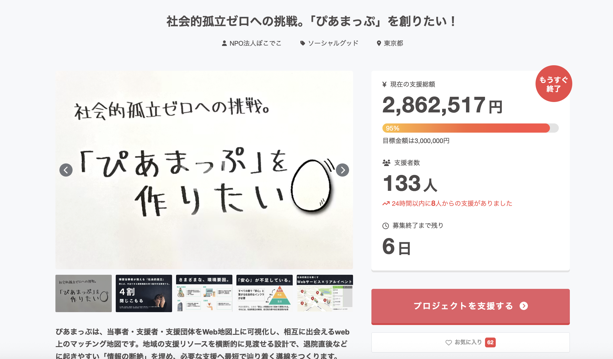 皆さんこんにちは。NPO法人ぼこでこ代表理事の小林純也です。いつもご支援いただき、ありがとうございます。昨日を持ちまして、「ぴあまっぷ」のクラウドファンディングは終了しました。総額3,752,517円のご支援を、193名の方々からいただきいました。直接ご支援いただいた方以外でも、SNSでの拡散や、コメントをいただくだけでも、本当に嬉しかったです。改めて、感謝申し上げます。さて、皆様のご支援のおかげで、ようやくスタートに立つことができました。ここからが始まりです。皆さんと一緒に、体温のあるWebサービスで「社会的孤立をゼロにする」取り組みを、加速させていきたいと思っています。これからも、見守っていただけましたら幸いです。リターンの発送は、これから順次お届けさせていただきます。もうしばらくお待ちください。今後とも、よろしくお願いします。NPO法人ぼこでこ代表理事小林純也