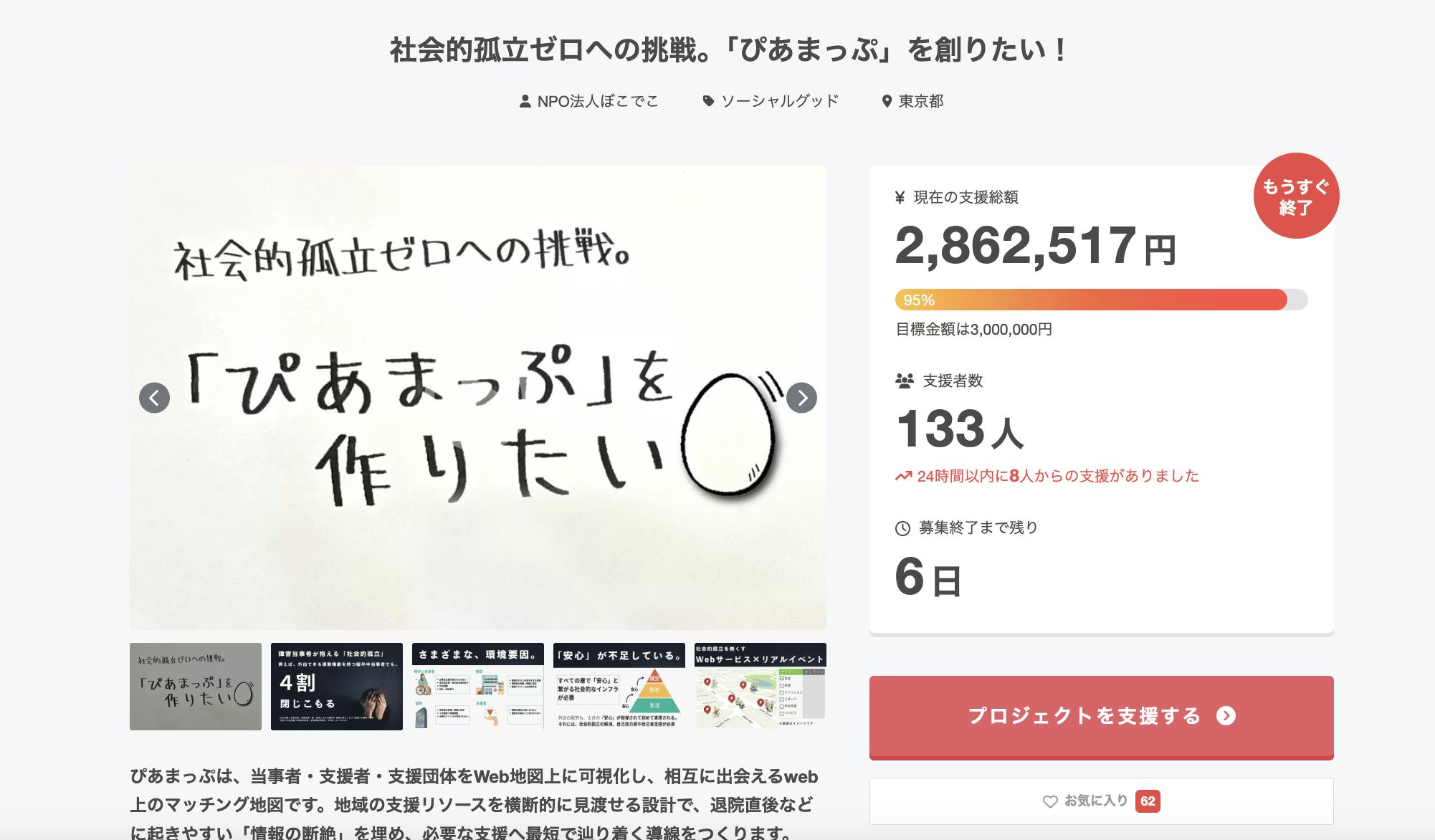 先日お伝えさせていただきました通り、その一歩を全国へ広げるための新しい挑戦として、社会的孤立ゼロを目指すWebサービス「ぴあまっぷ」 のクラウドファンディングに挑戦しています。