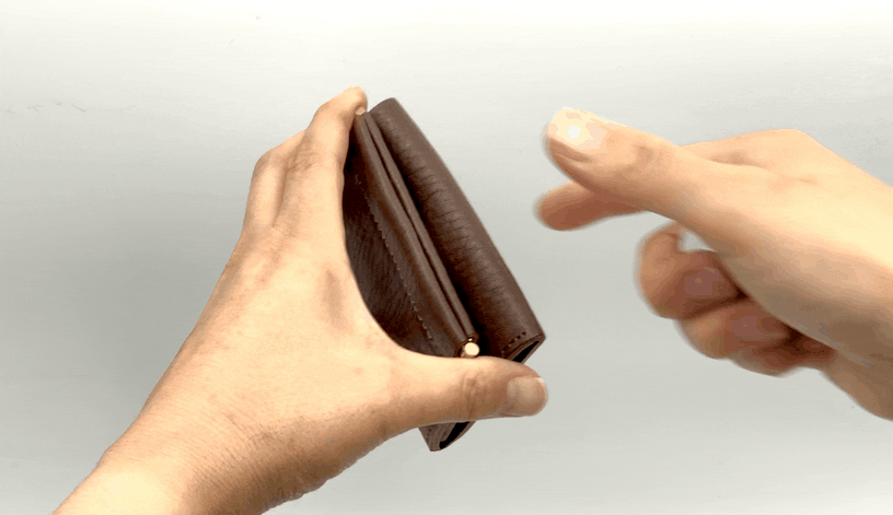 右左の端を片手で押し込むとコインポケットが開き、力を抜くと自ら閉じる仕様。