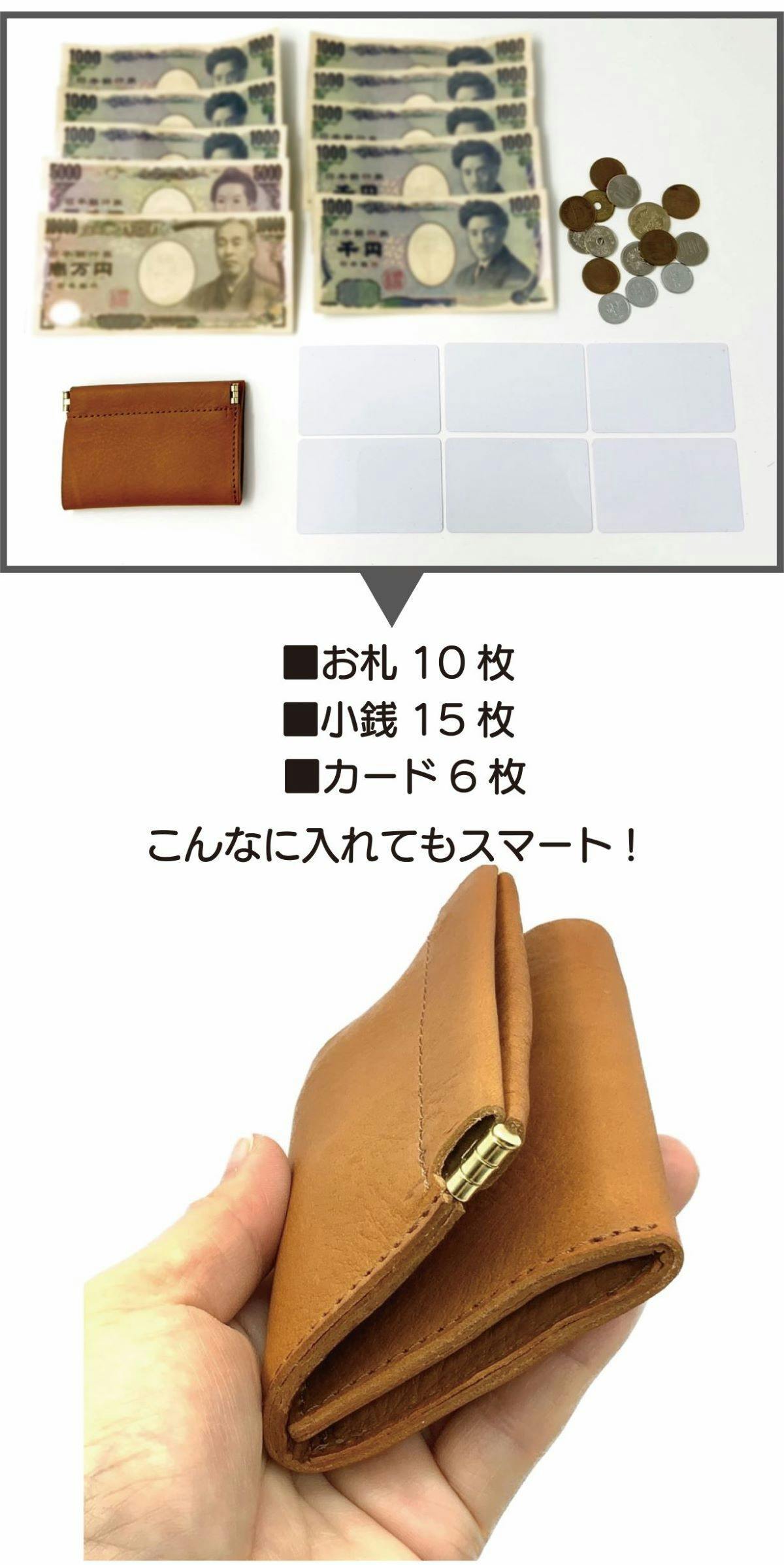 でもこの本革ミニ財布は小さいけれど、カードポケット、お札スペース、小銭入れをゆったりと設計しているので、上記のような心配はいりません。