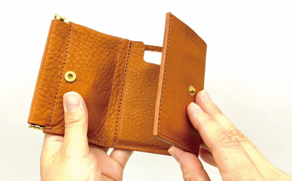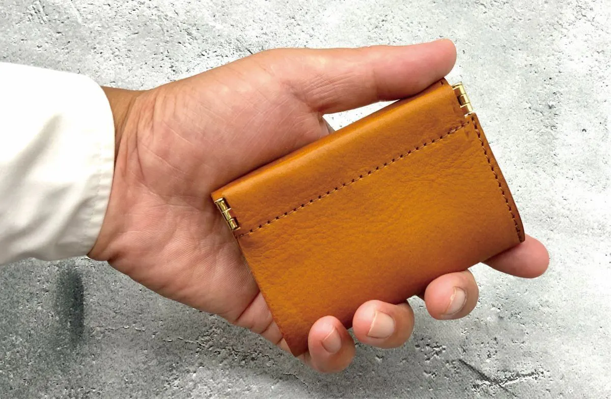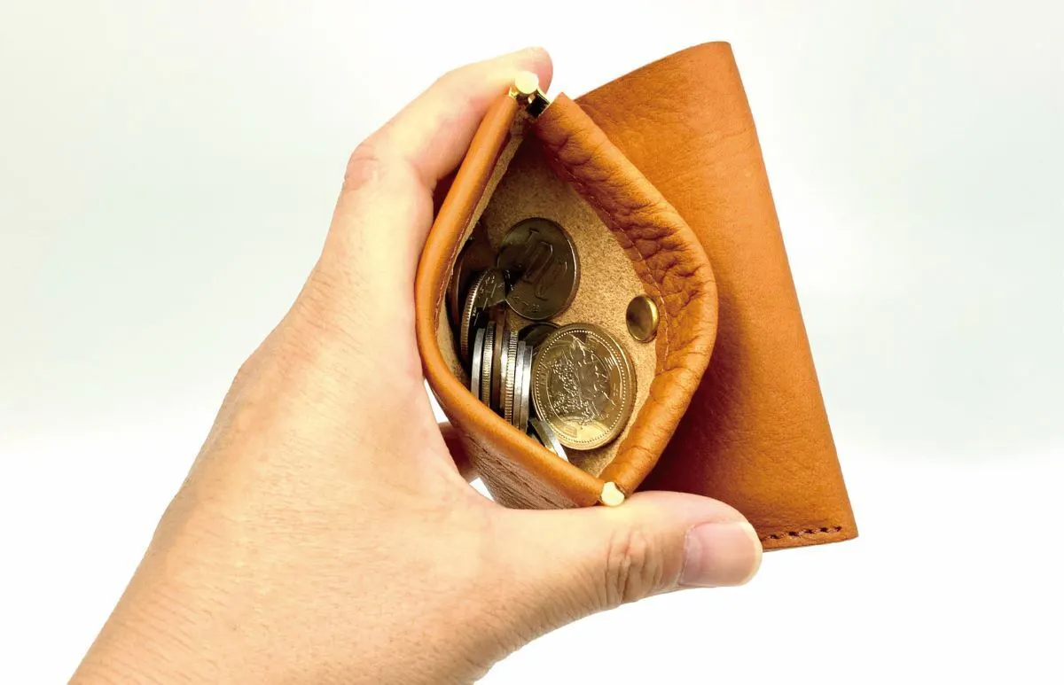 片手で瞬時に開く『バネ口金』仕様の小銭入れ。
