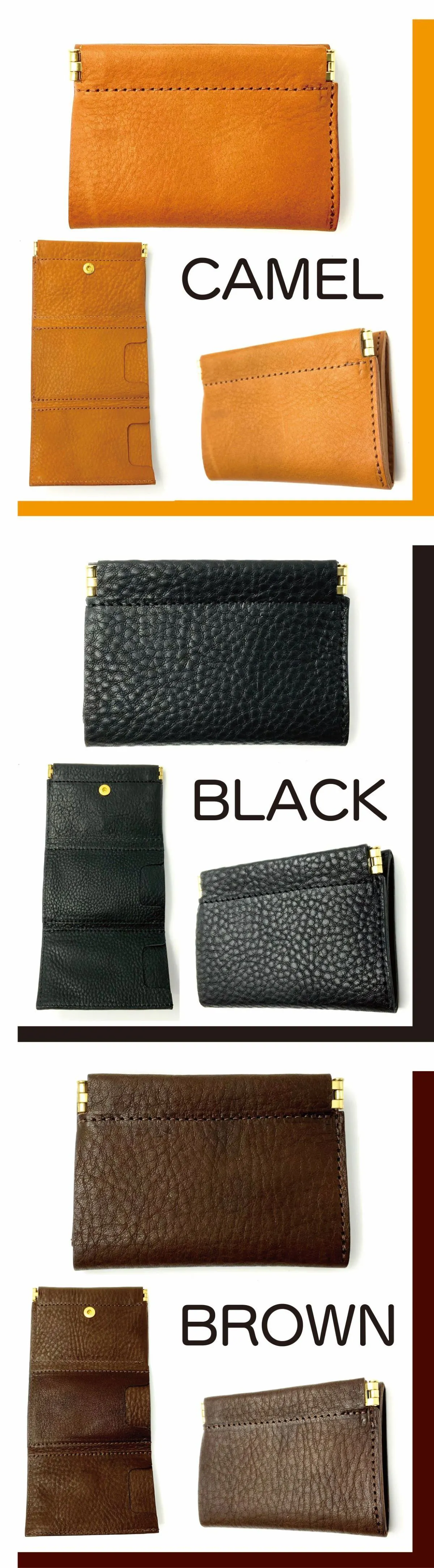 カラーは革を感じてもらいやすいキャメルとブラックとブラウンをご用意致しました。
