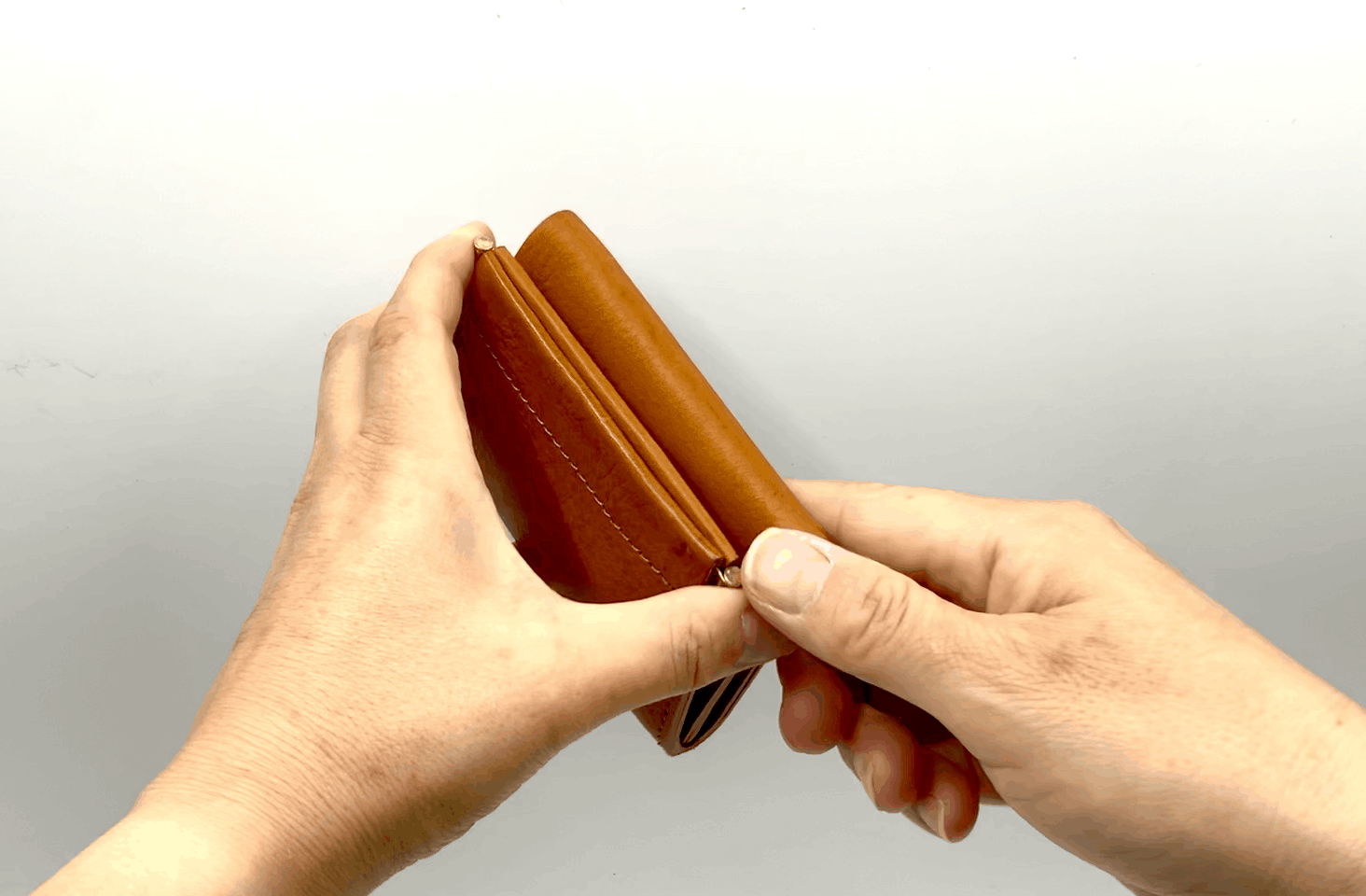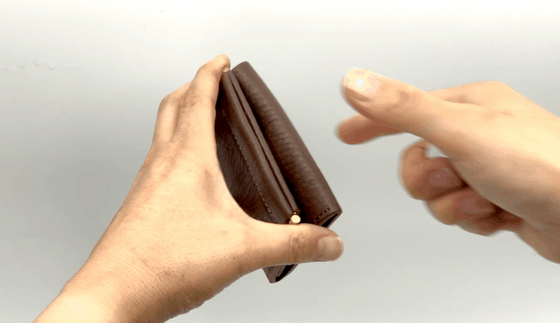 右左の端を片手で押し込むとコインポケットが開き、力を抜くと自ら閉じる仕様。