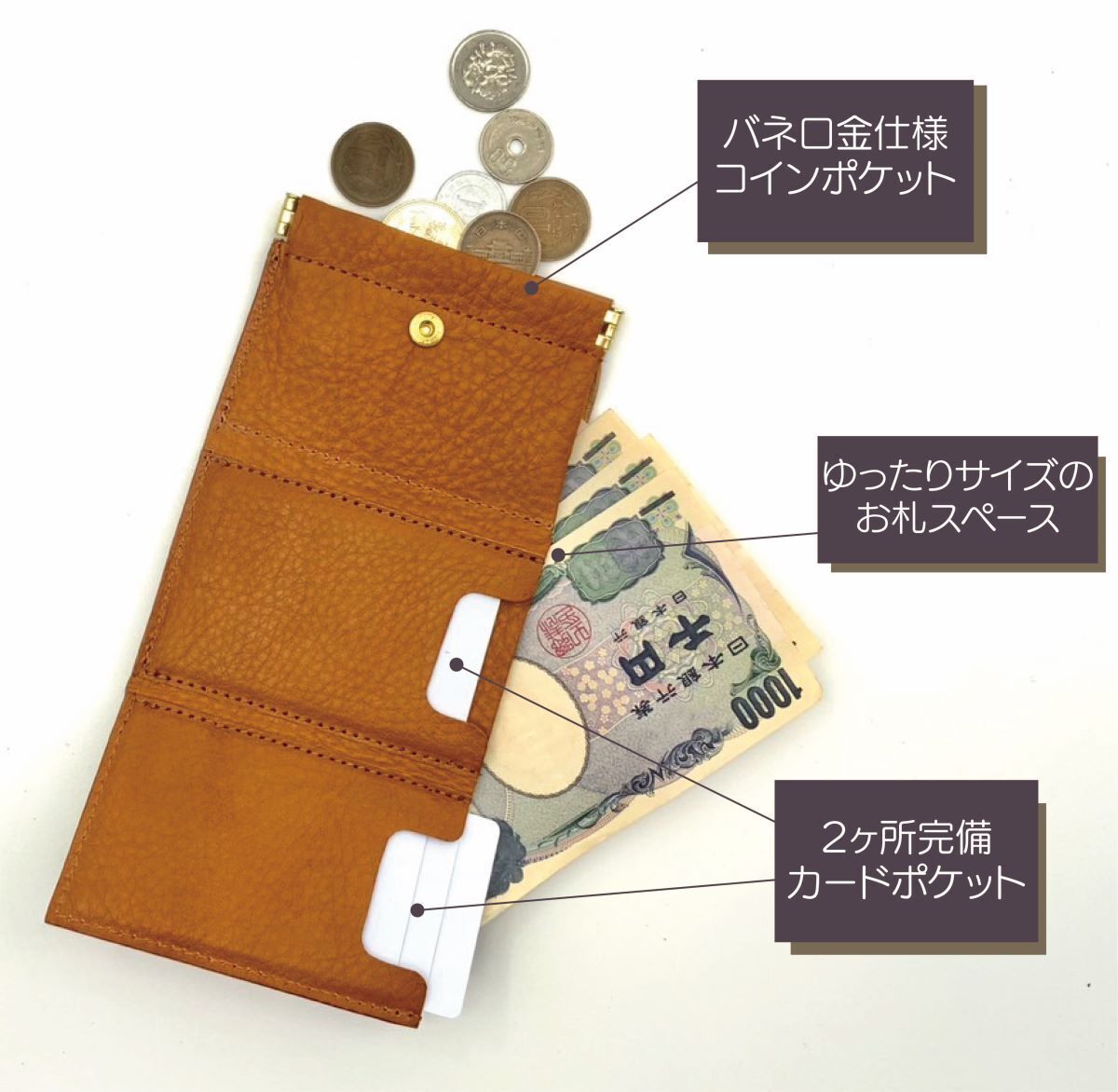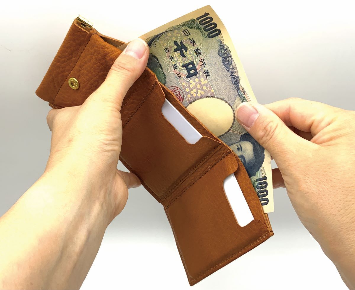 窮屈すぎるとお札が入れにくかったり、折れたりしてしまいがちですが、余裕があることで出し入れしやすくしました。