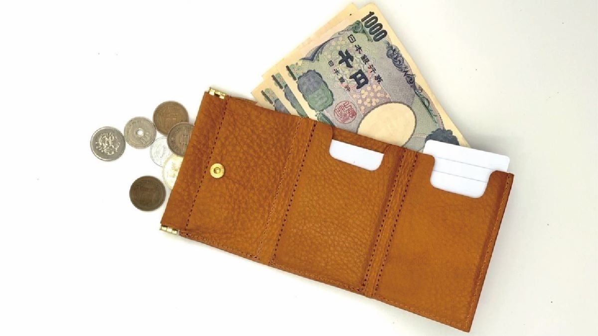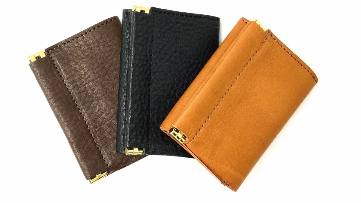 片手で瞬時に開く『バネ口金』仕様の小銭入れ。