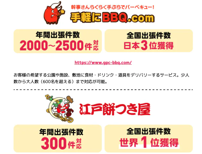 - 当社は出張バーベキューサービス、バーベキュープラットフォーム、出張餅つきサービスなど出張パッケージ商品提供に特化しており、多くの実績とノウハウがございます。