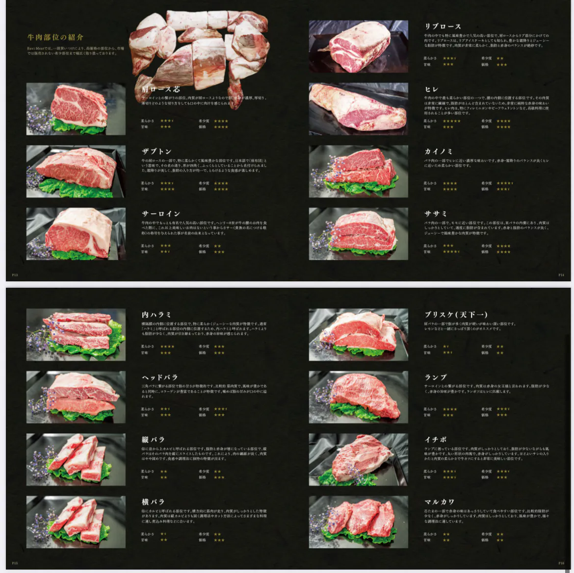 - 牛肉は多くの部位に分かれます。さらに小さい部位に分かれます。その一つ一つが旨味、甘味、風味、柔らかさ、濃さが異なります。