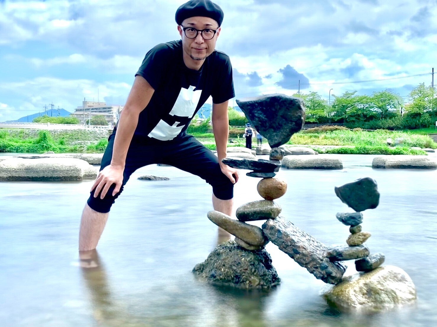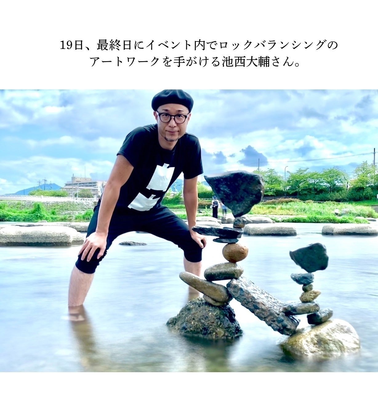 石を絶妙なバランスで積み上げていくロックバランシング。普段は鴨川で行うことで有名な池西さんが今回は室内でワークショップを行う。訪れた人々を神秘的な空間へ導く時間をアライメントと共に作り上げる。