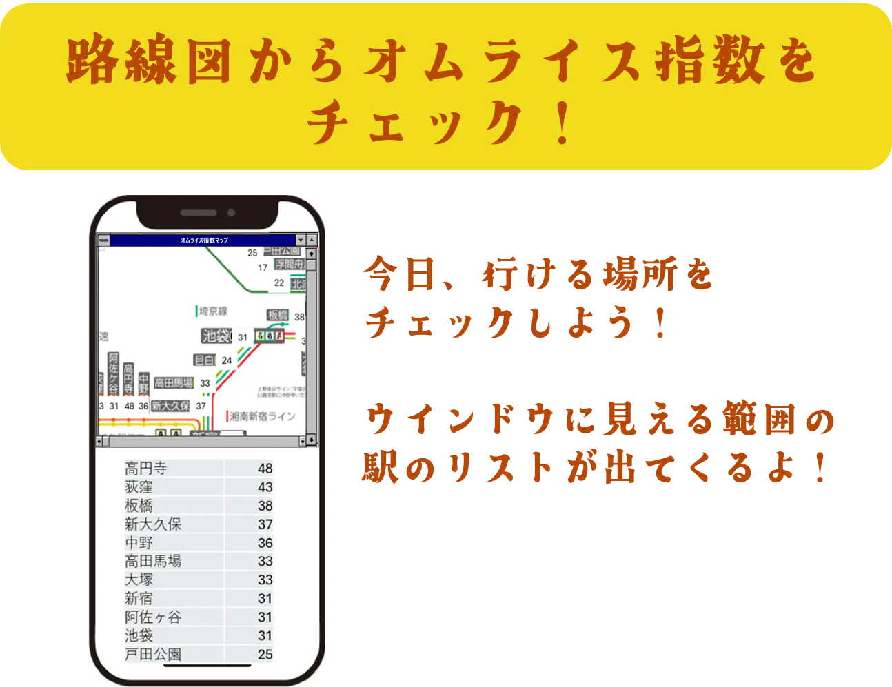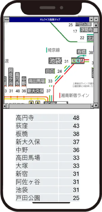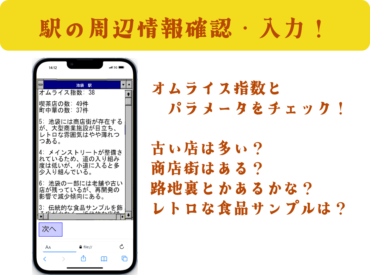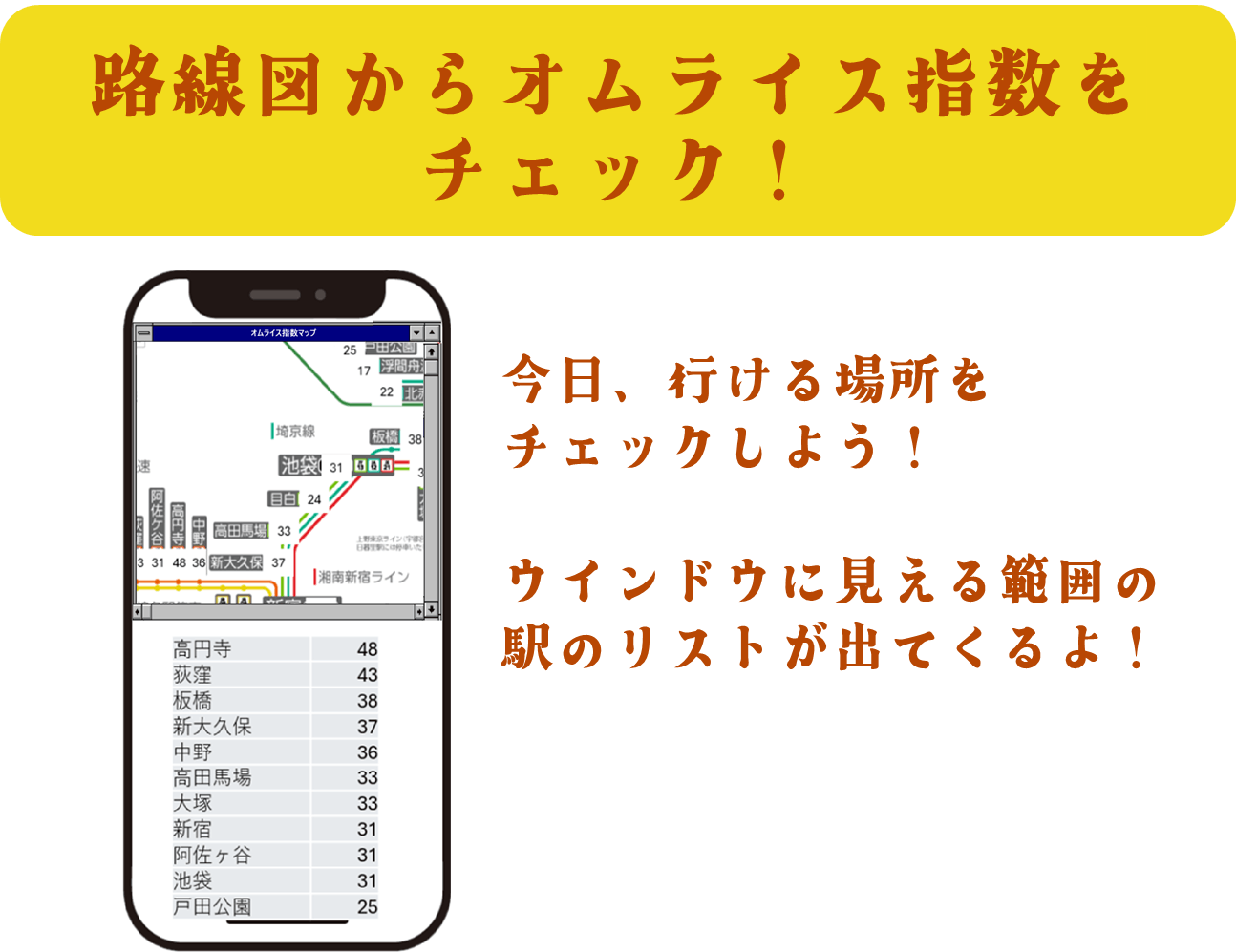 プロトタイプとして、各駅の「オムライス指数」を以下の観点から算出してみました。