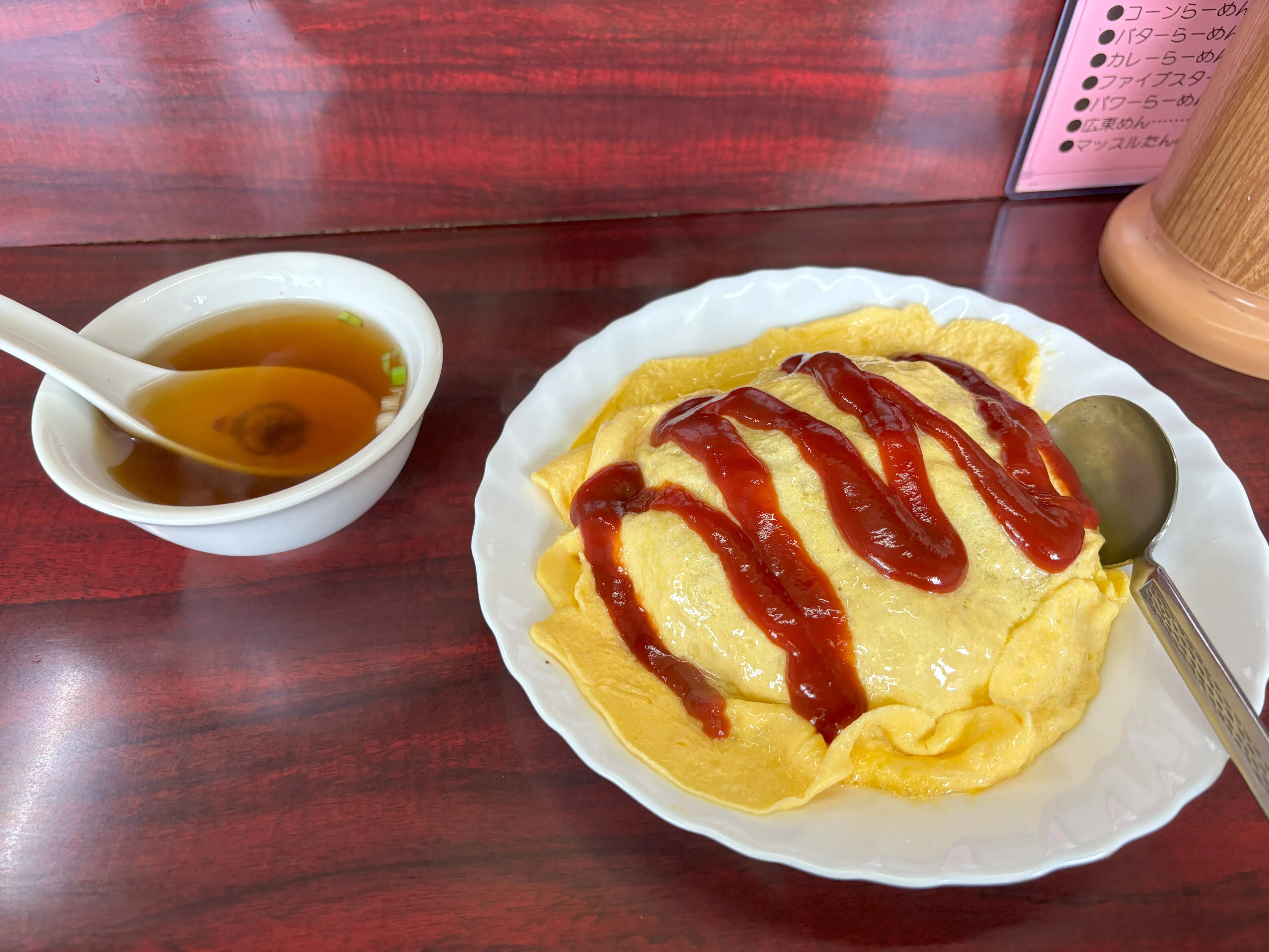 町中華のオムライスは、見た目は気にせず、天津飯のように卵焼きが乗っかっているというものが多いです。味もなんとなく中華っぽいですね。もちろん店によってはきれいに仕上がっているものもあります。