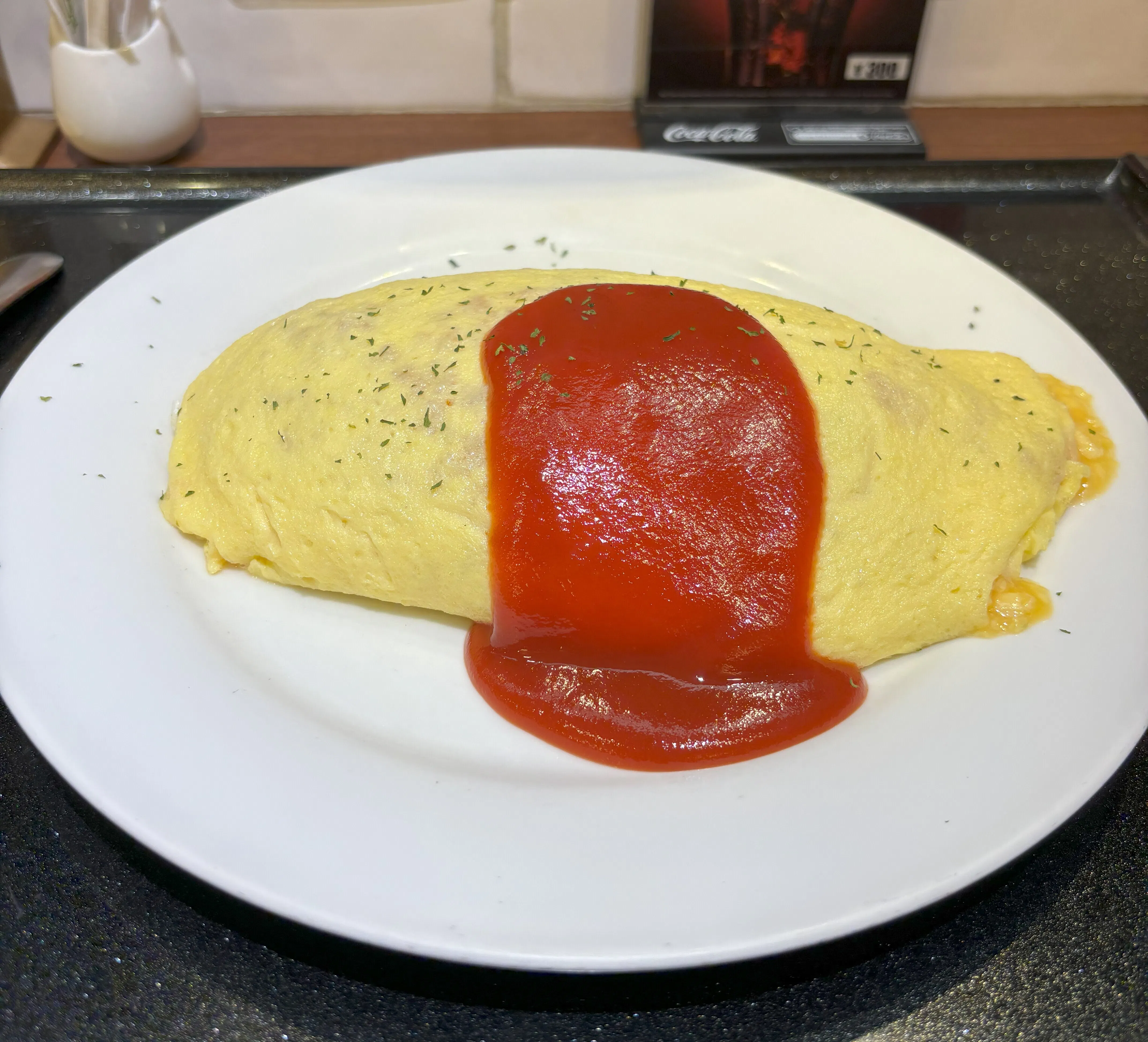 しっかり焼いた薄焼き卵の中にチキンライス、ソースにはストレートのケチャップ。