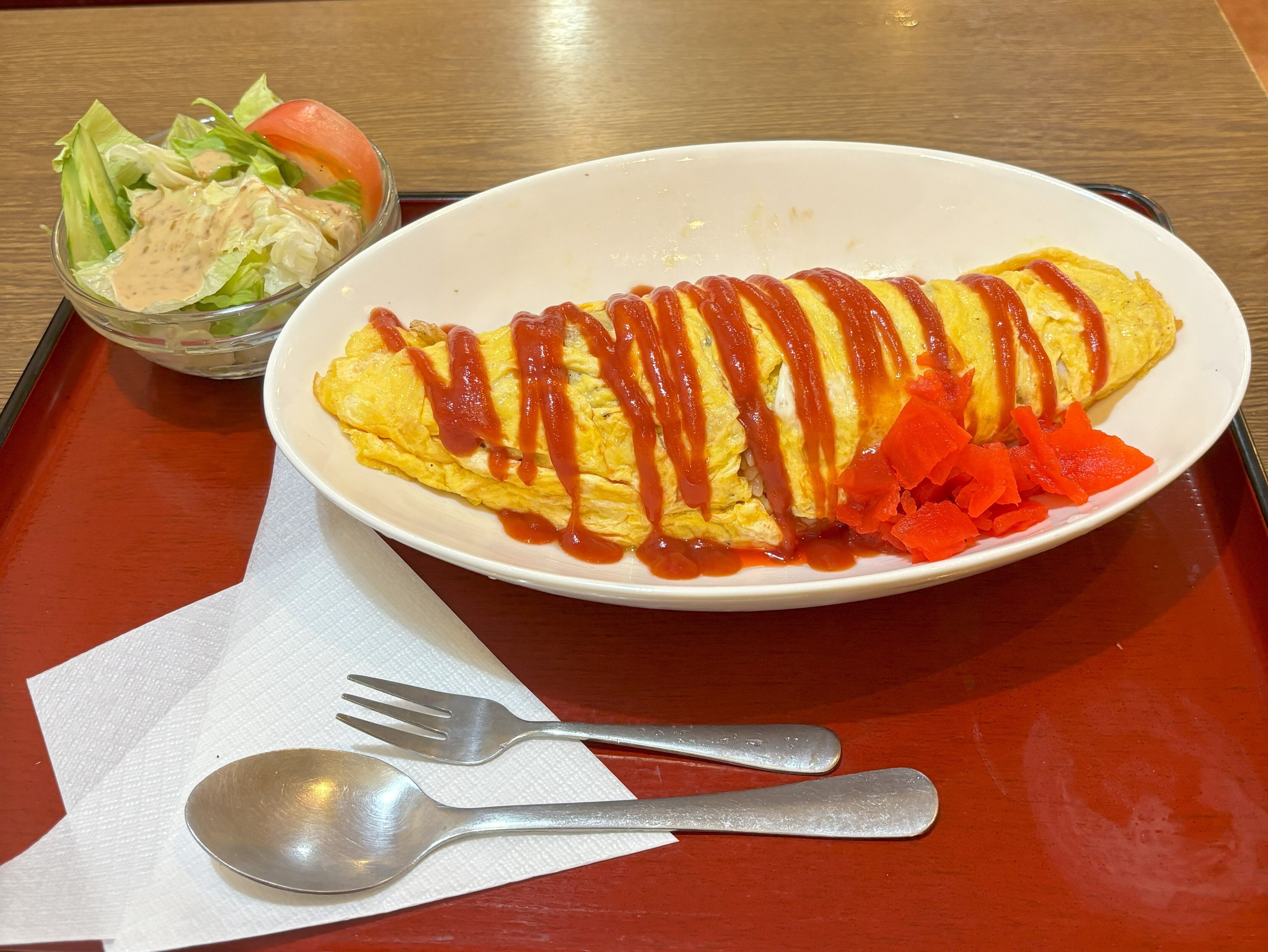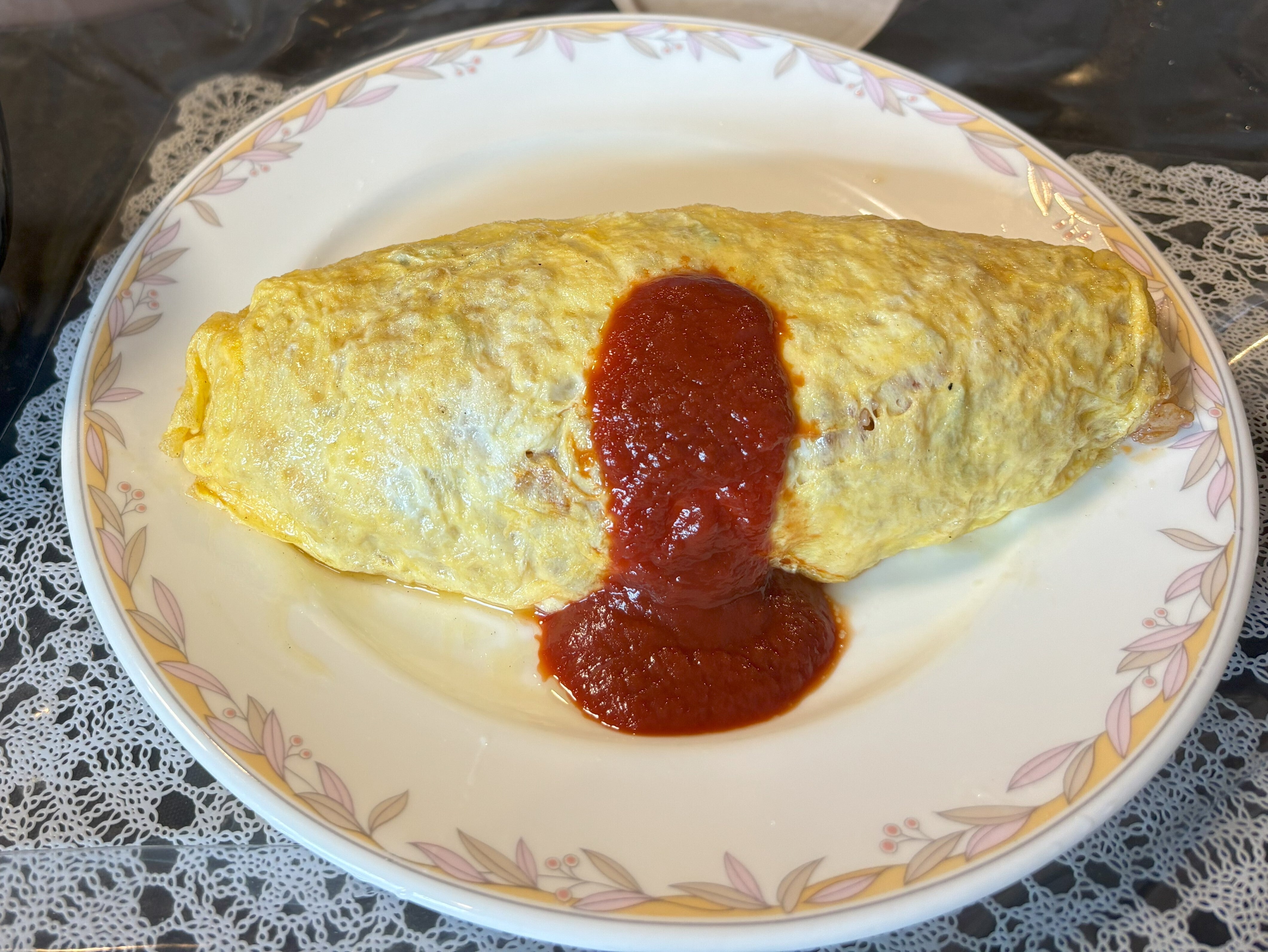 しっかり焼いた薄焼き卵の中にチキンライス、ソースにはストレートのケチャップ。
