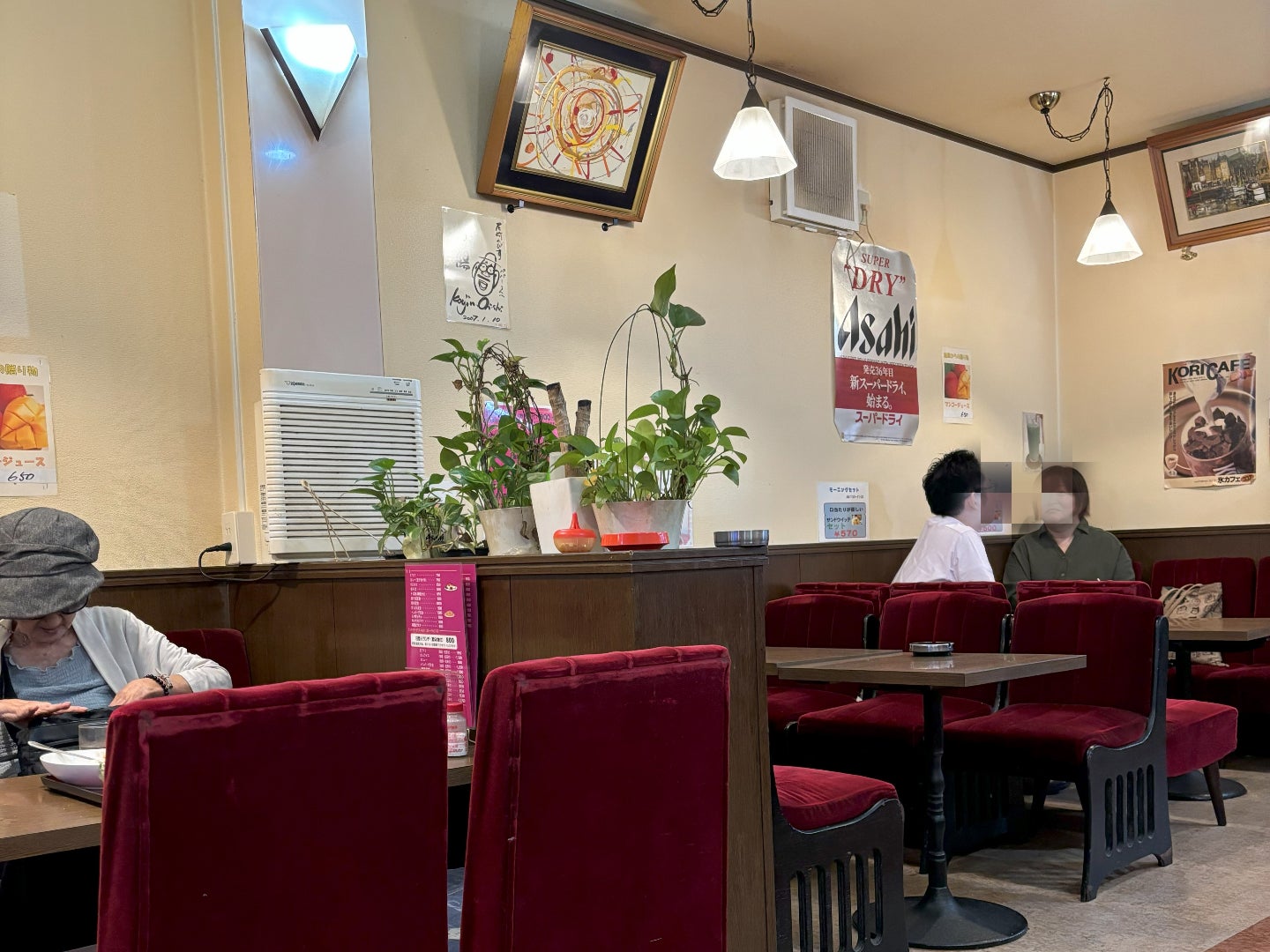入って見ると、テーブルが木製のパーティションに区切られていて、赤いビロードの椅子が特徴的です。
