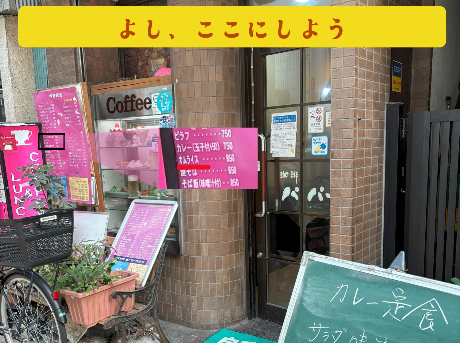 店の前に自転車を置いていたり、メニューがボロボロだったり、ショーケースに食品サンプルが並んでいたりする店は、昔ながらのオムライスがある可能性が高いです。