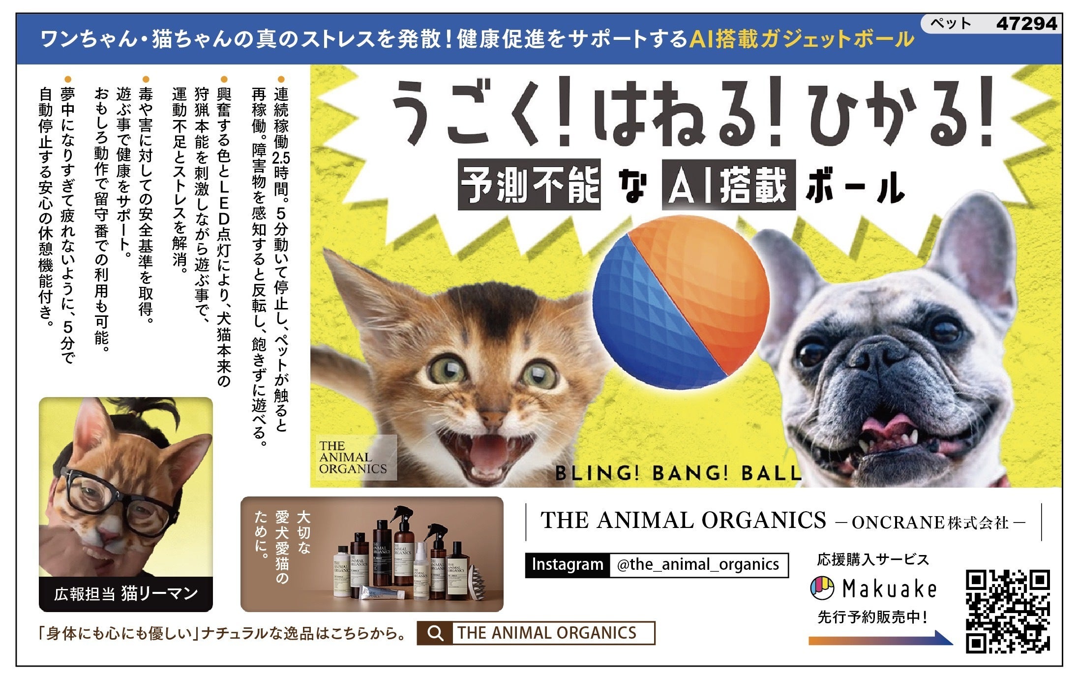 私たち ” THE ANIMAL ORGANICS ” ではそんな危険を回避する為、ストレス解消にとっておきの犬猫用のAI搭載のガジェットボールの開発に成功しました。