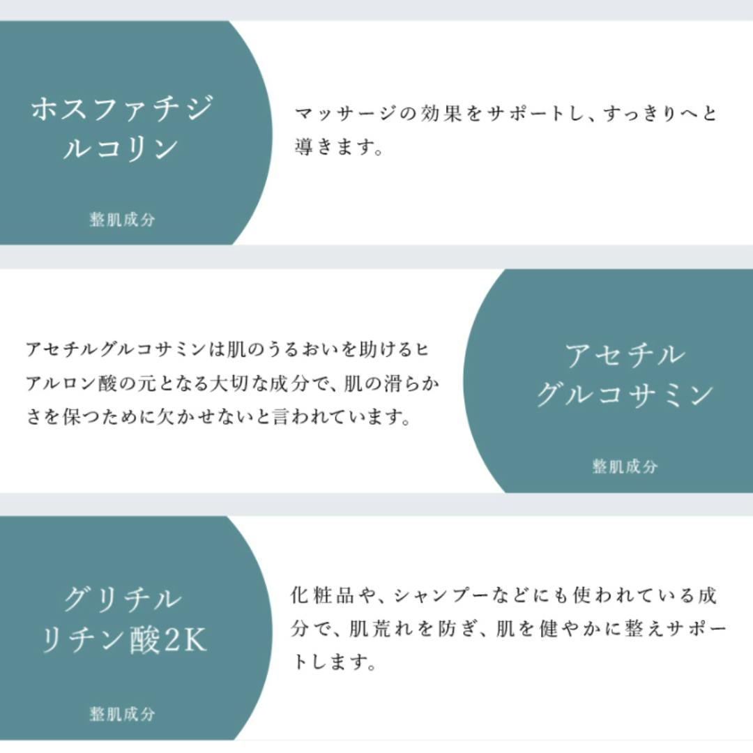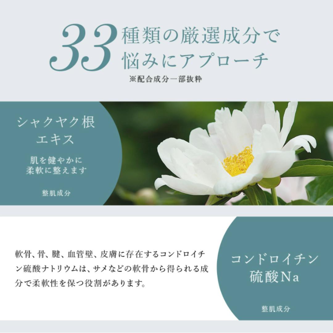 (全成分)水 、BG 、グリセリン 、1,2-ヘキサンジオール 、シクロヘキサン-1,4-ジカルボン酸ビスエトキシジグリコール 、メントール 、乳酸メンチル 、エタノール 、加水分解ローヤルゼリータンパク 、ニコチンアミドモノヌクレオチド 、チョウジつぼみ油 、ソルビトール発酵多糖 、水溶性プロテオグリカン 、アセチルグルコサミン 、コンドロイチン硫酸Na 、ジメチルスルホン 、アーチチョーク葉エキス 、ソメイヨシノ葉エキス 、オタネニンジン根エキス 、イチョウ葉エキス グリチルリチン酸2K 、シャクヤク根エキス 、ホスファチジルコリン 、オリーブ果実油 、水添レシチン 、ダイズステロール 、トコフェロール 、パルミチン酸エチルヘキシル 、ポリリシノレイン酸ポリグリセリル-6 、キサンタンガム 、カルボマー 、水酸化Na 、フェノキシエタノール