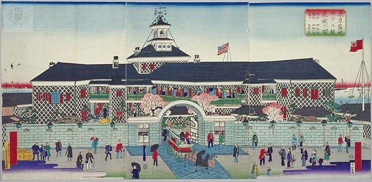 ▲築地ホテル 2階建て・部屋数102室・水洗トイレ・シャワー・バー・ビリヤード室 江戸で評判の建物となって黒山のように見物人が押し掛け、百種類以上の錦絵が飛ぶように売れました 錦絵:3代目広重画 東善寺蔵