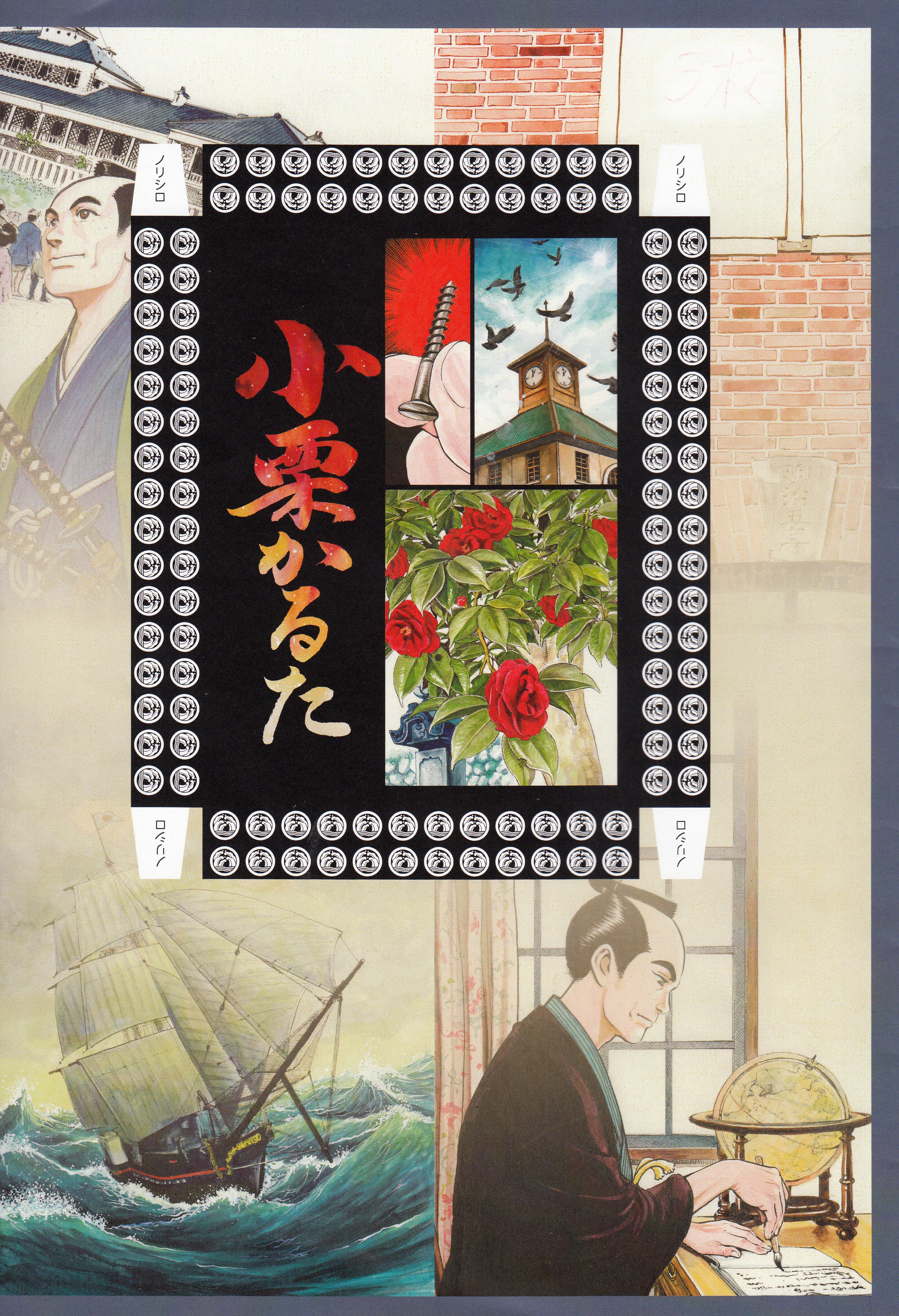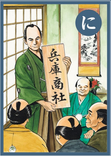 ▲兵庫商社 小栗かるた「に 日本初 株式会社 兵庫商社」・絵木村直己会社「兵庫商社」を1867慶応三年に立ち上げました。大坂中之島に事務所をおいて活動を開始するも、幕府解散・明治維新となり不馴れな運営もあって半年後に解散しています。