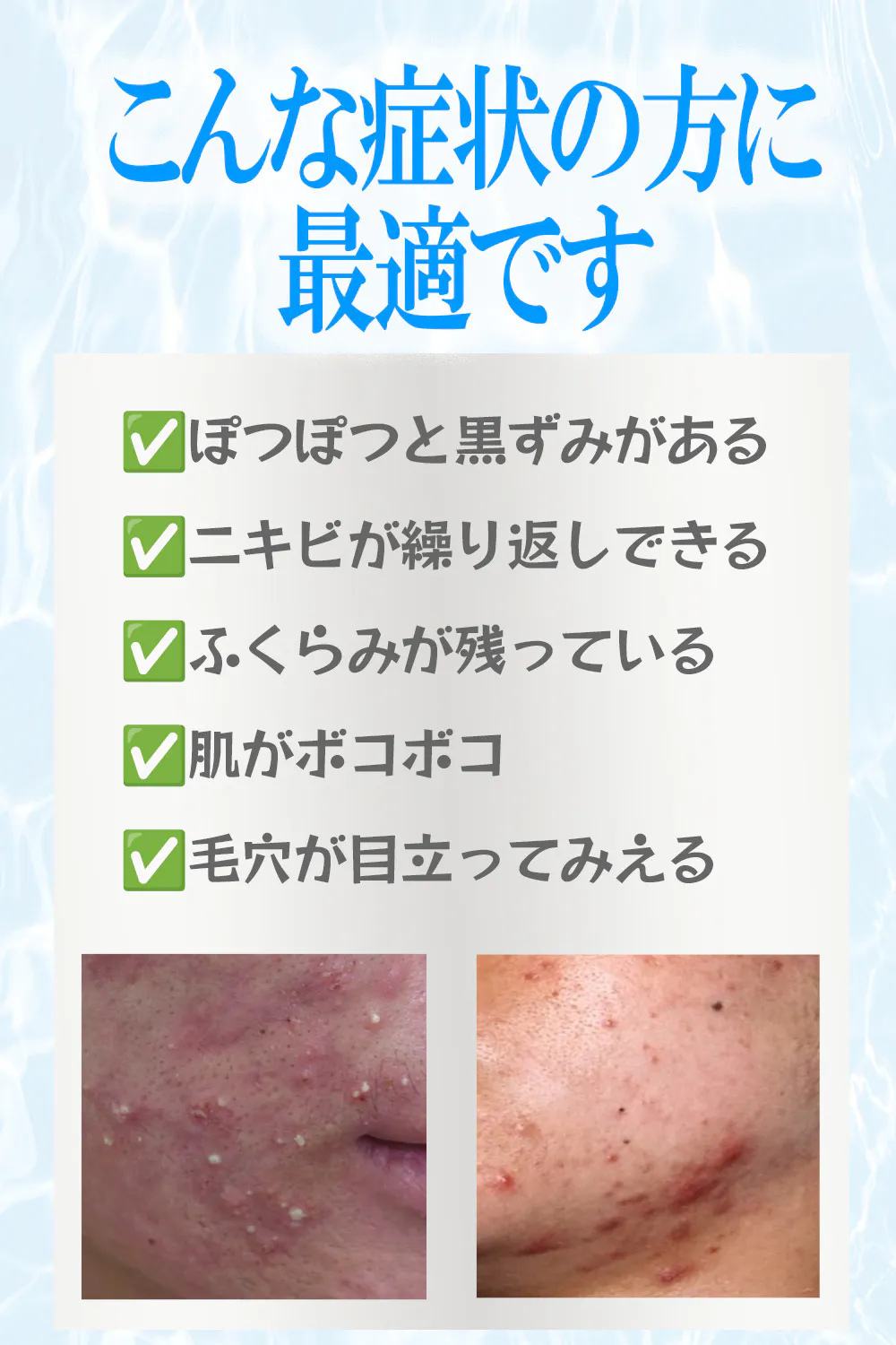 肌の負担にならないようにできるだけ多くの水(化粧水)を肌に塗布してください。顔全般アクネ菌の気になる箇所でお使いください。超音波振動でニキビ跡にもアプローチ