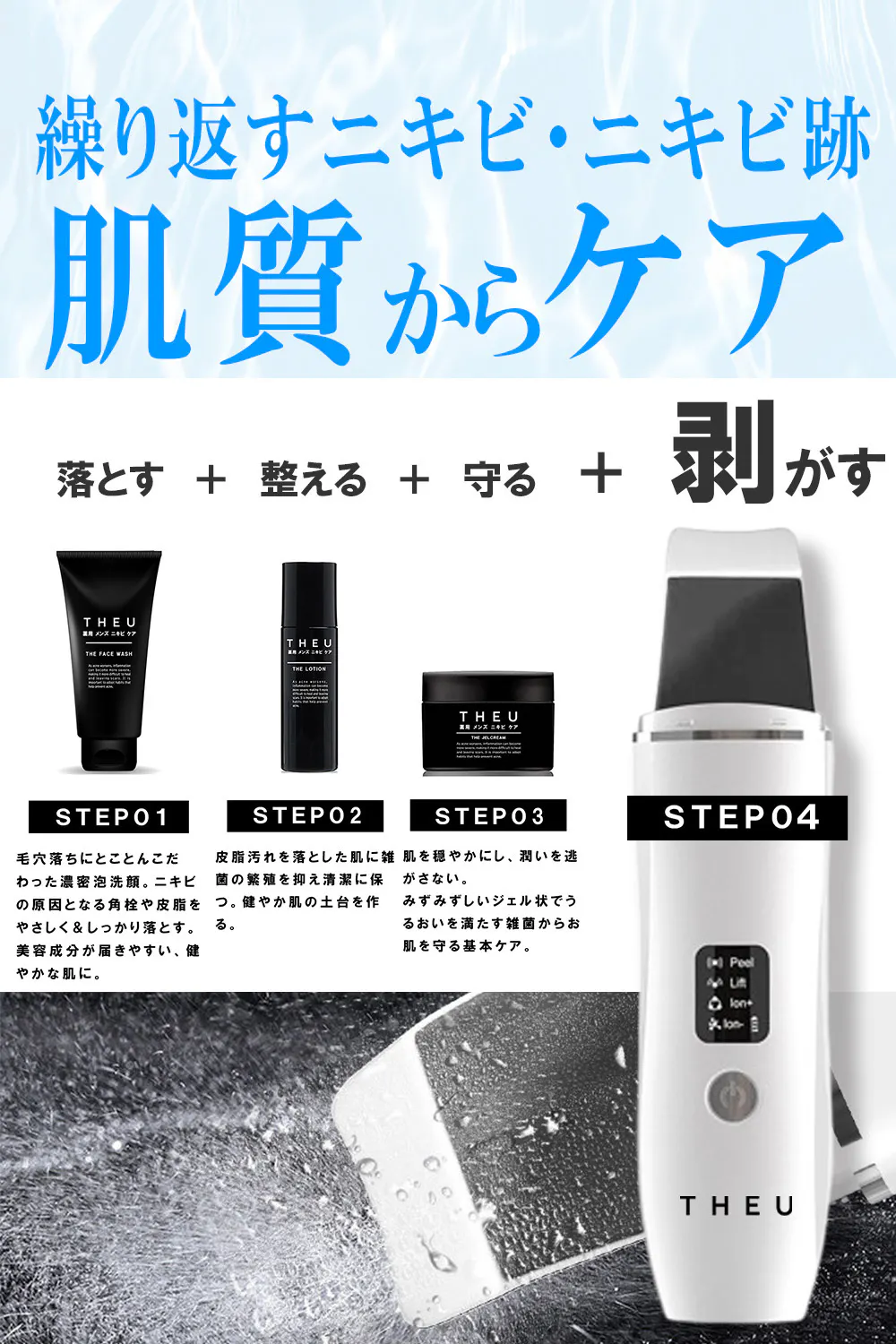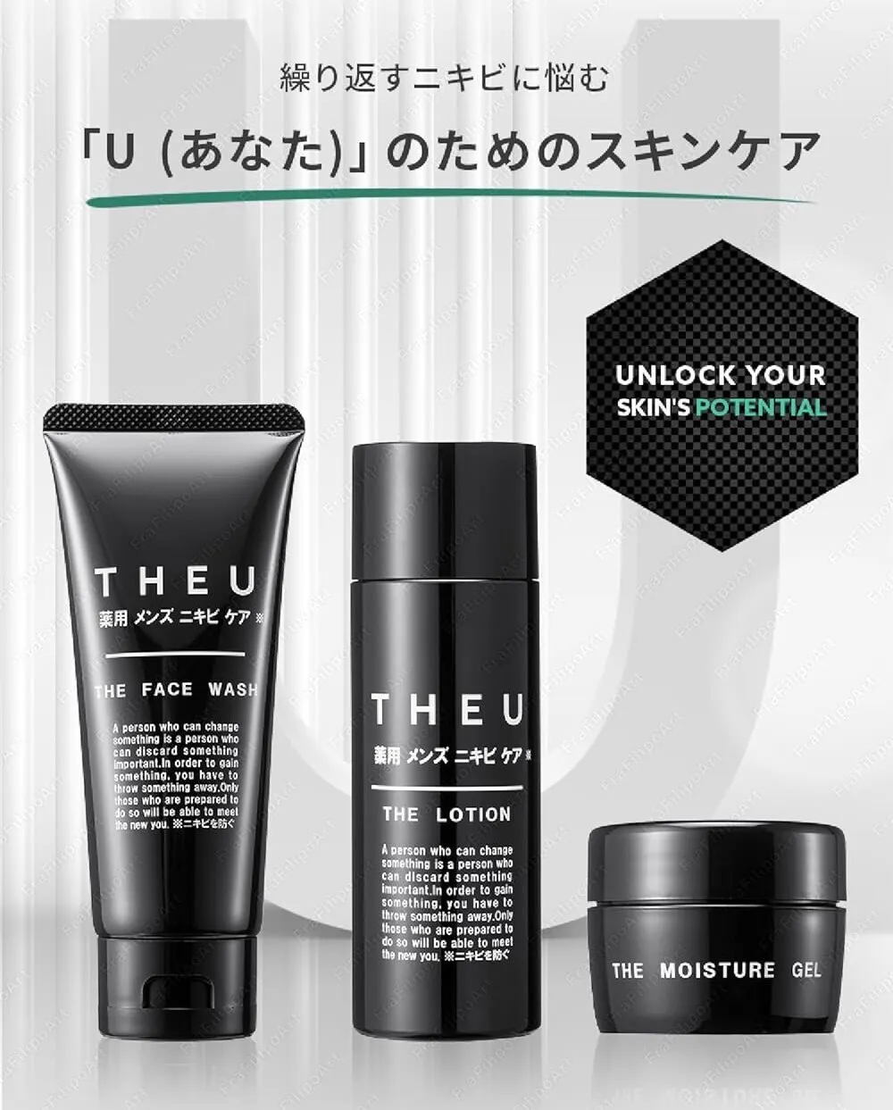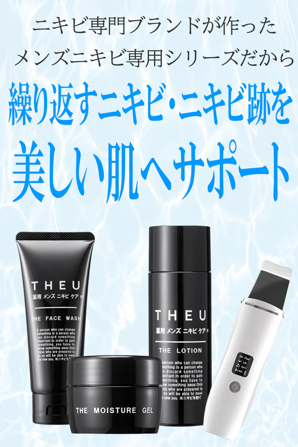 薬用メンズニキビケア THEU は、「自分が好き」と言えるために、不要なものは入れず、本当に必要な成分を必要な配合比率で「このシリーズを使っていれば間違いない」、と思えるラインをそろえました。