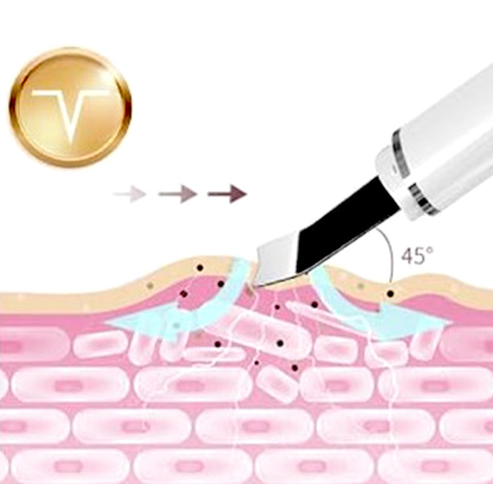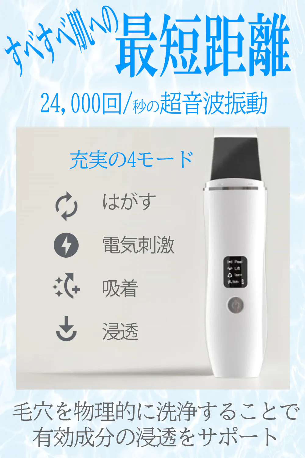 1.Peel: 24,000回/秒の超音波振動で毛穴に詰まった汚れや黒ずみ、古い角質を落とし、きめの細かいすべすべ肌に整えます。