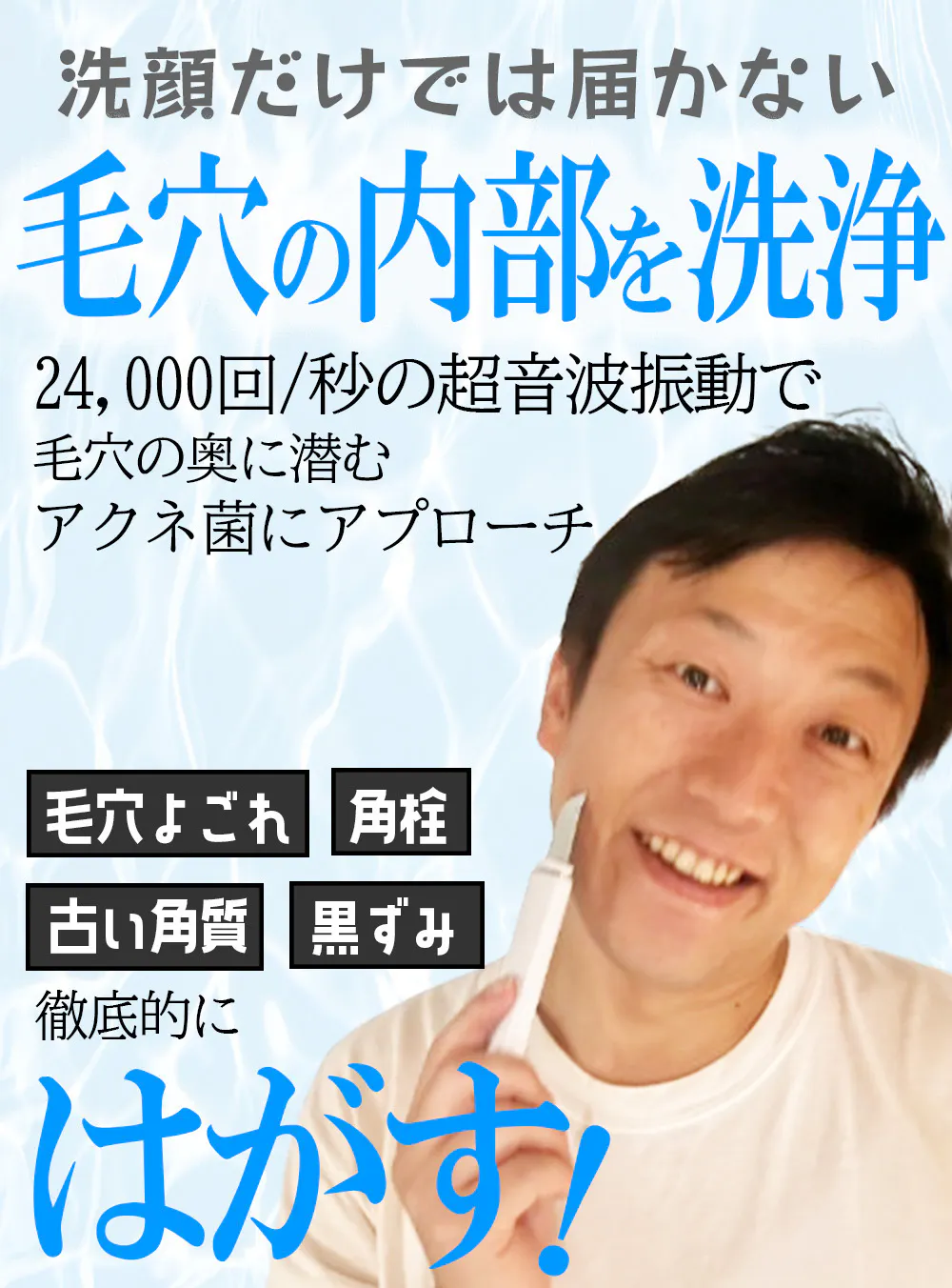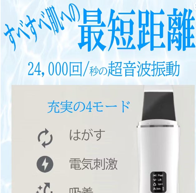 24,000回/秒の振動の力で毛穴に詰まった汚れや黒ずみ、角栓、古い角質などを落とします。古い角質を取り除くことで、きめの細かいすべすべ肌に。お肌のターンオーバーをサポートしニキビ跡にもアプローチ