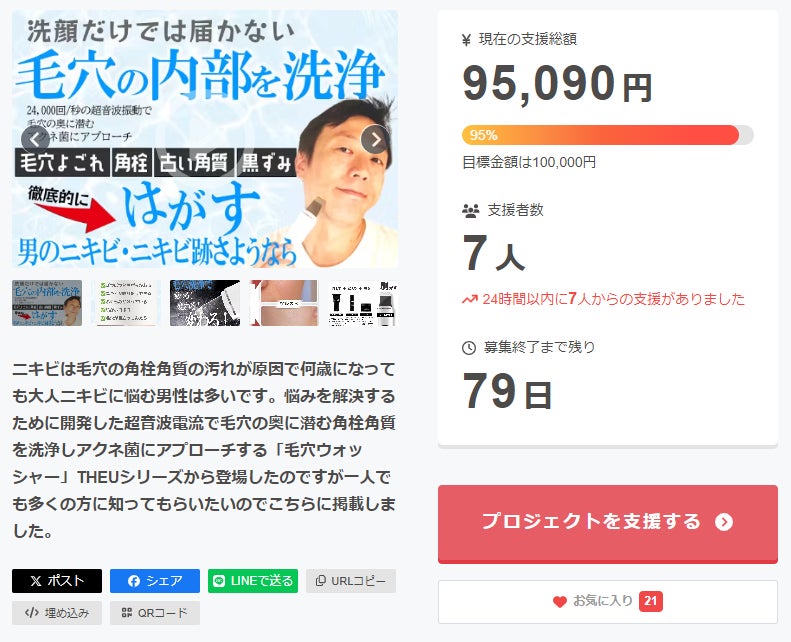 2024/09/19 22:57たった今目標達成しました!ありがとうございます!!(^^)!ニキビ治したい人、ニキビ跡をなおしたい人には本当に効く「毛穴ウォッシャー」なのですが、やっぱりニキビに悩んでる大人ってあまりいないのかな~ と思ってた矢先に目標達成しました。目標達成まで10時間強かかりましたが感動しました( ;∀;)ご支援頂いた方々、本当にありがとうございました。慎んで御礼申し上げます。ちなみに美肌にだけ興味ある人にも有効なのはここだけの話です。すべすべへの最短距離なのです。引き続き宜しくお願いします。広報担当 平一平(たいらいっぺい) もっと見る