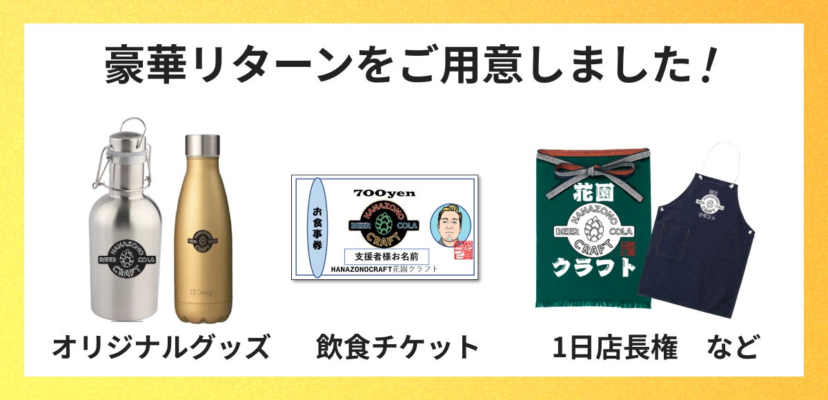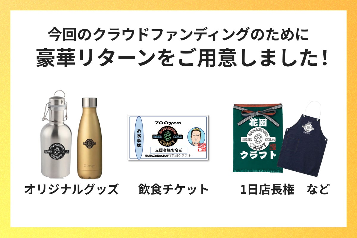 花園クラフトプレオープンを記念して作られたオリジナルグッズや、店舗で使える飲食チケット、ビールの設計・醸造体験など特別体験コースもご用意しました。詳しくはリターン詳細をご確認くださいませ。
