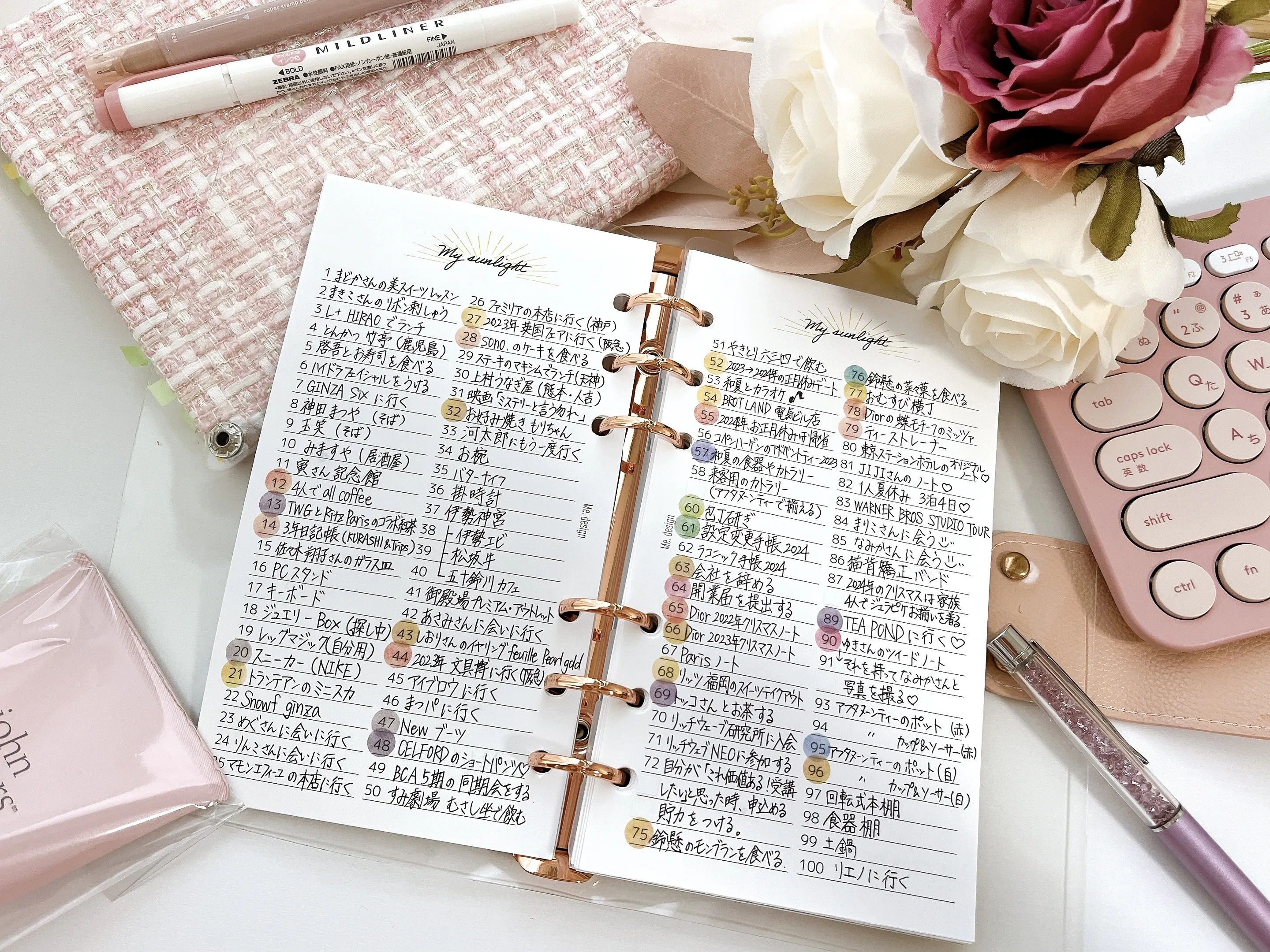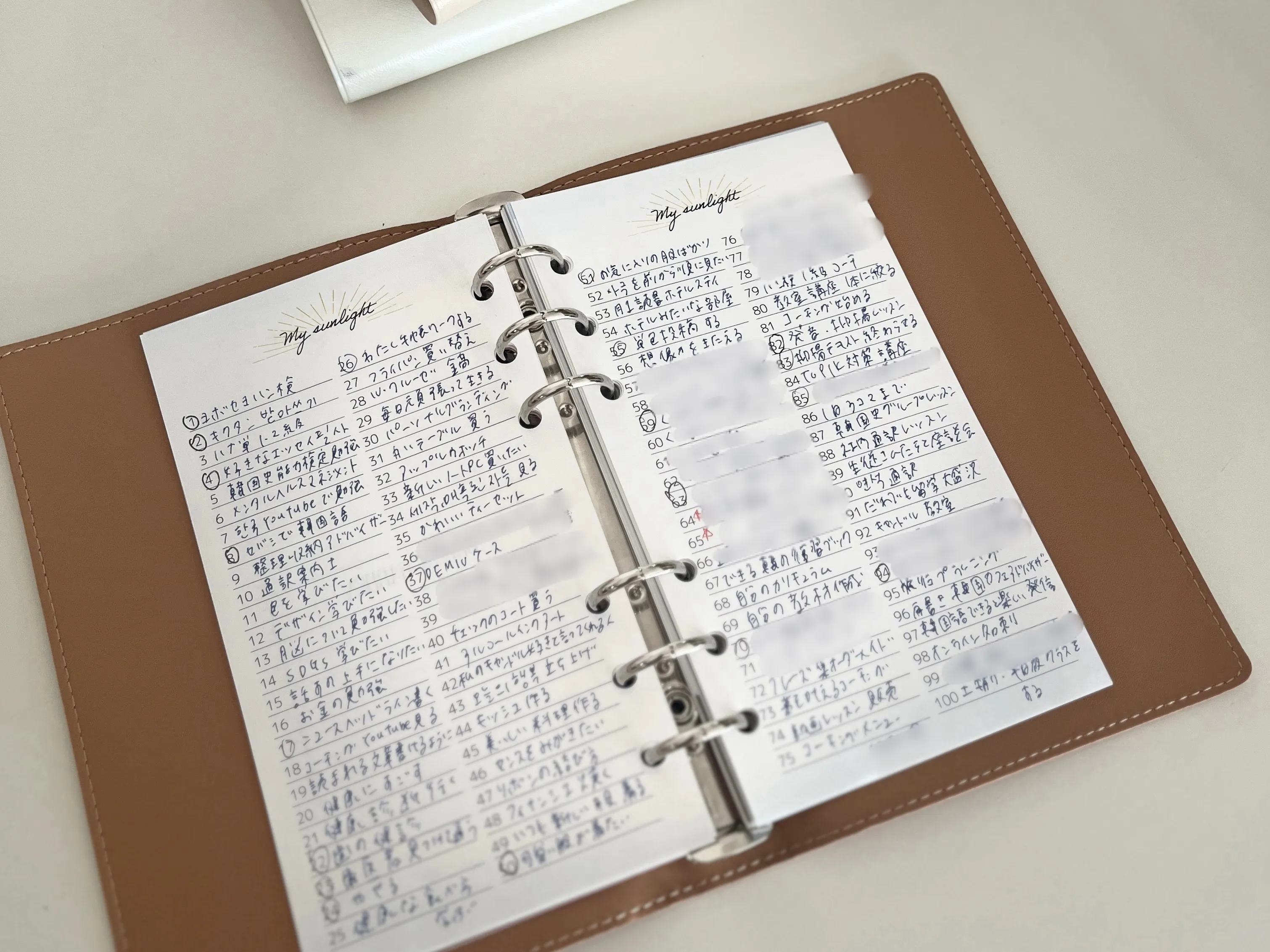 いちばん使い込んでいるページは光のリストで、やりたいことをたくさん書き込んでいます。達成したらマルをつけています♡手帳1DAYレッスンを受けたときに、「書いたことはすべて叶う」と言ってもらったことを、光のリストの前のページに書いて、たまに見返しています!