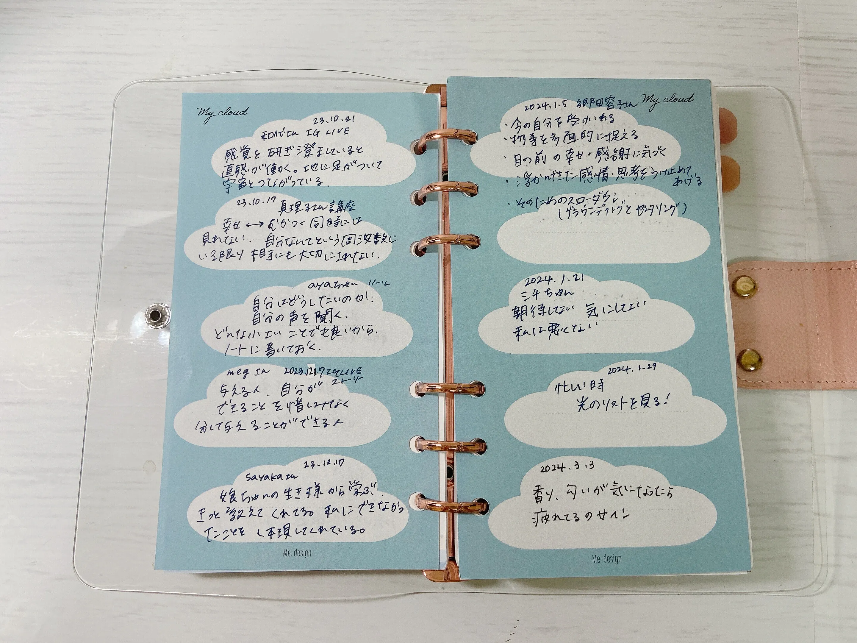 雲のページは、「疲れた」「しんどい」と思ったらここを見る!と決めています。見ると、気持ちが沈みすぎず、元気の素がつまっている!という安心感があります^^ 印象に残った言葉を書いていく中で、誰が言ったかも一緒に残すようにしています。そうすると、自分の周りにはこんなにも素敵な人がいる!と感じることができて、幸せだなぁと思えるんですよね^^