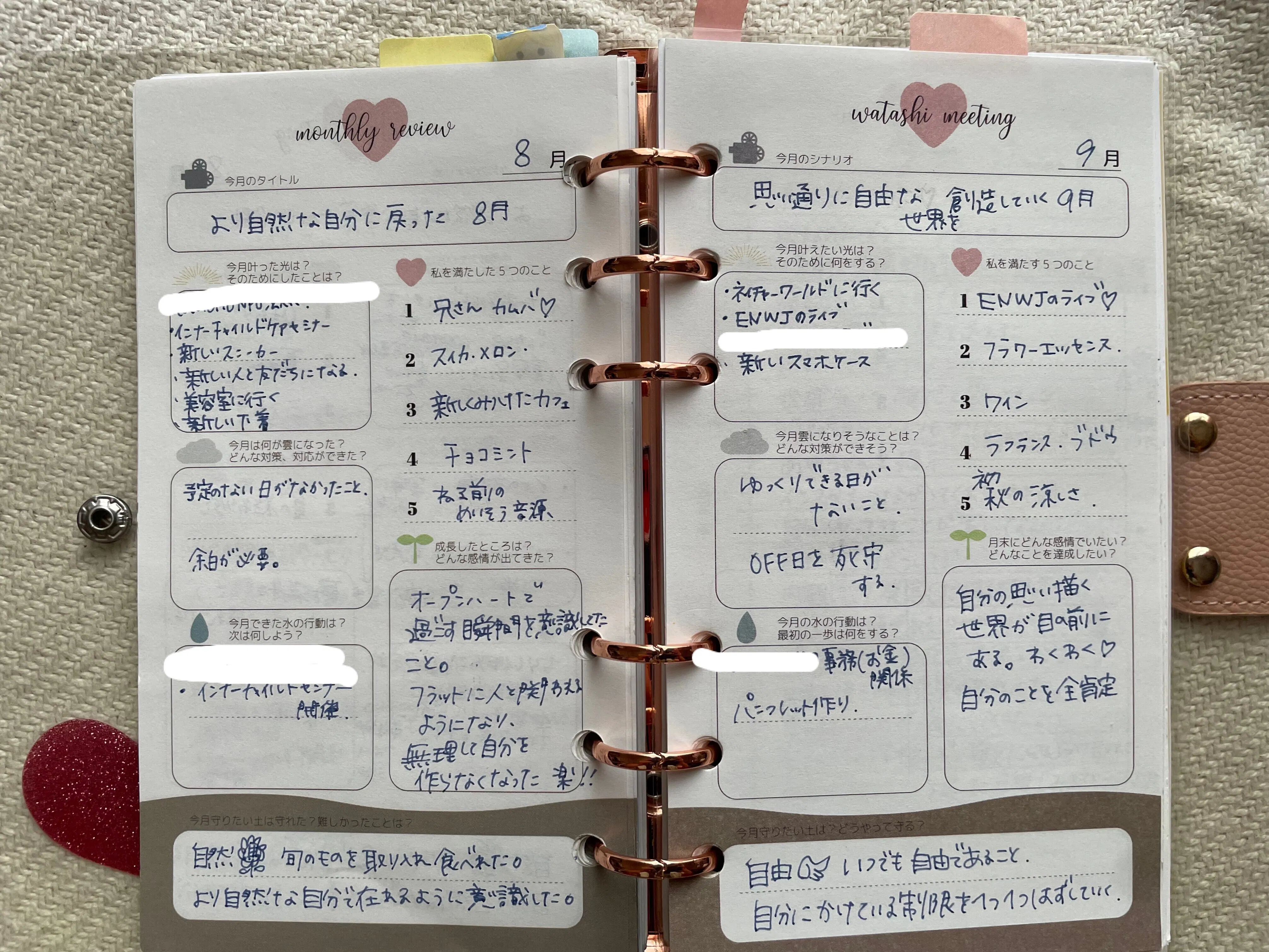 そんな経験から自己受容感・自己肯定感の大切さを感じ、どんな私も認めること、自分の人生にフォーカスを当てること、今あるものに感謝をすることなど、『自分の心とまっすぐ向き合う』ことを、大好きな【手帳】というアイテムを使って始めたのが、わたし手帳のはじまりです。