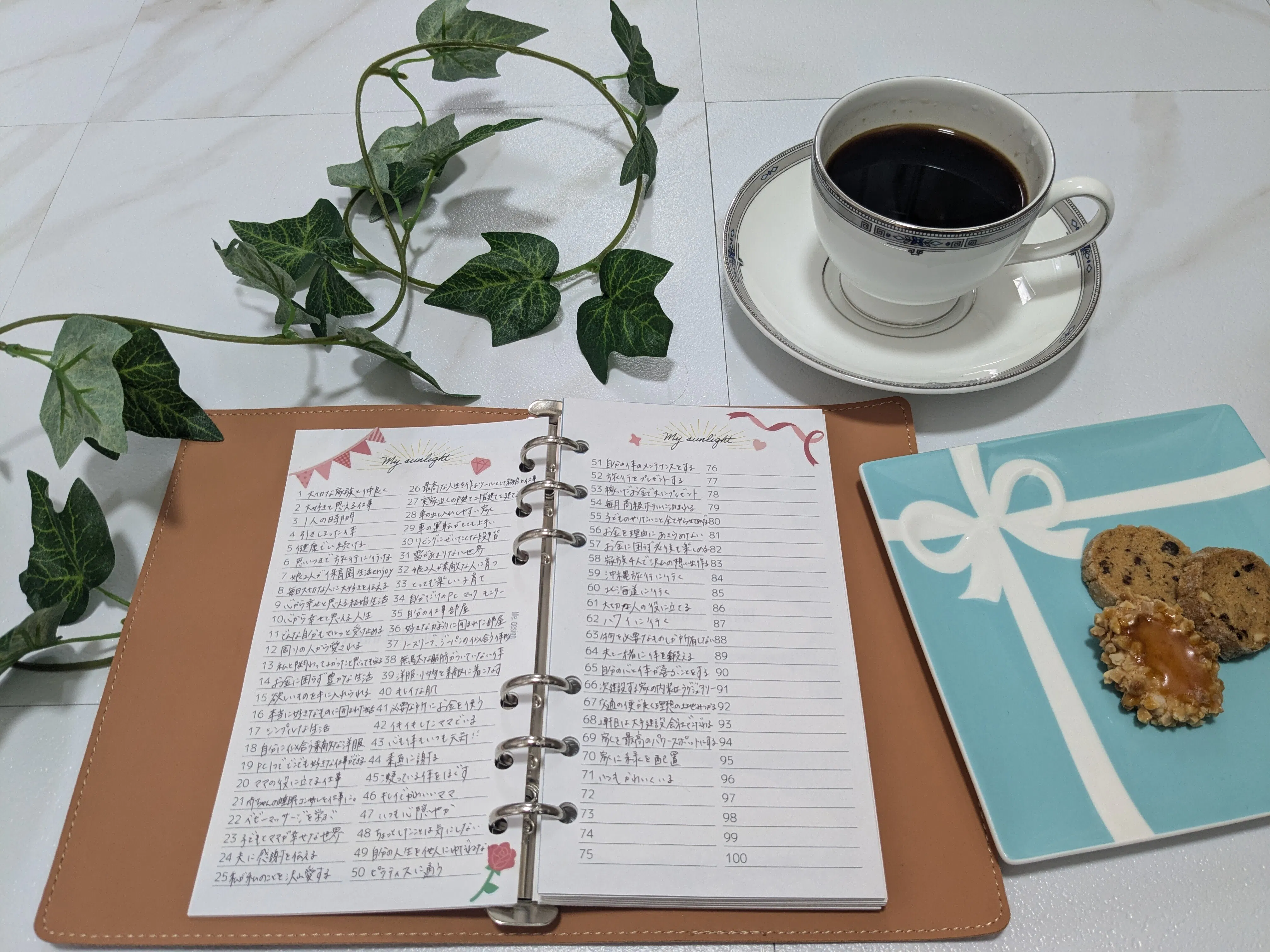 毎朝自分一人の時間に、大きいものから小さいことまで心から望んでいることを書いています。今まで書いたもの、今日書き足したものを読みながら、毎朝ワクワクした気持ちで1日をスタートしています。書いたものの中に、気づいたらかなっているものもあって、理想の未来の自分を想像して書き込み、ワクワクした気持ちで過ごすことが、理想の未来を叶えるポイントなのかなぁと感じています!