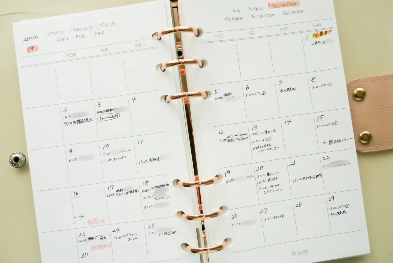 月間ページはスケジュール管理に使っています。最初は日付がないのがやりにくいかなと思っていたのですが、実際に使ってみると自分好みにアレンジしやすく、また、予定がたくさんあっても書き込みスペースに余裕があるので使いやすいです!