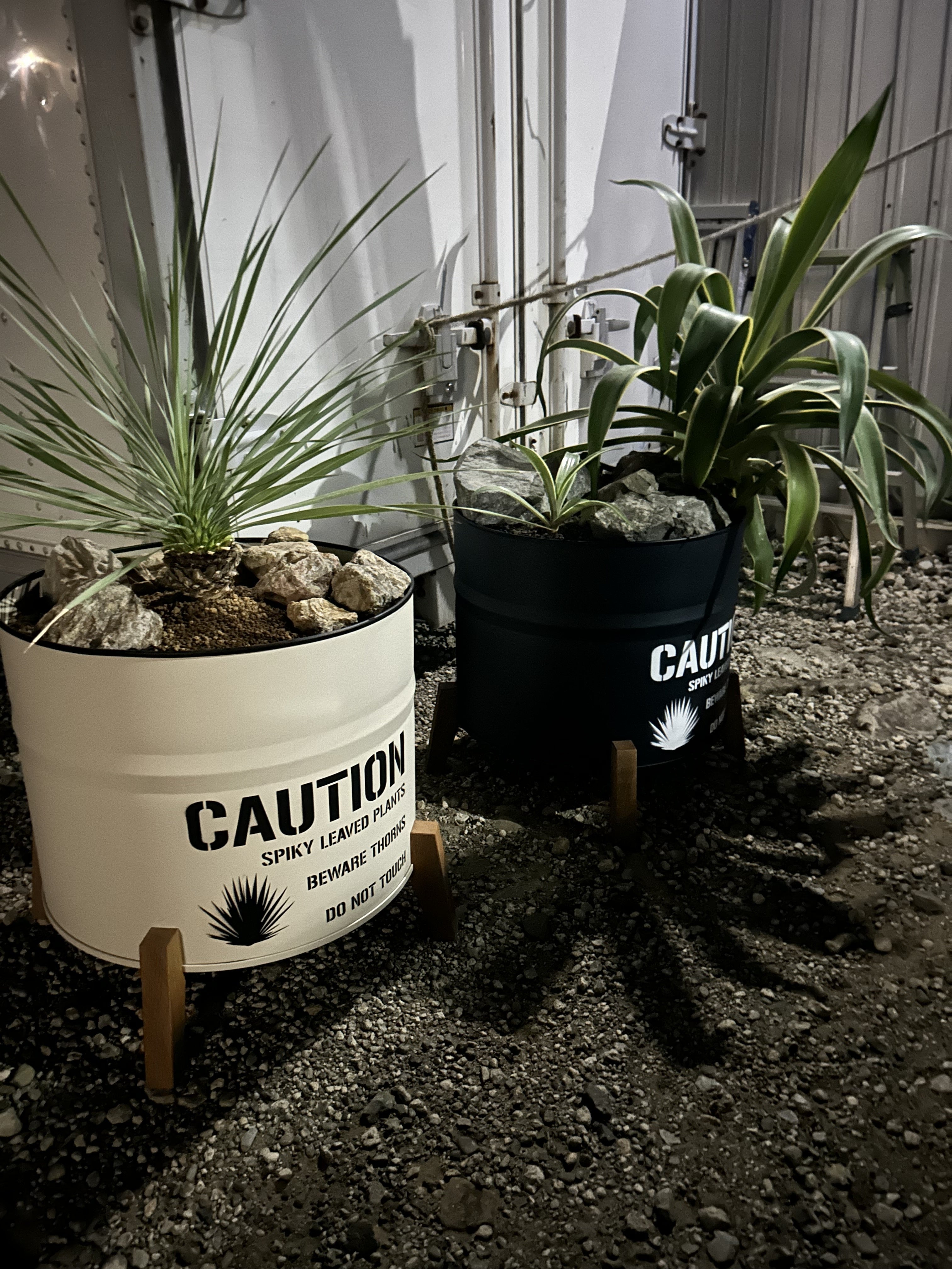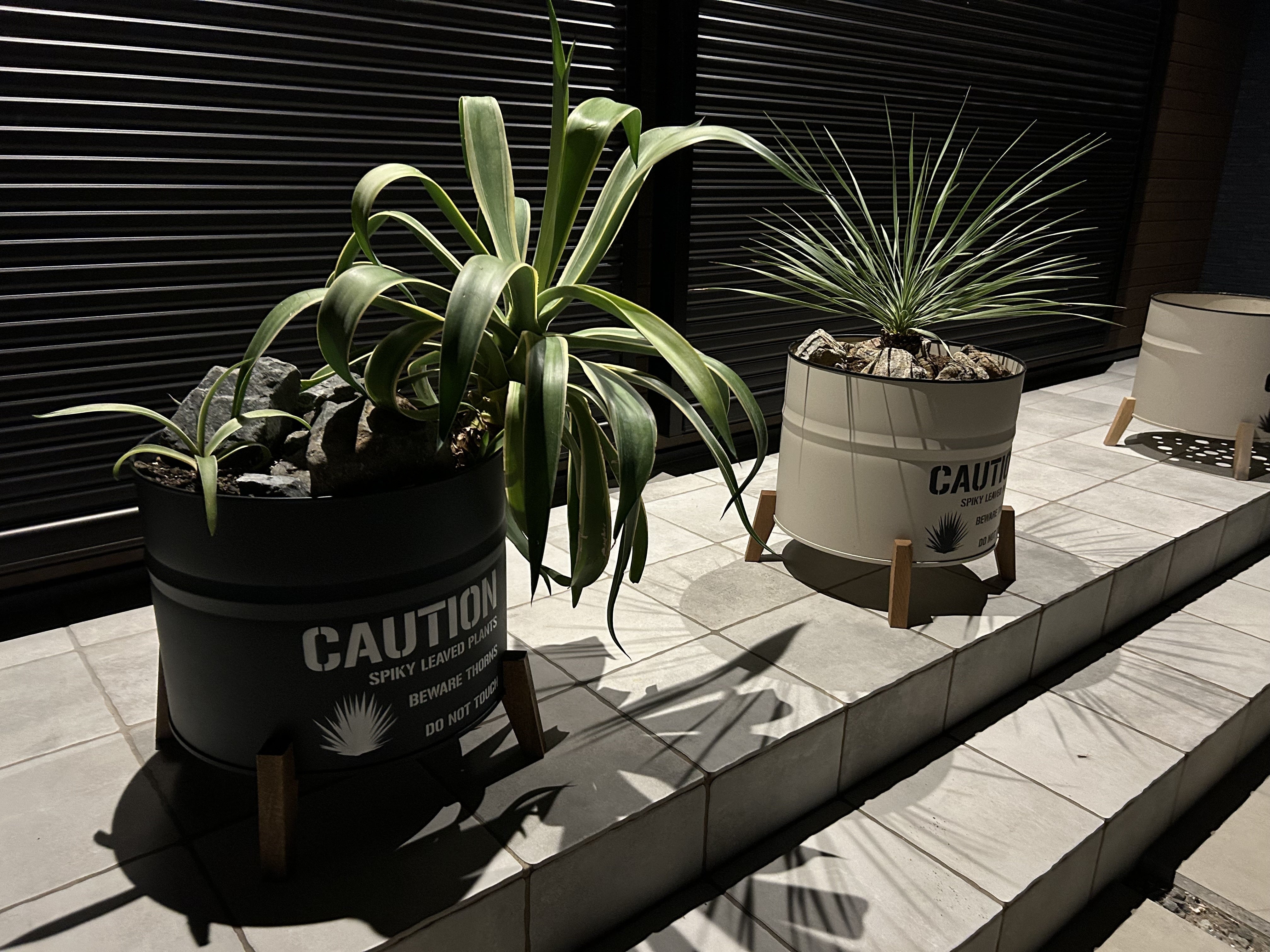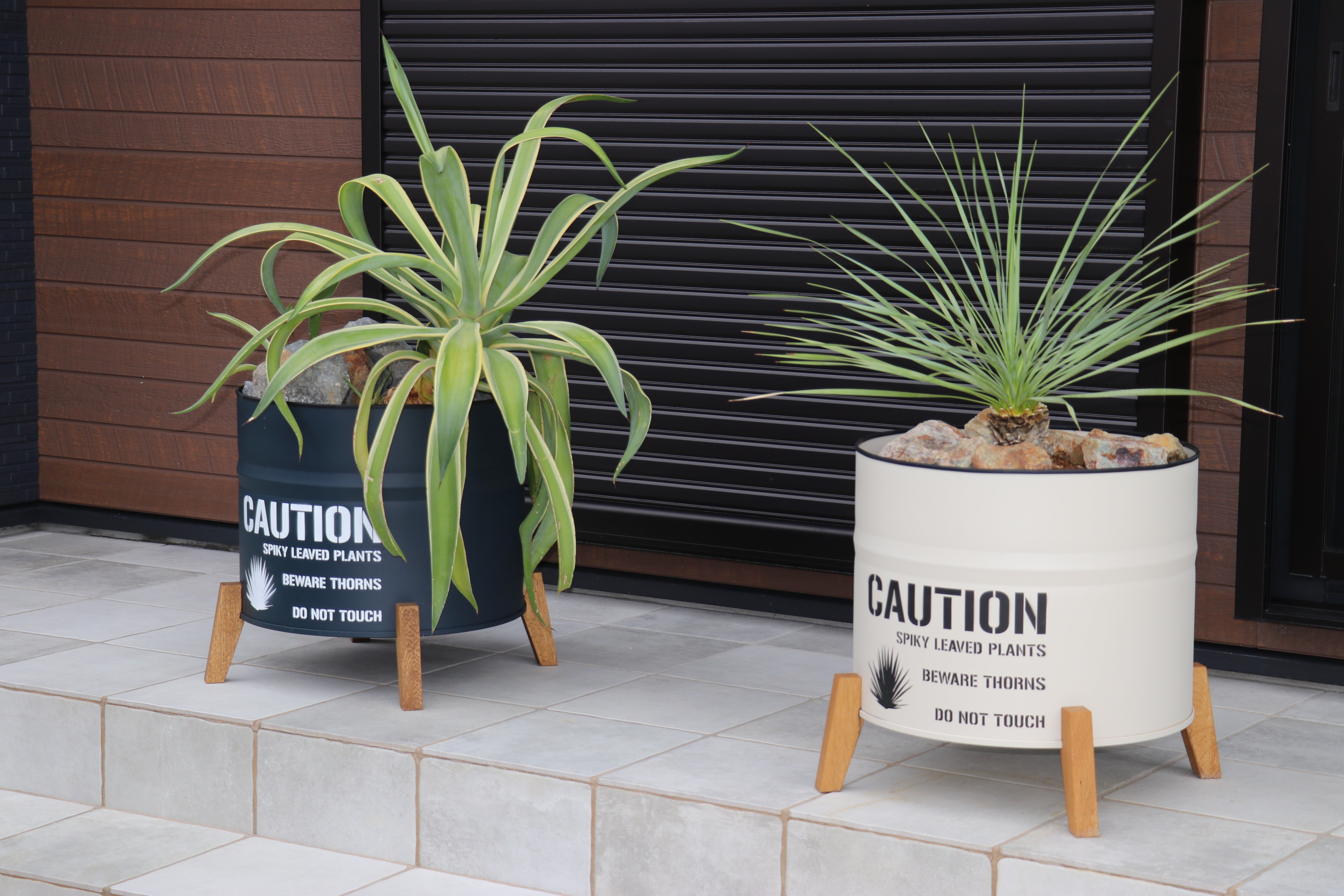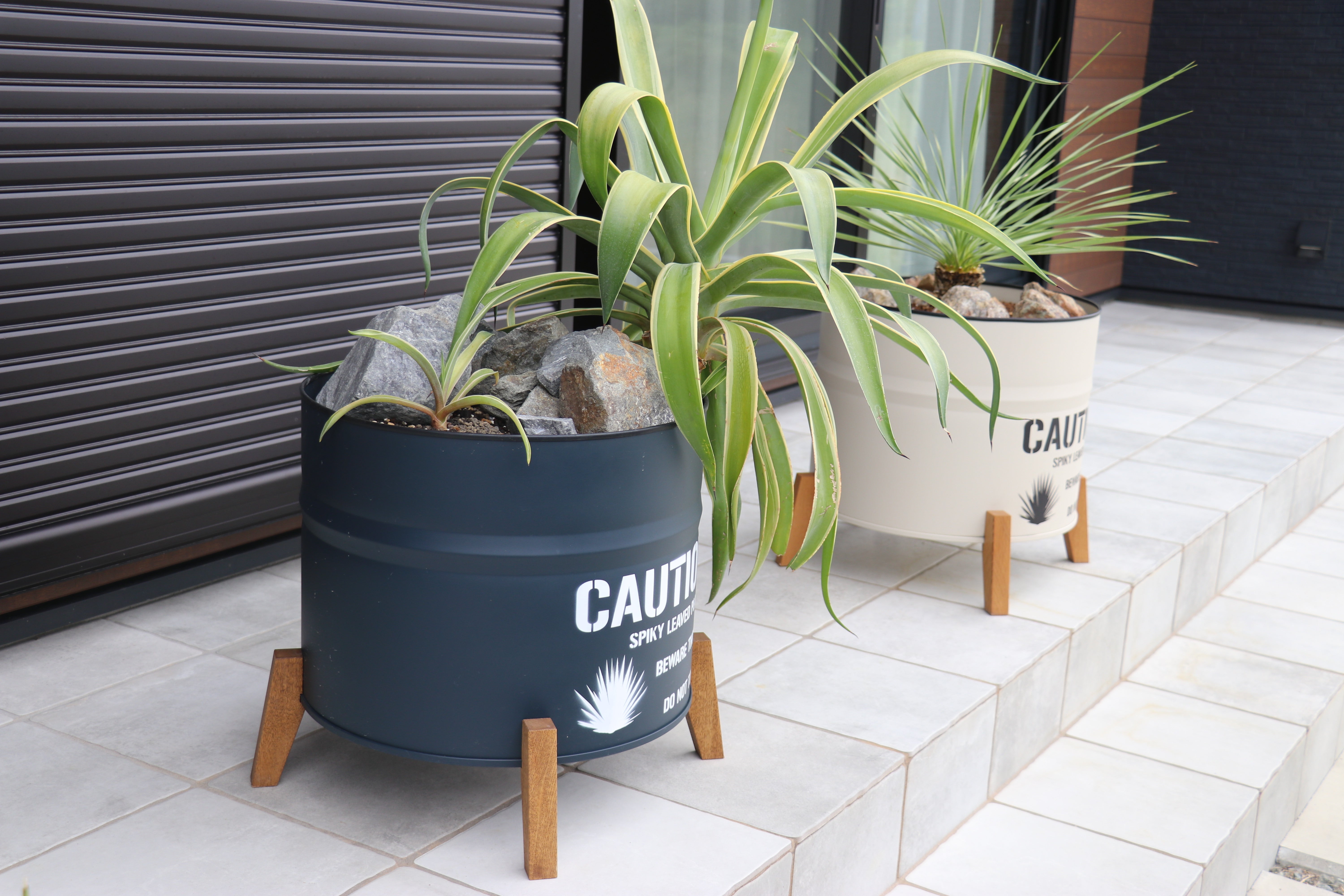 植えていただいた植物は、ネイビーがアガベ・ベネズエラ 黒っぽい石をゴロゴロおいてロックガーデンな雰囲気に ベージュがユッカ・ロストラータ こちらはブラウン系の石を置きオーストラリアチックに