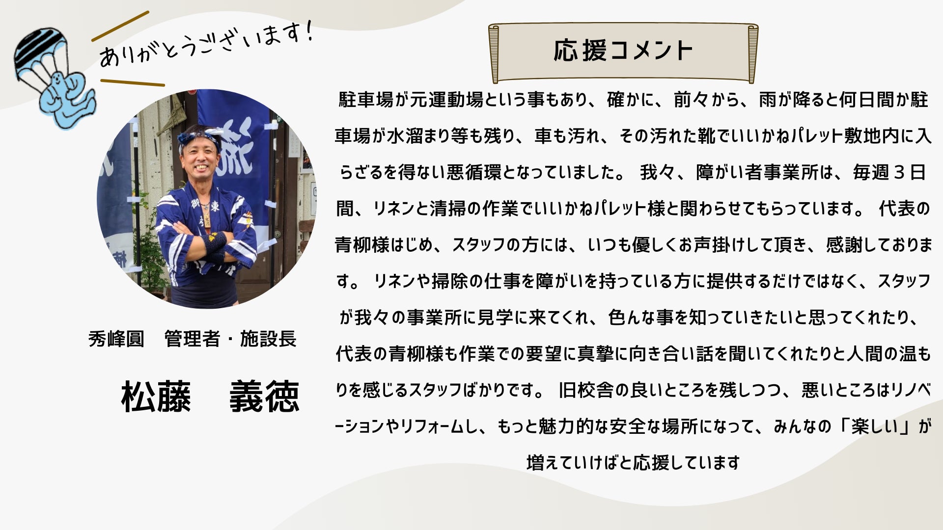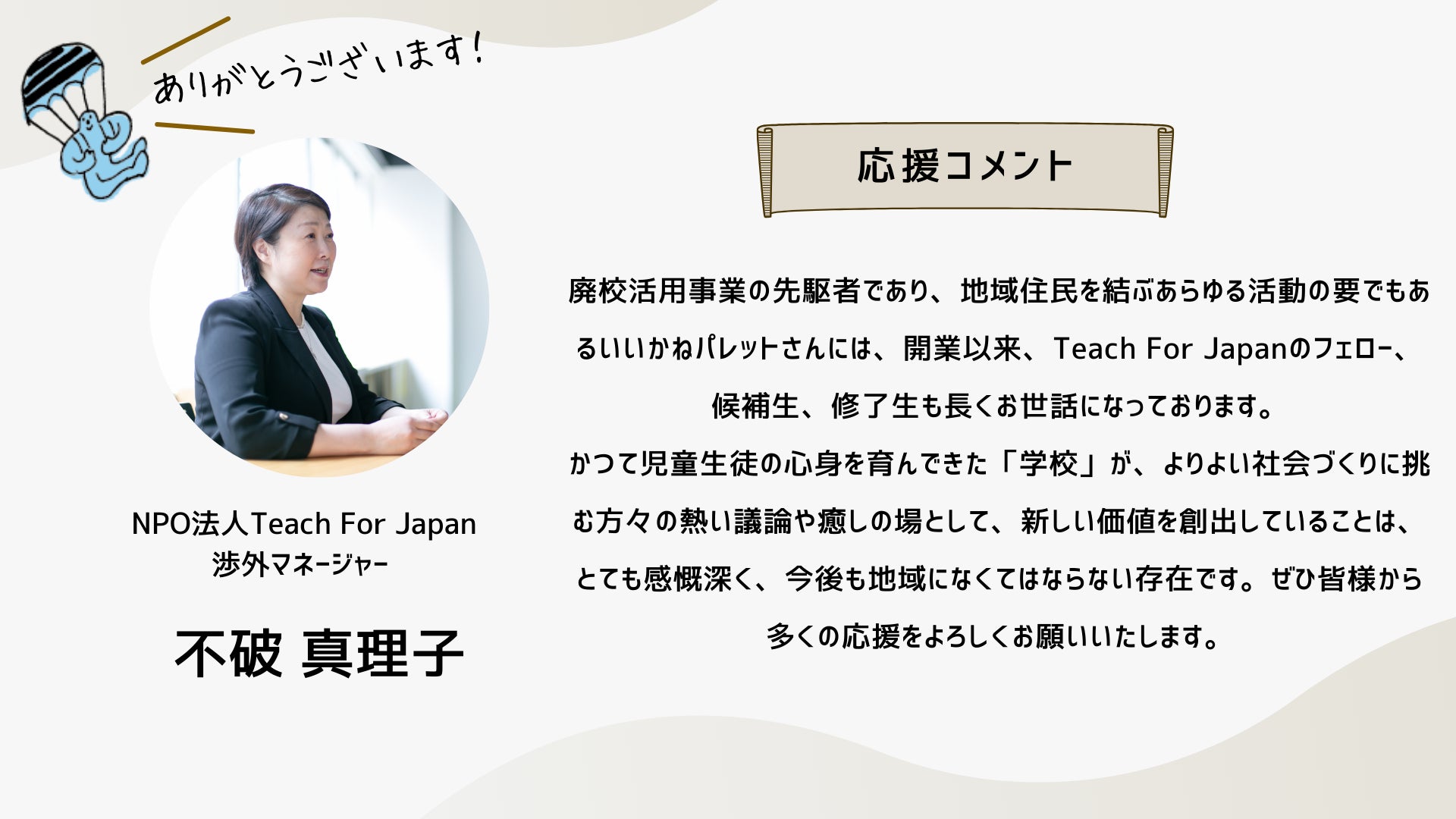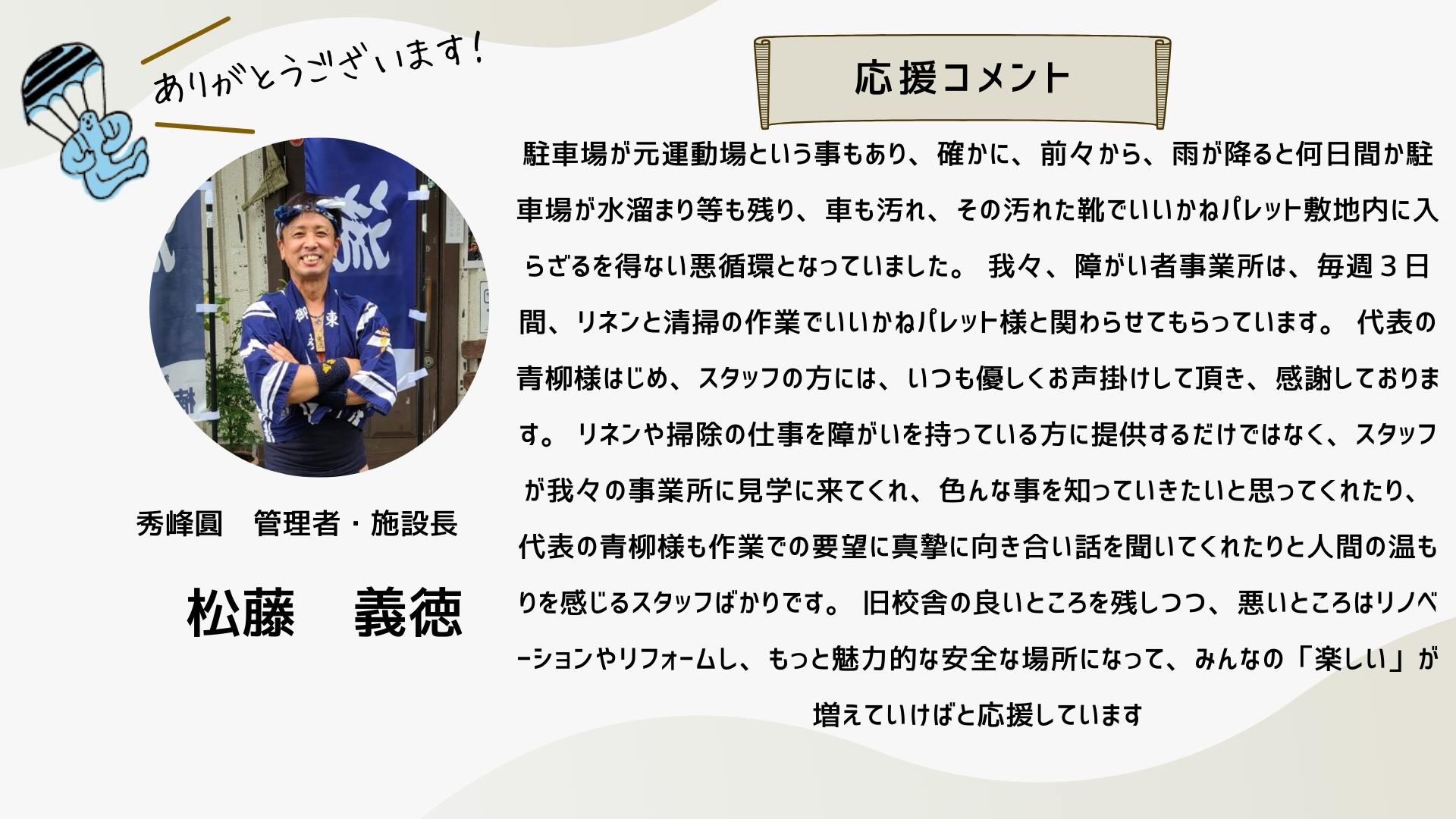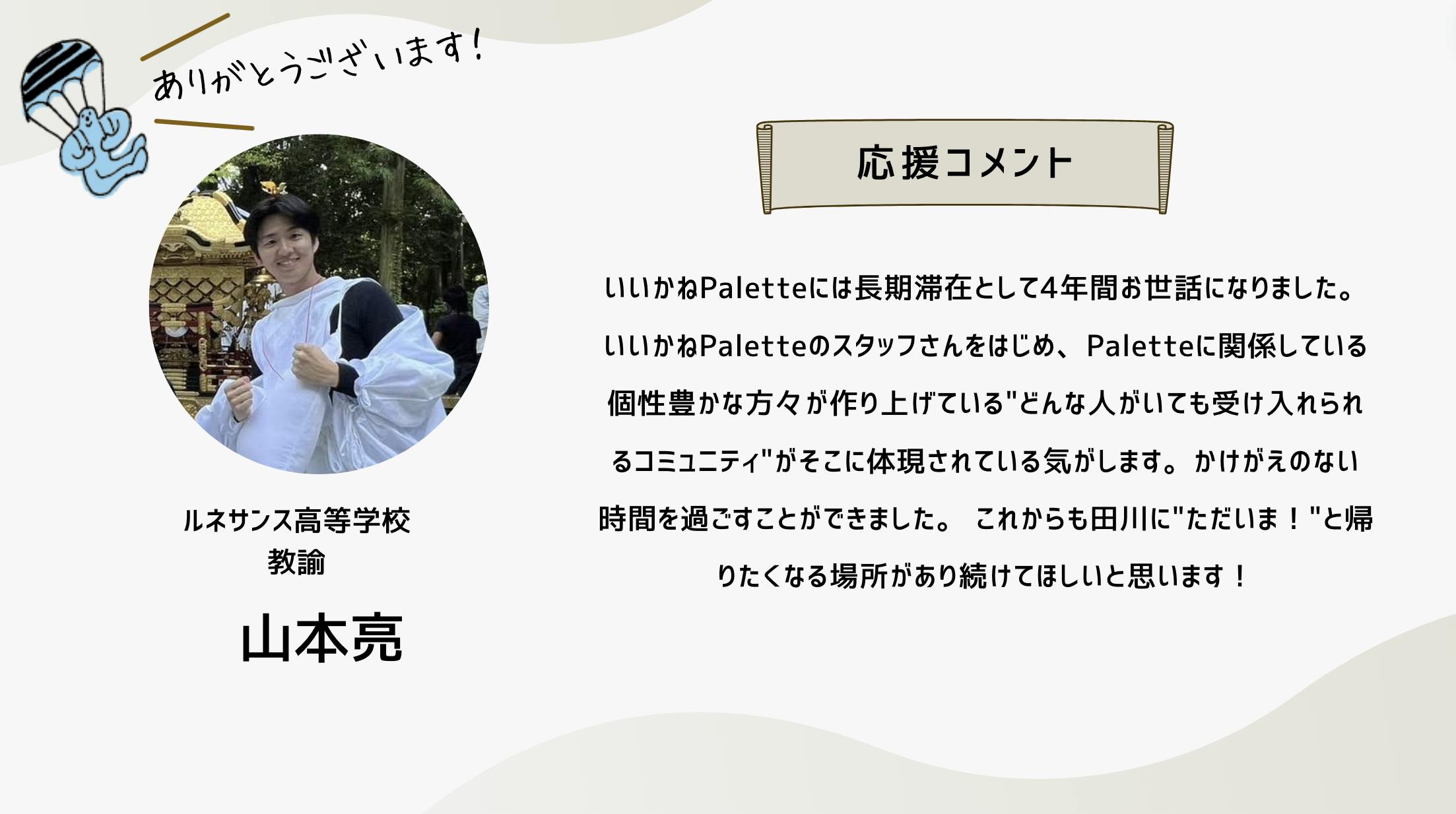 このクラファンは、もはやひとつの「活動」ではなく、「ムーブメント」のフェーズに来ていると思っています。この運動の輪が広がり、いいかねPaletteのような場所がもっともっと社会に増えていくために。どうか引き続きお力添えのほど何卒よろしくお願いいたします。