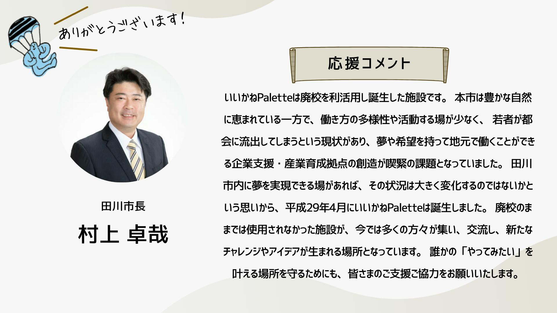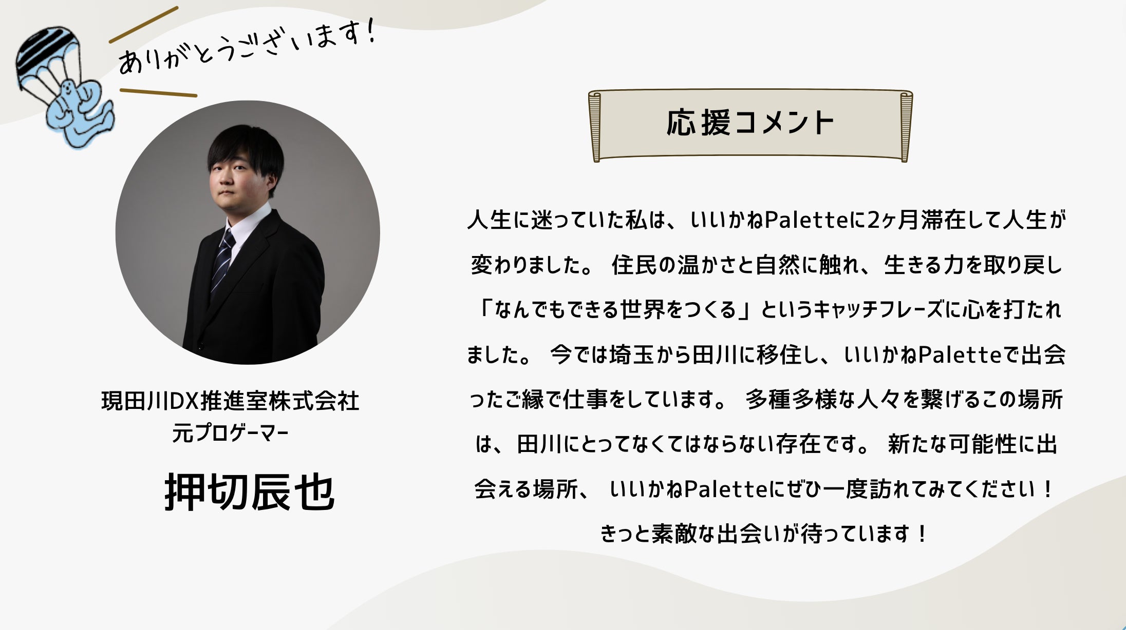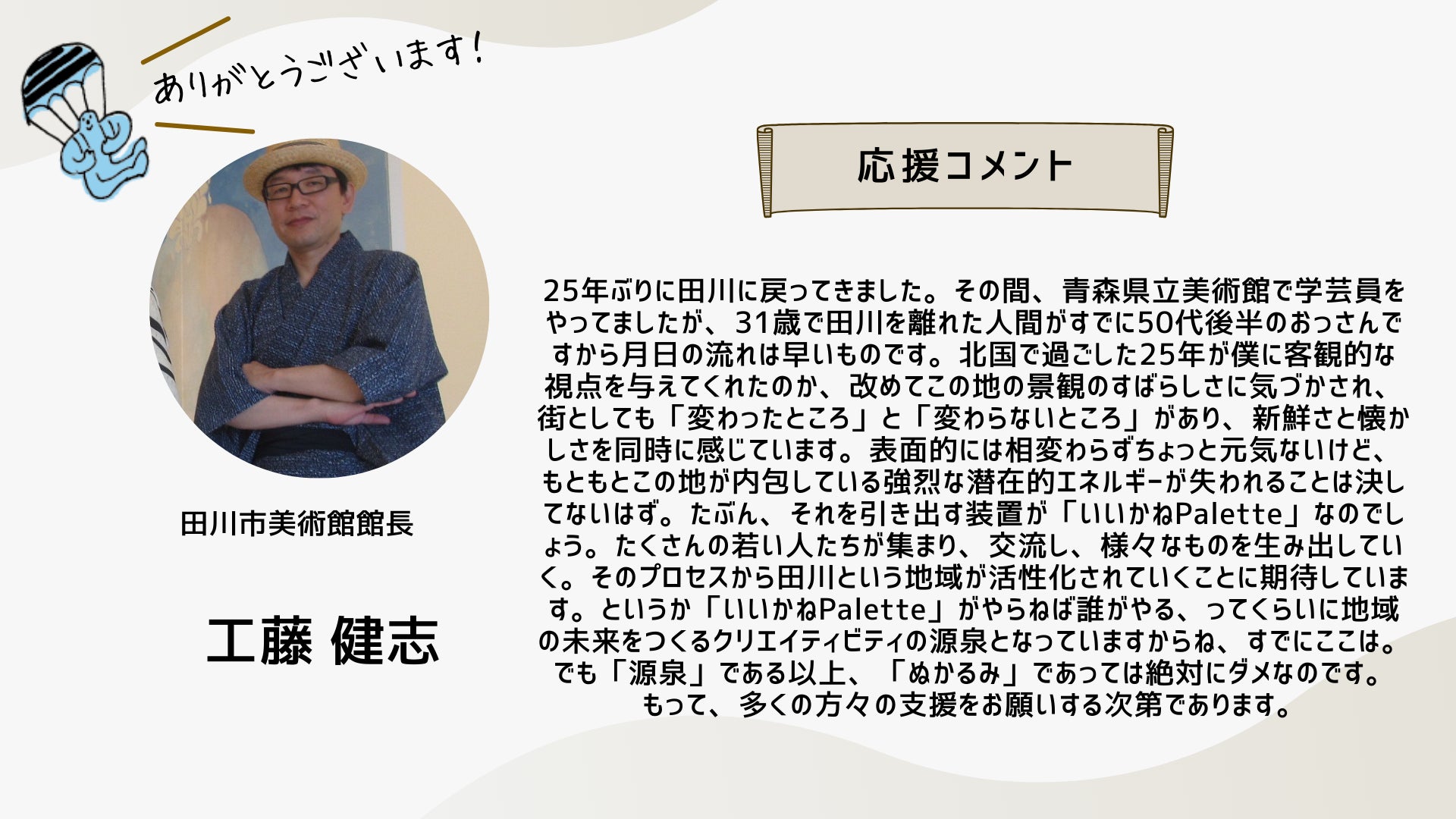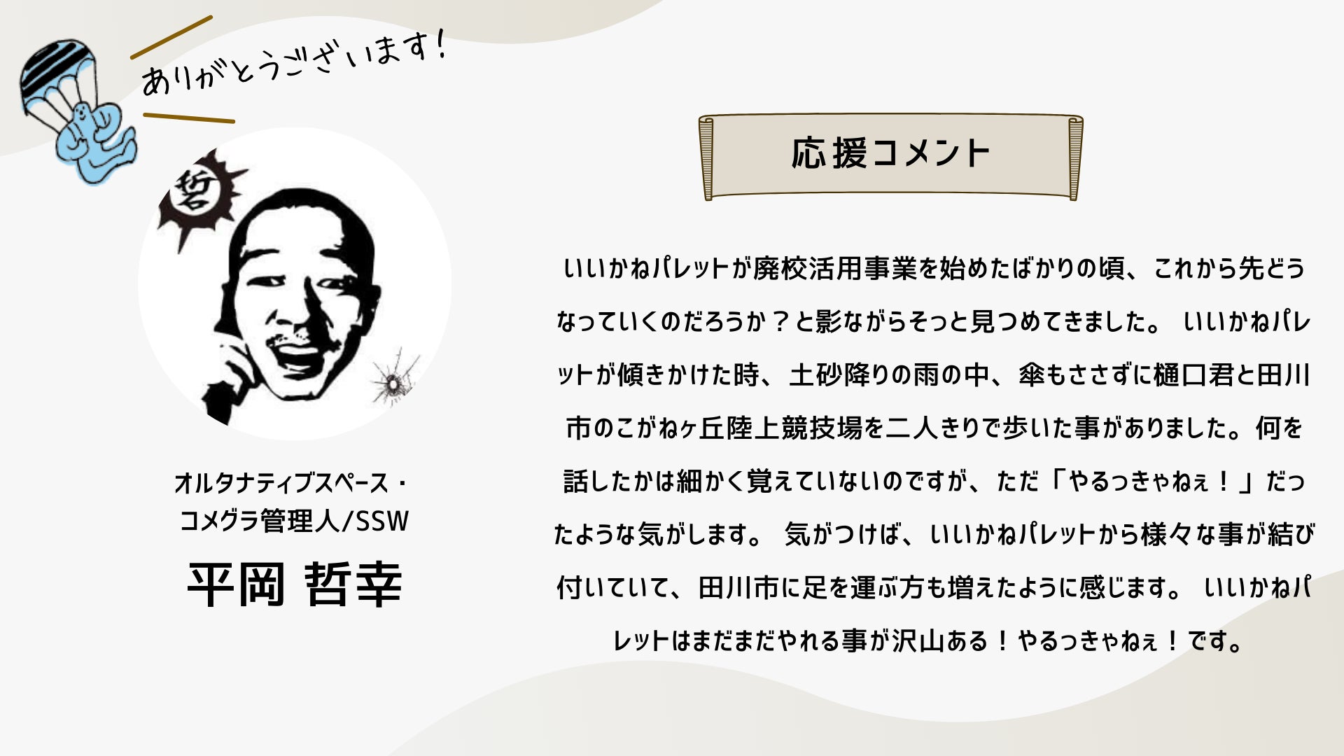 2024/10/13 19:10こんにちは、いつも応援ありがとうございます!クラウドファンディング終了まで1日となりました。明日は、このイベント「いいかねPaletteクラファン大感謝祭!」です!是非ご参加ください!お申し込みはこちらから!そして、配信はこちらです!是非、御覧ください!新しい「いいかねPalette」で・・・先日、樋口会長とITeens Lab代表の古林さんがパーソナリティをつとめるラジオ「新型オトナウィルス」において『いいかねPalette好きっすよ』というテーマでお話をされていました。「普通、こんな財務状況だと、こんなに楽しそうにできないですよ」番組の中で、樋口会長は、いいかねPaletteを運営する㈱BOOKの顧問会計士の方からそう言われたエピソードを話していました。確かに、いいかねPaletteの樋口会長、青柳代表をはじめとするスタッフたちはみんな楽しそうに働いています。昨年度、777万円の赤字を出した時も、青柳社長は出会って3秒でお客様とハグをしていましたし、スタッフたちの表情も明るかったはずです。おそらく、いいかねPaletteに実際に来て頂いたお客様はこう感じて頂けると思います。「いいかねPaletteは良いところだ」本当にありがたいことですが、スタッフたちは、樋口会長と青柳社長から「明るく働こう」「元気を出そう」「良い施設だと思われよう」そんなことを言われたわけではありません。スタッフたちは二人の背中を見ながら、一緒に空気を吸って、一緒に話をしながら、一緒に時間を過ごすことで、明るく、楽しく、いつも新しい何かにチャレンジしながら働いてくれている気がします。いいかねPaletteで働くスタッフと株式会社BOOKが契約をしたり、労働条件を通知したりする際、服務に関する様々な事項の中に、太字でこのような文章があります。・いいかねPaletteに関わる人たちを応援し、やりたいことを支援する ・あの手この手で田川を盛り上げるそれは、いいかねPaletteが、まだ出会ったことがない、あなたに出会うためです。それは、いいかねPaletteが、まだ繋がったことがない、あなたとゆるく繋がるためです。それは、いいかねPaletteが、地域を明るく照らし、全国の田舎を明るく照らすためです。いいかねPaletteで働いたり、いいかねPaletteに入居したり、いいかねPaletteでイベントをしたり、いいかねPaletteに住んだり、いいかねPaletteで遊んだり、いいかねPaletteで事業をしたり・・・僕たちは、あなたと一緒に、あの手この手でいいかねPaletteを盛り上げたいです。このクラウドファンディングが終了すれば、新しい「いいかねPalette」がスタートします。新しい「いいかねPalette」それは、このクラウドファンディングを経て、今までより、もっと多くの人と出会い、もっと多くの人と繋がった「いいかねPalette」です。こちら↓はこのクラウドファンディングで樋口聖典24時間レンタルに支援するため、クラウドファンディングをして頂いた有志88名の方たちのメッセージ。このクラウドファンディングで、あなたと出会い、あなたと繋がった「いいかねPalette」が始まります。新しい何かにチャレンジしましょう。やりたいことをやりましょう。是非、このクラウドファンディングを全国に届けてください。その行動が、その想いが、いいかねPalette(のような場所)を生みます。そして、その場所から、コテンラジオ(のような素晴らしいなにか)が生まれます。きっと、そうやって社会はもっとおもしろくなる。僕たちは、そう本気で信じています。お付き合い頂き、本当にありがとうございます!最後の最後まで、お付き合い頂けましたら幸いです。 もっと見る