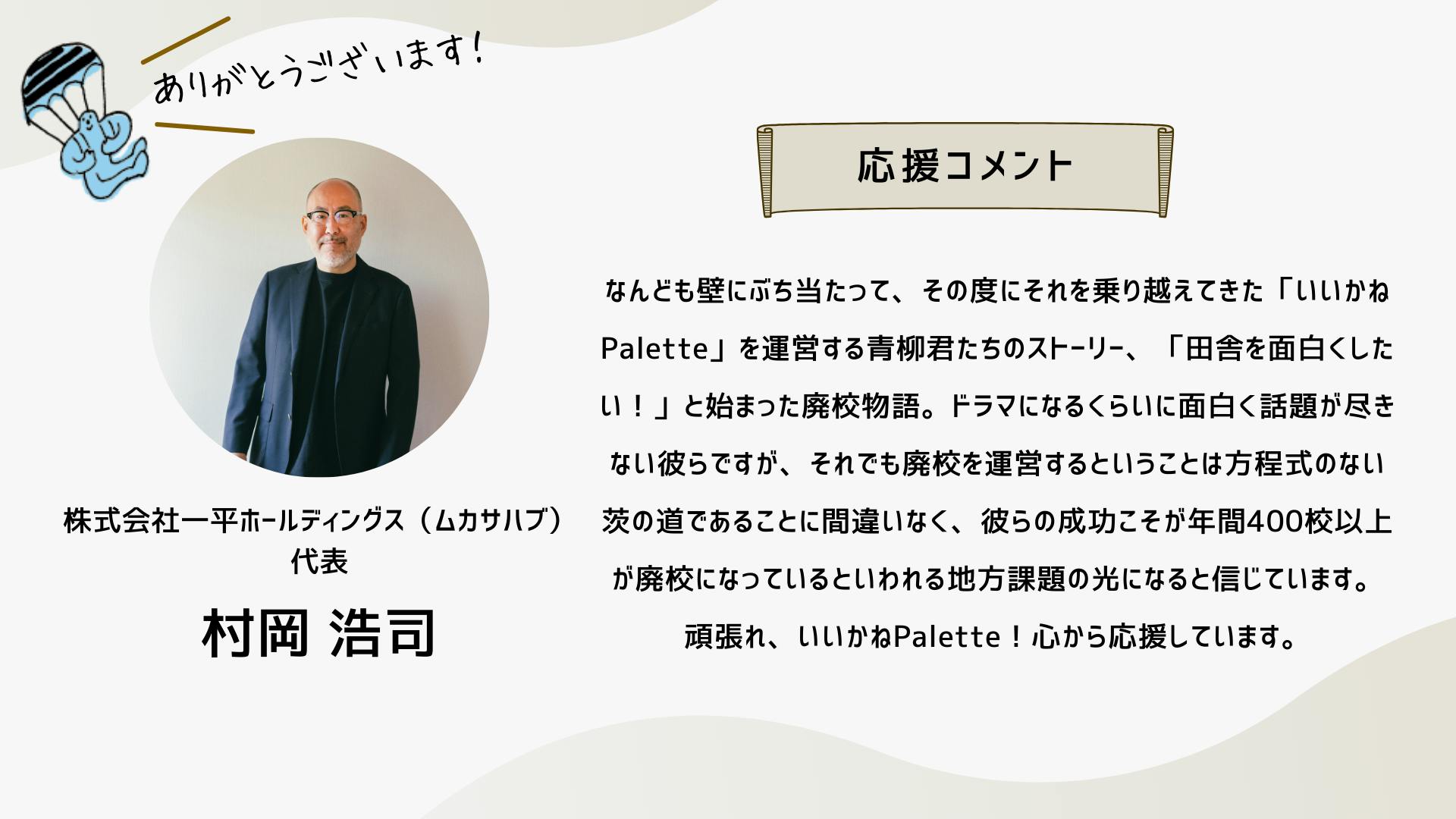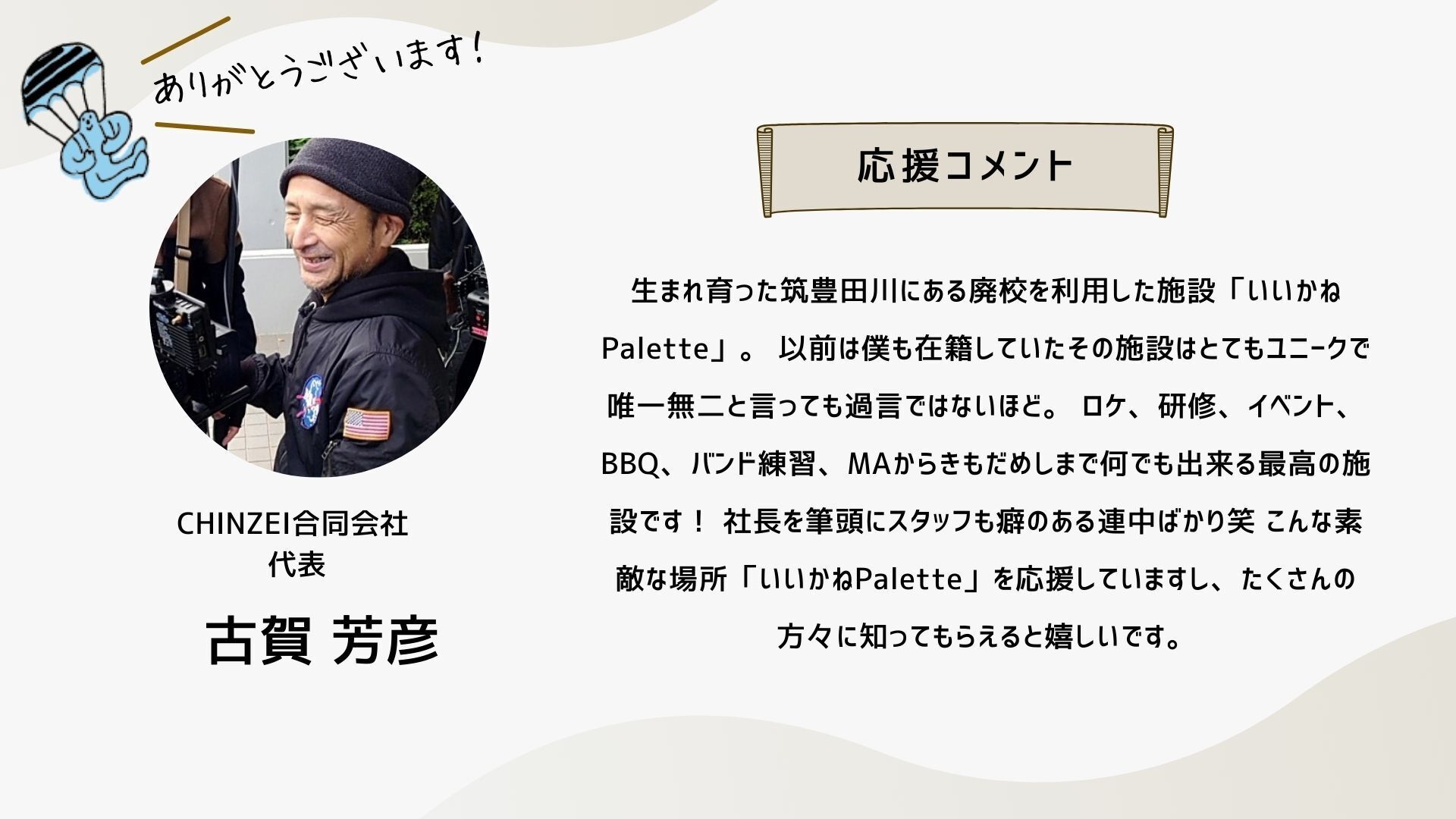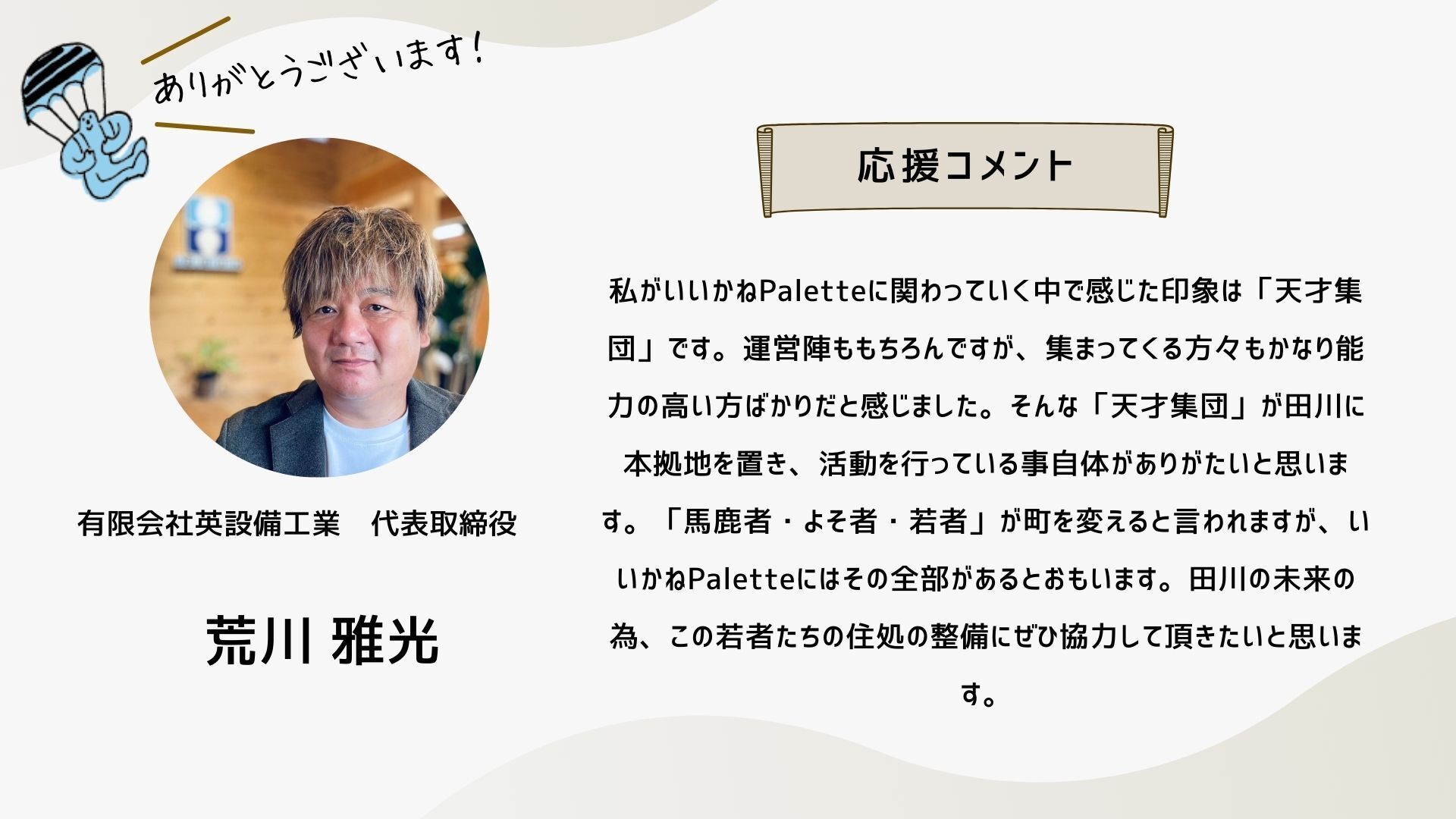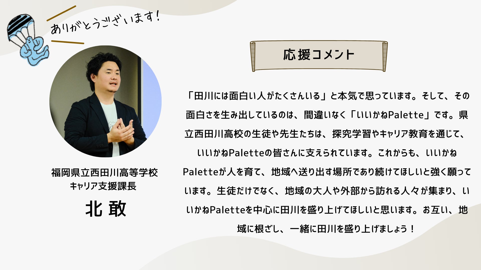 2024/10/13 19:10こんにちは、いつも応援ありがとうございます!クラウドファンディング終了まで1日となりました。明日は、このイベント「いいかねPaletteクラファン大感謝祭!」です!是非ご参加ください!お申し込みはこちらから!そして、配信はこちらです!是非、御覧ください!新しい「いいかねPalette」で・・・先日、樋口会長とITeens Lab代表の古林さんがパーソナリティをつとめるラジオ「新型オトナウィルス」において『いいかねPalette好きっすよ』というテーマでお話をされていました。「普通、こんな財務状況だと、こんなに楽しそうにできないですよ」番組の中で、樋口会長は、いいかねPaletteを運営する㈱BOOKの顧問会計士の方からそう言われたエピソードを話していました。確かに、いいかねPaletteの樋口会長、青柳代表をはじめとするスタッフたちはみんな楽しそうに働いています。昨年度、777万円の赤字を出した時も、青柳社長は出会って3秒でお客様とハグをしていましたし、スタッフたちの表情も明るかったはずです。おそらく、いいかねPaletteに実際に来て頂いたお客様はこう感じて頂けると思います。「いいかねPaletteは良いところだ」本当にありがたいことですが、スタッフたちは、樋口会長と青柳社長から「明るく働こう」「元気を出そう」「良い施設だと思われよう」そんなことを言われたわけではありません。スタッフたちは二人の背中を見ながら、一緒に空気を吸って、一緒に話をしながら、一緒に時間を過ごすことで、明るく、楽しく、いつも新しい何かにチャレンジしながら働いてくれている気がします。いいかねPaletteで働くスタッフと株式会社BOOKが契約をしたり、労働条件を通知したりする際、服務に関する様々な事項の中に、太字でこのような文章があります。・いいかねPaletteに関わる人たちを応援し、やりたいことを支援する ・あの手この手で田川を盛り上げるそれは、いいかねPaletteが、まだ出会ったことがない、あなたに出会うためです。それは、いいかねPaletteが、まだ繋がったことがない、あなたとゆるく繋がるためです。それは、いいかねPaletteが、地域を明るく照らし、全国の田舎を明るく照らすためです。いいかねPaletteで働いたり、いいかねPaletteに入居したり、いいかねPaletteでイベントをしたり、いいかねPaletteに住んだり、いいかねPaletteで遊んだり、いいかねPaletteで事業をしたり・・・僕たちは、あなたと一緒に、あの手この手でいいかねPaletteを盛り上げたいです。このクラウドファンディングが終了すれば、新しい「いいかねPalette」がスタートします。新しい「いいかねPalette」それは、このクラウドファンディングを経て、今までより、もっと多くの人と出会い、もっと多くの人と繋がった「いいかねPalette」です。こちら↓はこのクラウドファンディングで樋口聖典24時間レンタルに支援するため、クラウドファンディングをして頂いた有志88名の方たちのメッセージ。このクラウドファンディングで、あなたと出会い、あなたと繋がった「いいかねPalette」が始まります。新しい何かにチャレンジしましょう。やりたいことをやりましょう。是非、このクラウドファンディングを全国に届けてください。その行動が、その想いが、いいかねPalette(のような場所)を生みます。そして、その場所から、コテンラジオ(のような素晴らしいなにか)が生まれます。きっと、そうやって社会はもっとおもしろくなる。僕たちは、そう本気で信じています。お付き合い頂き、本当にありがとうございます!最後の最後まで、お付き合い頂けましたら幸いです。 もっと見る