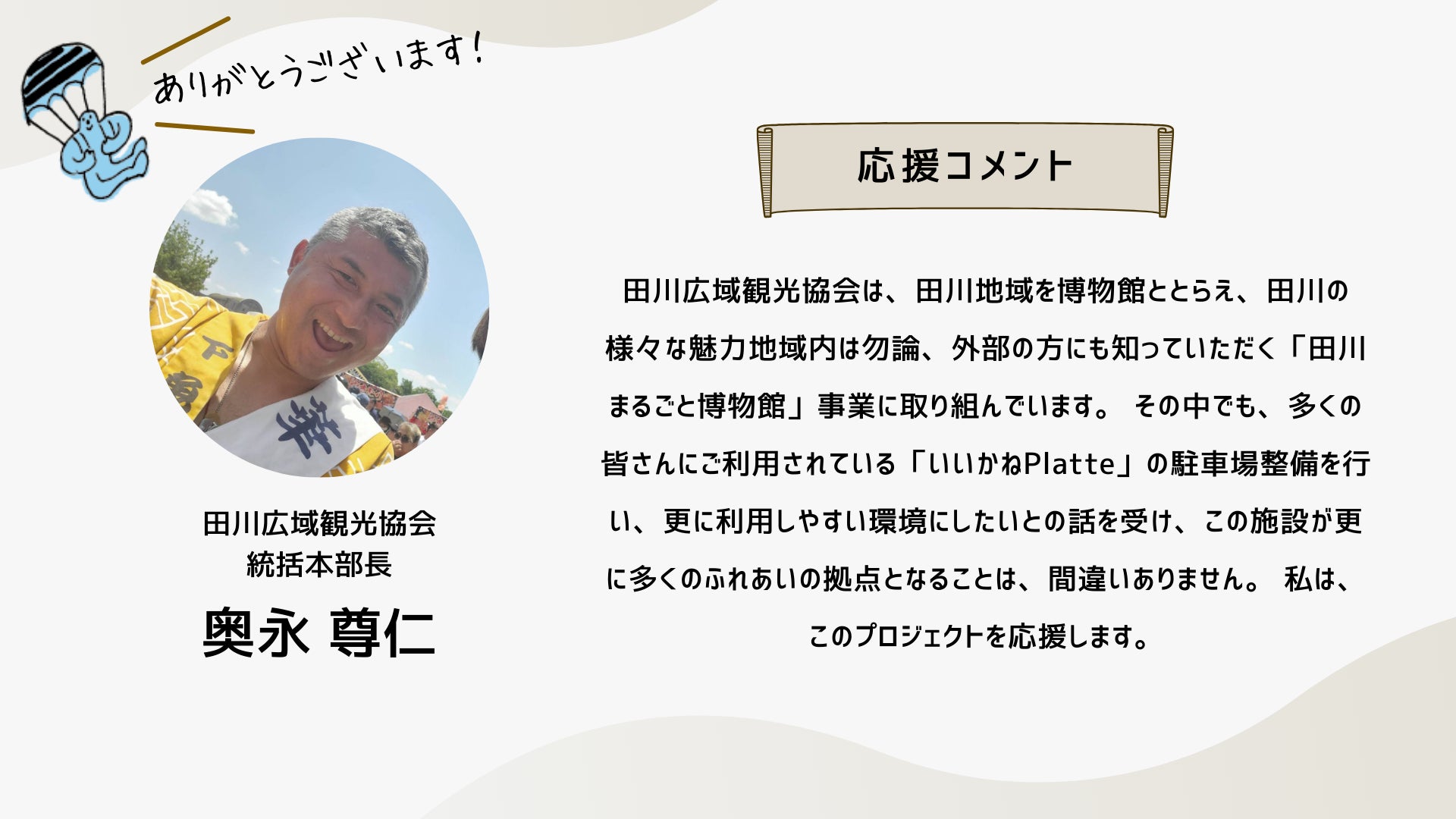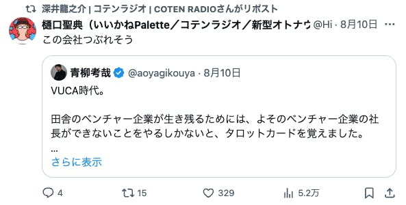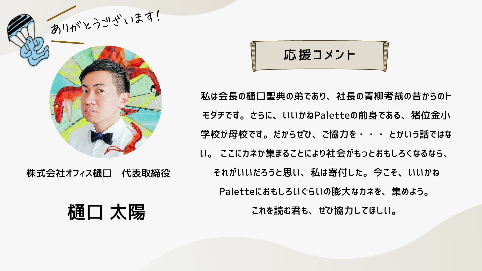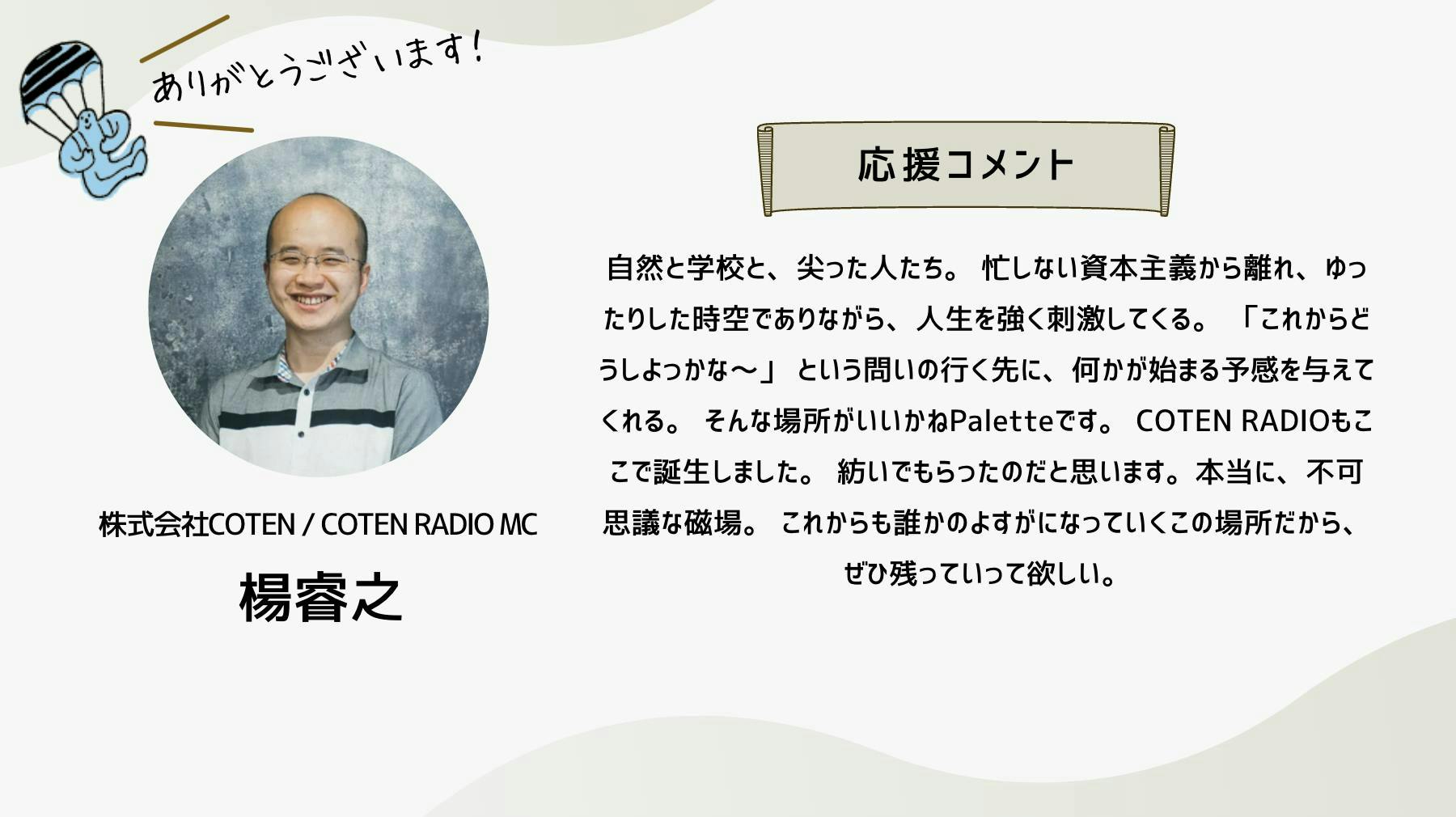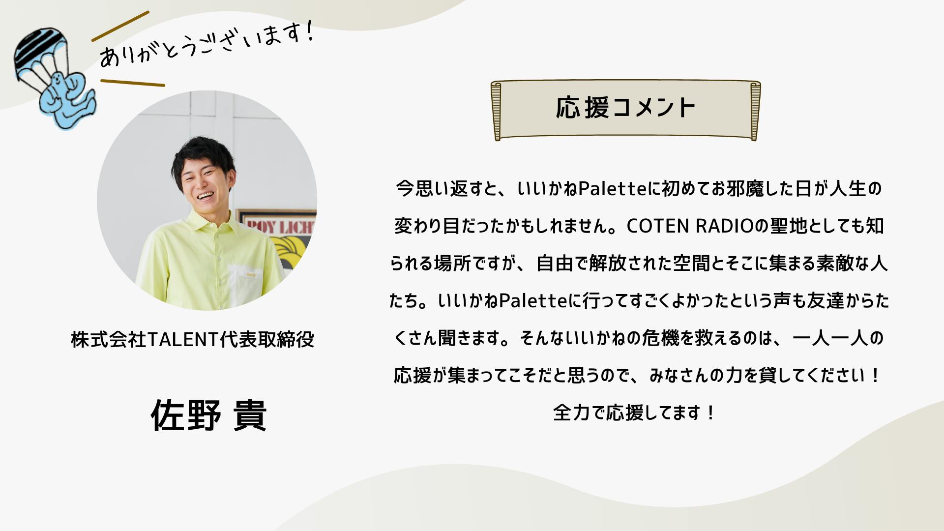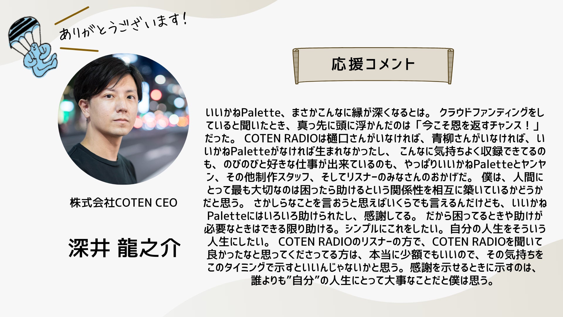 2024/10/12 16:34こんにちは!いつも応援ありがとうございます!ついに、いいかねPaletteクラウドファンディングのページにあの方のコメントが掲載されました!思えば、ここまで長かったです。応援コメントは、画像だと読みにくいかもしれないので、読みやすいように、この活動報告にコピペさせていただきます。以下、株式会社COTEN CEO 深井 龍之介さんの応援コメント〜〜〜〜〜いいかねPalette、まさかこんなに縁が深くなるとは。クラウドファンディングをしていると聞いたとき、真っ先に頭に浮かんだのは「今こそ恩を返すチャンス!」だった。COTEN RADIOは樋口さんがいなければ、青柳さんがいなければ、いいかねPaletteがなければ生まれなかったし、こんなに気持ちよく収録できてるのも、のびのびと好きな仕事が出来ているのも、やっぱりいいかねPaletteとヤンヤン、その他制作スタッフ、そしてリスナーのみなさんのおかげだ。僕は、人間にとって最も大切なのは困ったら助けるという関係性を相互に築いているかどうかだと思う。さかしらなことを言おうと思えばいくらでも言えるんだけども、いいかねPaletteにはいろいろ助けられたし、感謝してる。だから困ってるときや助けが必要なときはできる限り助ける。シンプルにこれをしたい。自分の人生をそういう人生にしたい。COTEN RADIOのリスナーの方で、COTEN RADIOを聞いて良かったなと思ってくださってる方は、本当に少額でもいいので、その気持ちをこのタイミングで示すといいんじゃないかと思う。感謝を示せるときに示すのは、誰よりも”自分”の人生にとって大事なことだと僕は思う。〜〜〜〜〜想いの乗ったコメントを寄せてくれた深井さん。樋口会長、青柳代表、そして、ヤンヤンさんや他のスタッフやリスナーさん、さらに「いいかねPalette」への感謝の気持ちが伝わってきます。このコメントを寄せてくれるまでのストーリーの「始まり」は、もしかすると、このリポストからだったのかもしれません。以下、このコメントに至るまでのXでの深井さんのコメントを紹介します。クラファン開始直後クラファン2日目樋口会長誕生日の2日後ストレッチーゴール宣言時もちろん、僕たちは知っています。深井さんは「書く書く詐欺」と言いつつ、ご自身のアカウントで何度も何度も、このクラウドファンディングについて言及することで、いいかねPalettを応援してくれたことを。そして、最後の一踏ん張りのところで、スタートから走り続けてきた僕らを励まし、支援者さまたちを盛り上げるためのコメントをくださったことを。本当にありがとうございます。この「運動」が全国に広がり、いいかねPaletteのような場所が全国に増え、いつの日か、その場所からコテンラジオ(のような素晴らしいなにか)が誕生することを、僕たちは信じしています。最終日まで、あと2日。最終日は、こちらのイベントが開催されます。ぜひ、お越しください!遠方の方はこちらから御覧ください!引き続きいいかねPaletteクラウドファンディングを何卒よろしくお願い致します! もっと見る