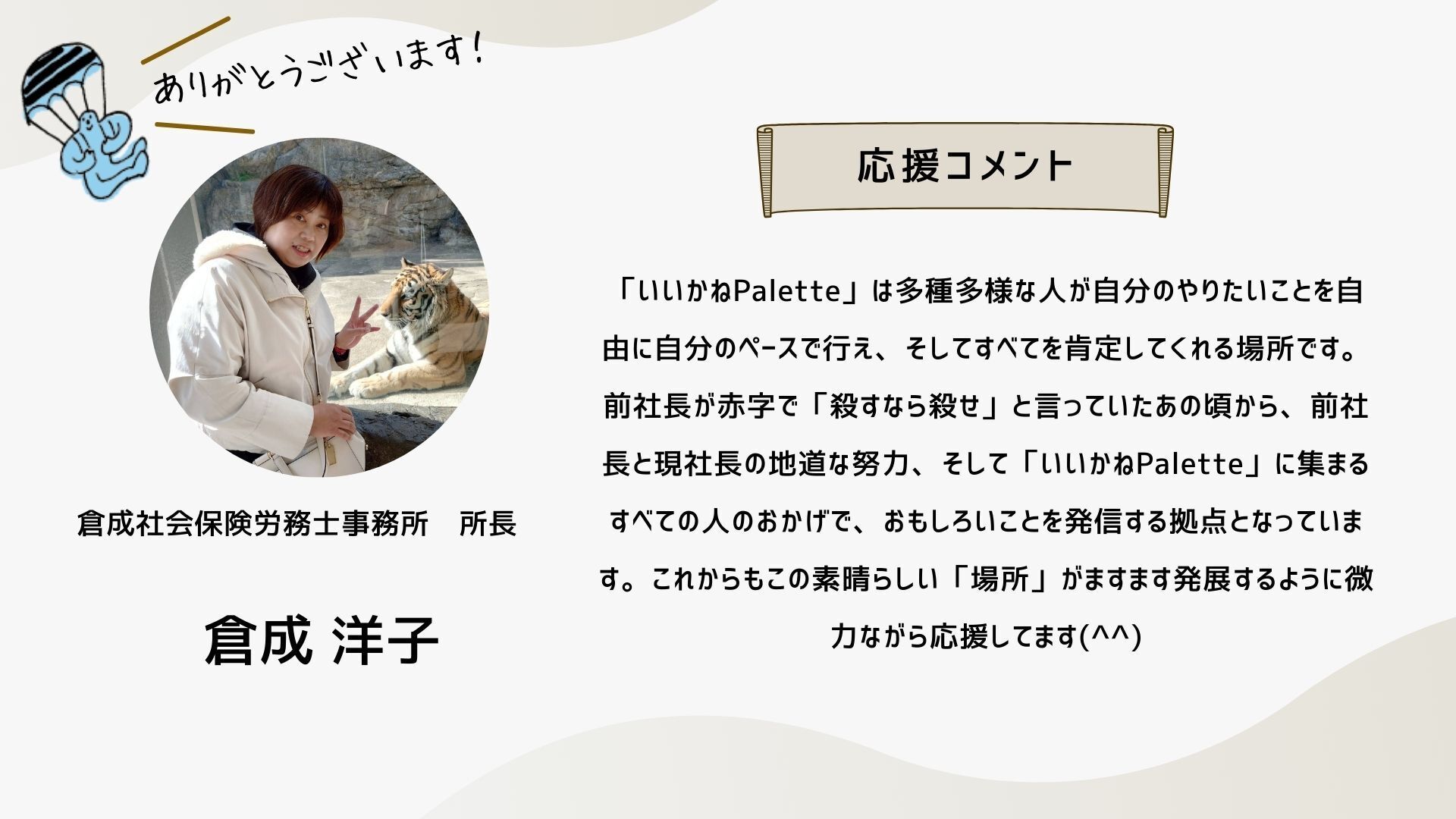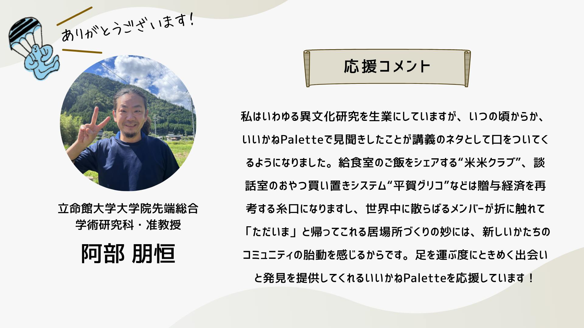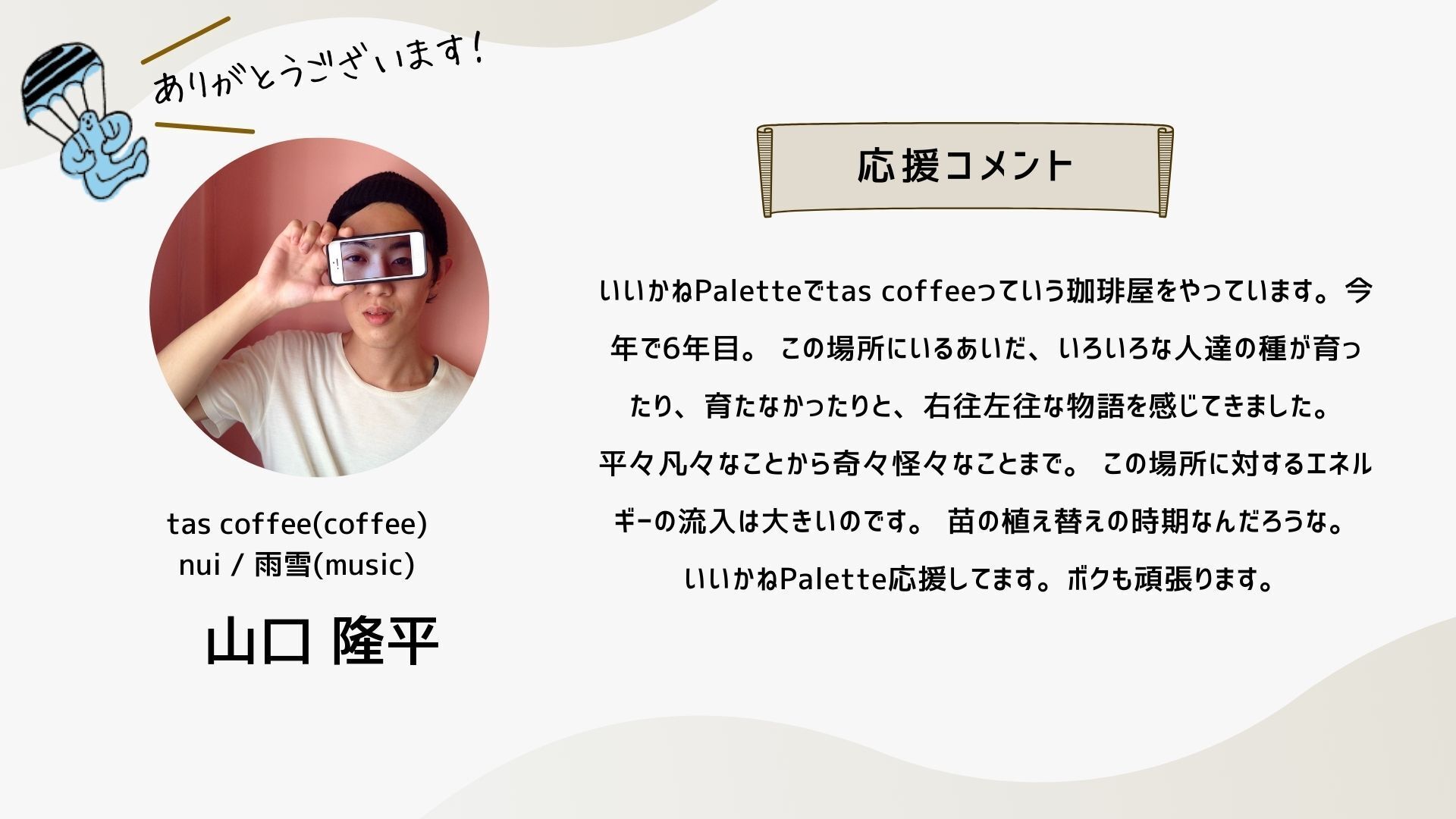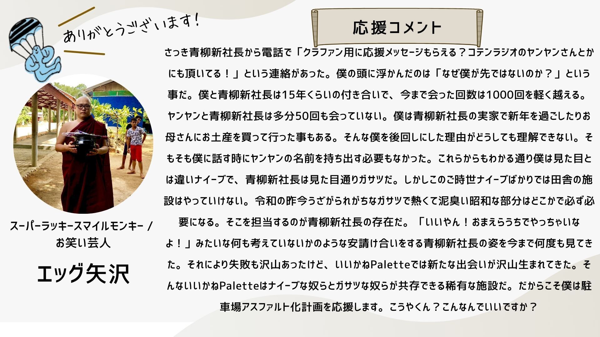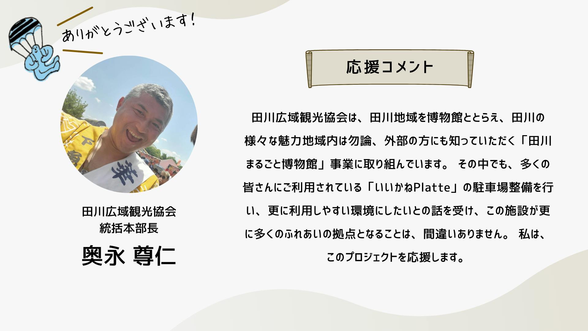 2024/10/12 16:34こんにちは!いつも応援ありがとうございます!ついに、いいかねPaletteクラウドファンディングのページにあの方のコメントが掲載されました!思えば、ここまで長かったです。応援コメントは、画像だと読みにくいかもしれないので、読みやすいように、この活動報告にコピペさせていただきます。以下、株式会社COTEN CEO 深井 龍之介さんの応援コメント〜〜〜〜〜いいかねPalette、まさかこんなに縁が深くなるとは。クラウドファンディングをしていると聞いたとき、真っ先に頭に浮かんだのは「今こそ恩を返すチャンス!」だった。COTEN RADIOは樋口さんがいなければ、青柳さんがいなければ、いいかねPaletteがなければ生まれなかったし、こんなに気持ちよく収録できてるのも、のびのびと好きな仕事が出来ているのも、やっぱりいいかねPaletteとヤンヤン、その他制作スタッフ、そしてリスナーのみなさんのおかげだ。僕は、人間にとって最も大切なのは困ったら助けるという関係性を相互に築いているかどうかだと思う。さかしらなことを言おうと思えばいくらでも言えるんだけども、いいかねPaletteにはいろいろ助けられたし、感謝してる。だから困ってるときや助けが必要なときはできる限り助ける。シンプルにこれをしたい。自分の人生をそういう人生にしたい。COTEN RADIOのリスナーの方で、COTEN RADIOを聞いて良かったなと思ってくださってる方は、本当に少額でもいいので、その気持ちをこのタイミングで示すといいんじゃないかと思う。感謝を示せるときに示すのは、誰よりも”自分”の人生にとって大事なことだと僕は思う。〜〜〜〜〜想いの乗ったコメントを寄せてくれた深井さん。樋口会長、青柳代表、そして、ヤンヤンさんや他のスタッフやリスナーさん、さらに「いいかねPalette」への感謝の気持ちが伝わってきます。このコメントを寄せてくれるまでのストーリーの「始まり」は、もしかすると、このリポストからだったのかもしれません。以下、このコメントに至るまでのXでの深井さんのコメントを紹介します。クラファン開始直後クラファン2日目樋口会長誕生日の2日後ストレッチーゴール宣言時もちろん、僕たちは知っています。深井さんは「書く書く詐欺」と言いつつ、ご自身のアカウントで何度も何度も、このクラウドファンディングについて言及することで、いいかねPalettを応援してくれたことを。そして、最後の一踏ん張りのところで、スタートから走り続けてきた僕らを励まし、支援者さまたちを盛り上げるためのコメントをくださったことを。本当にありがとうございます。この「運動」が全国に広がり、いいかねPaletteのような場所が全国に増え、いつの日か、その場所からコテンラジオ(のような素晴らしいなにか)が誕生することを、僕たちは信じしています。最終日まで、あと2日。最終日は、こちらのイベントが開催されます。ぜひ、お越しください!遠方の方はこちらから御覧ください!引き続きいいかねPaletteクラウドファンディングを何卒よろしくお願い致します! もっと見る