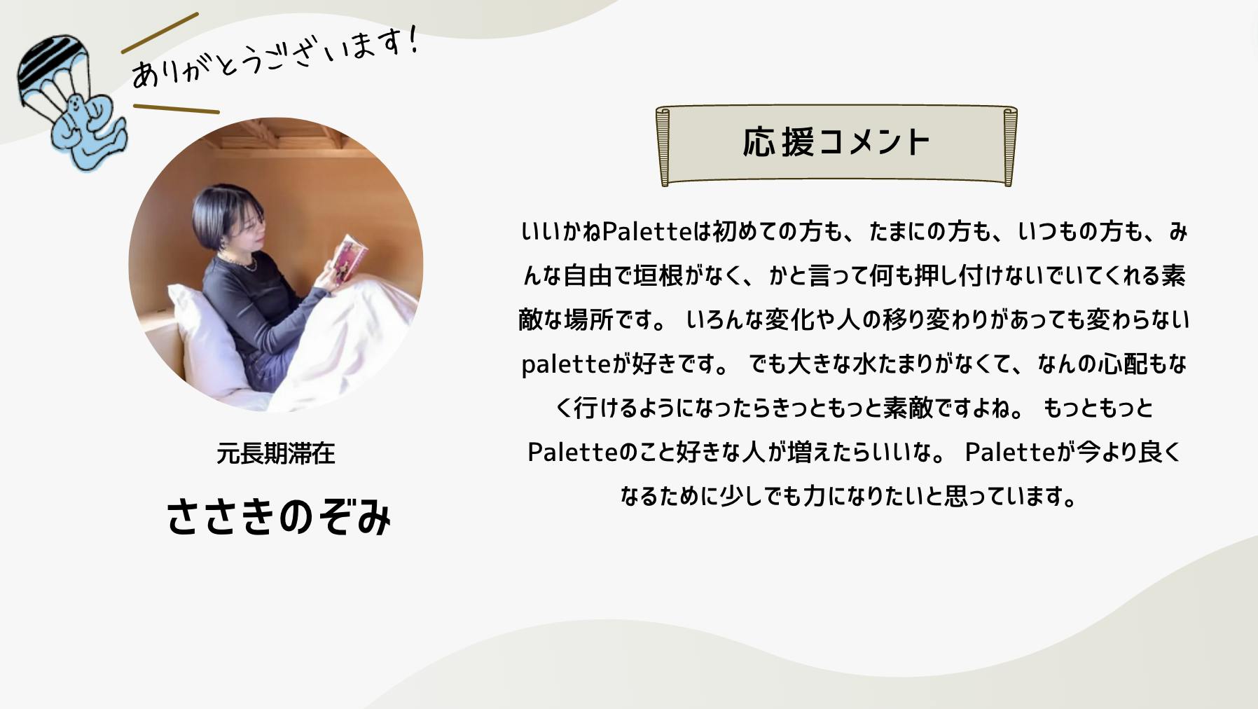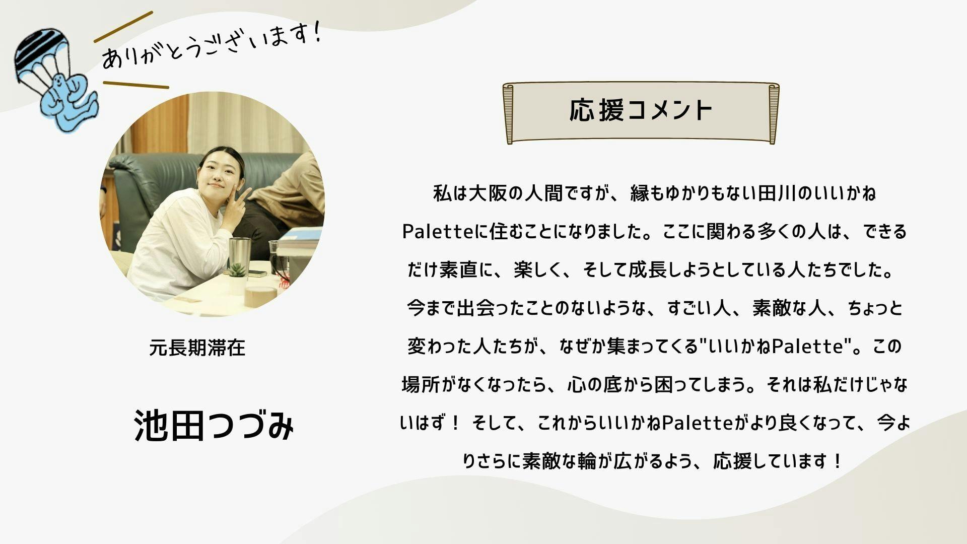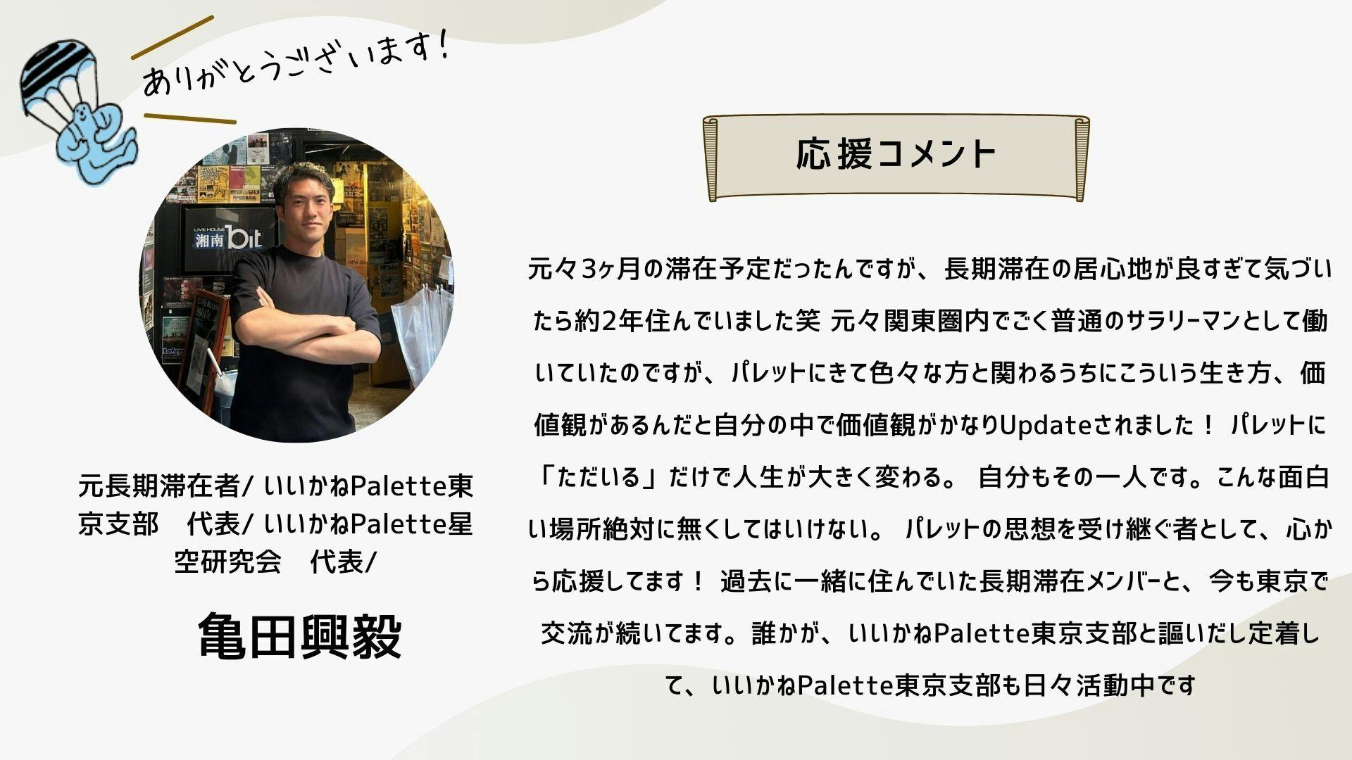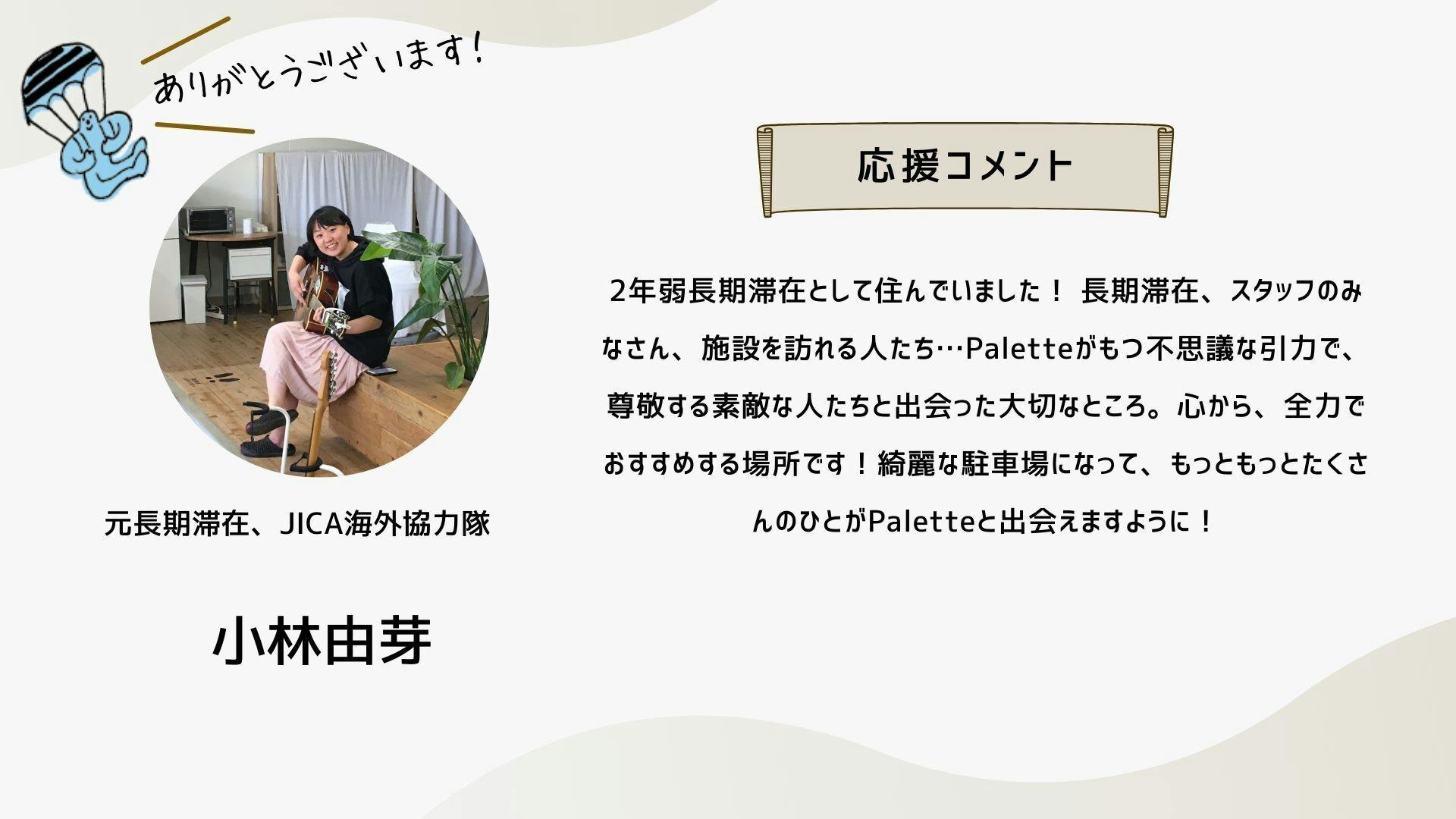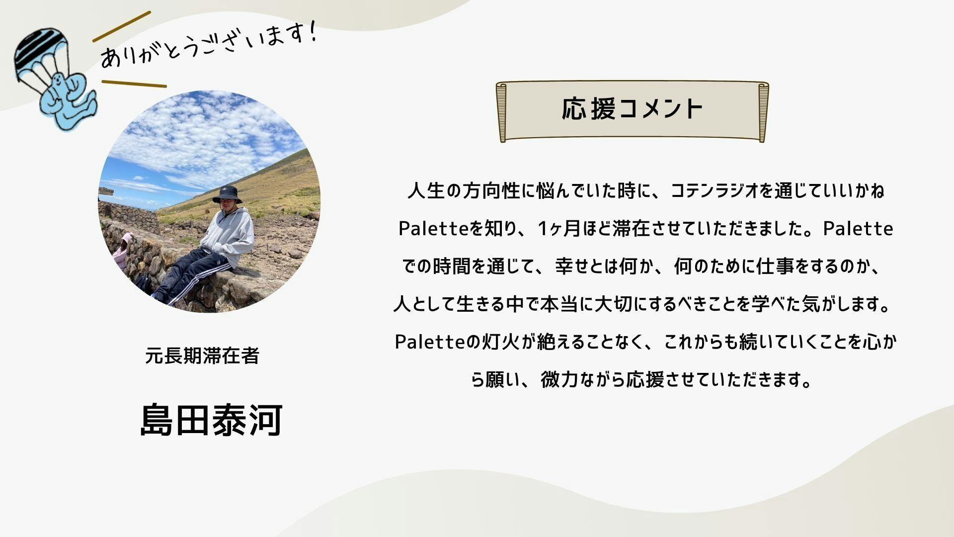 深井さんのコメントで支援決めてコテンにも入会しました。いつかいいかねパレットに泊まりたいです。