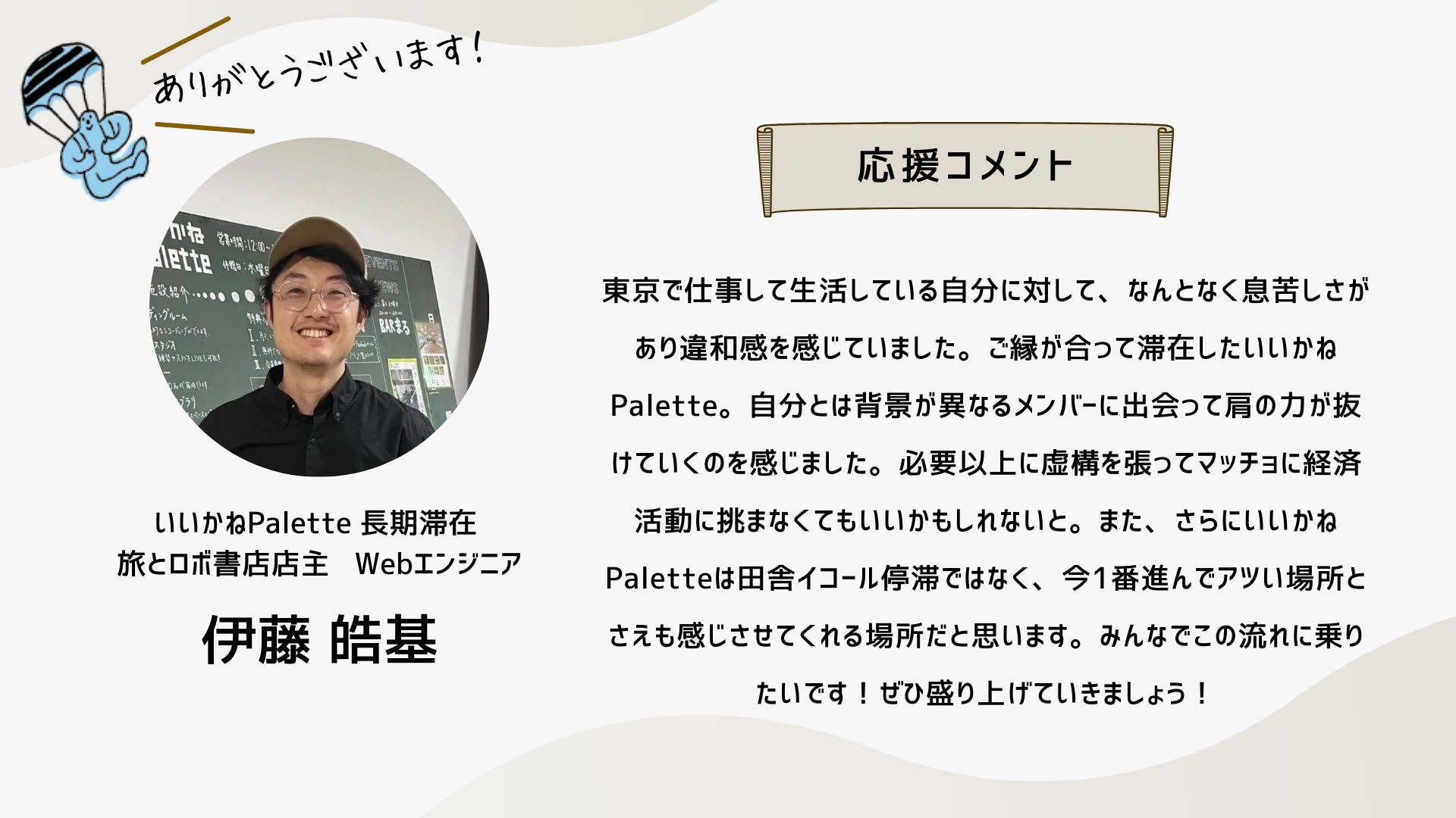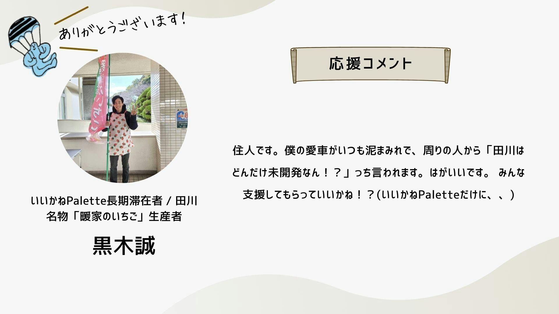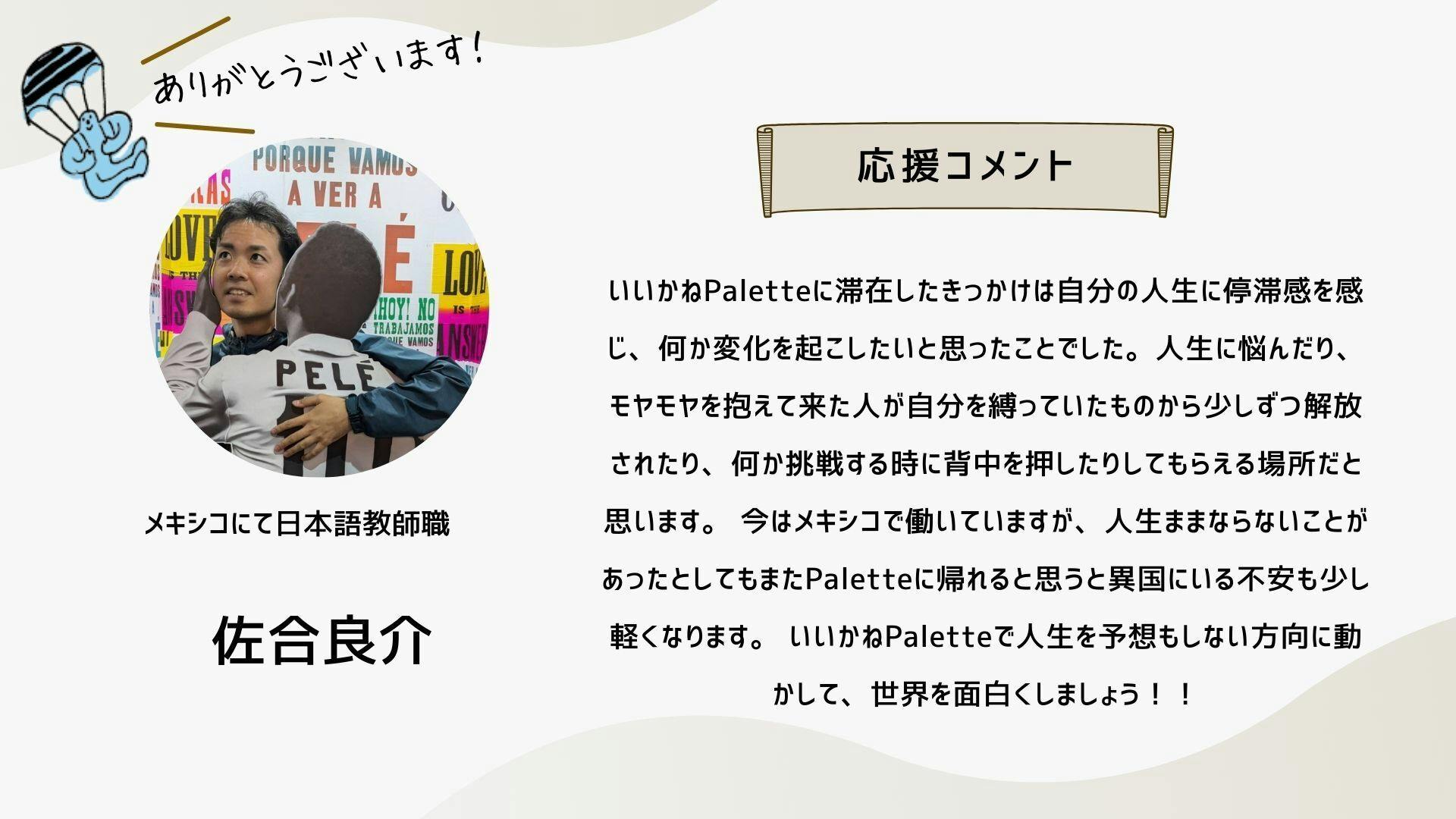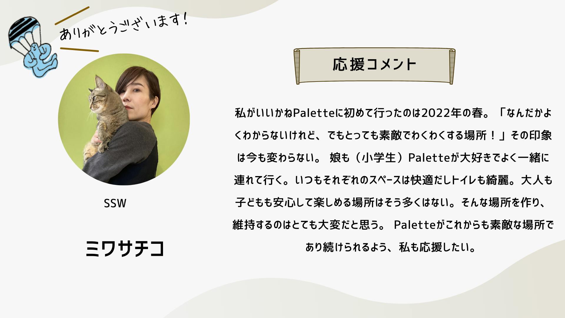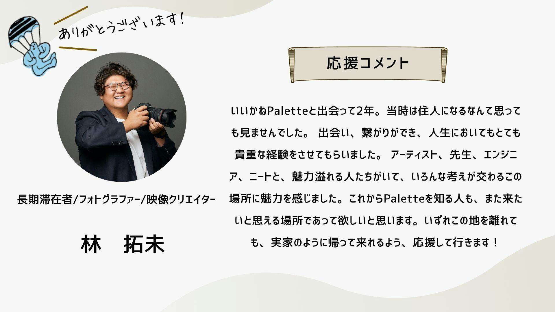深井さんのコメントで支援決めてコテンにも入会しました。いつかいいかねパレットに泊まりたいです。