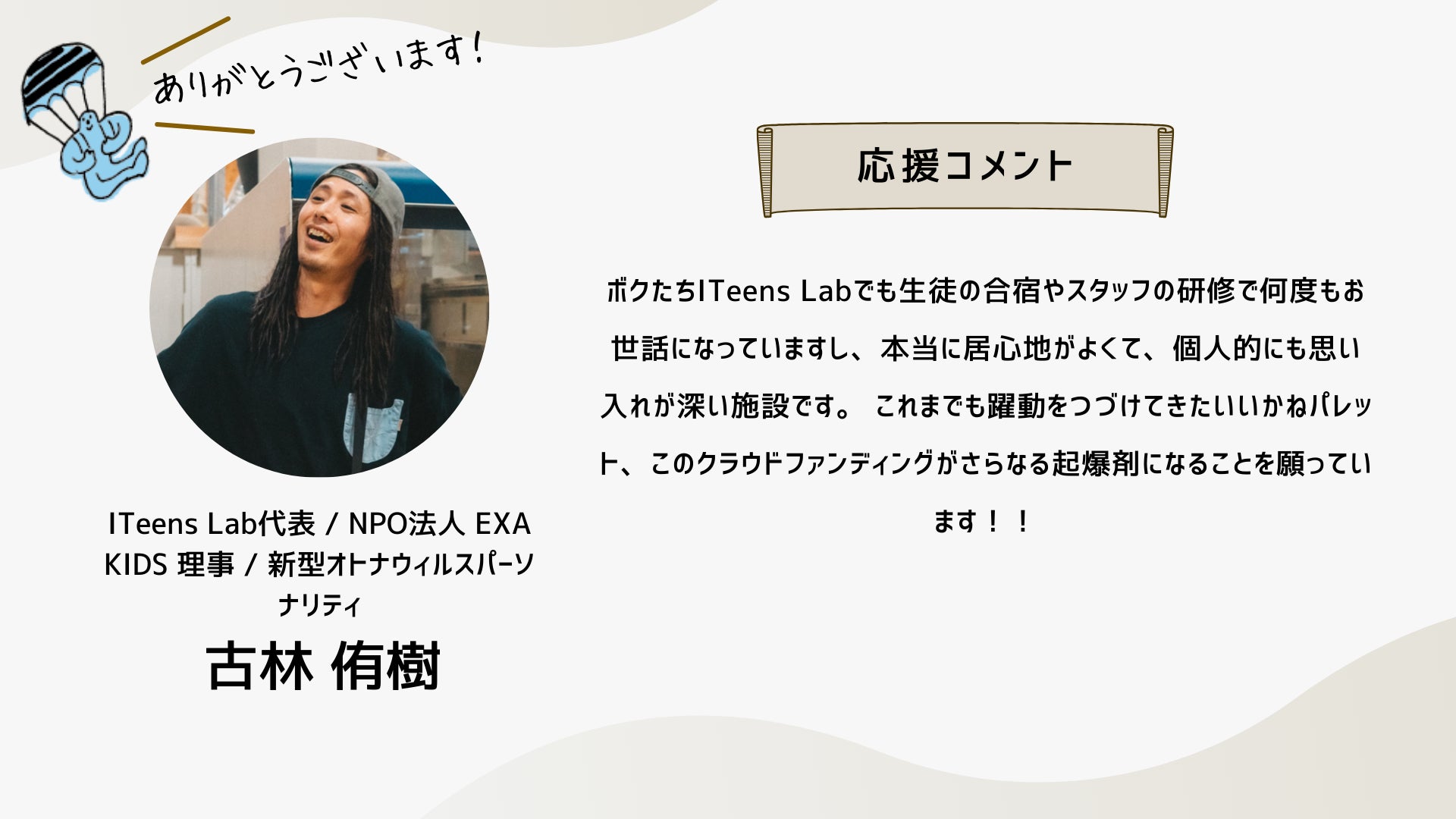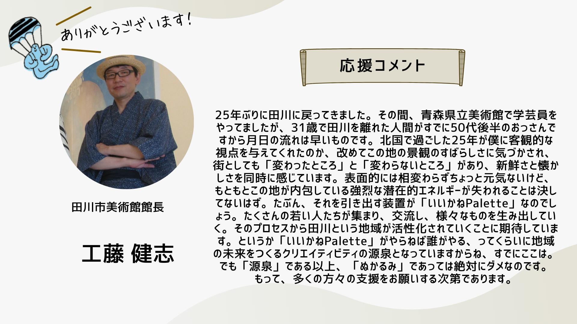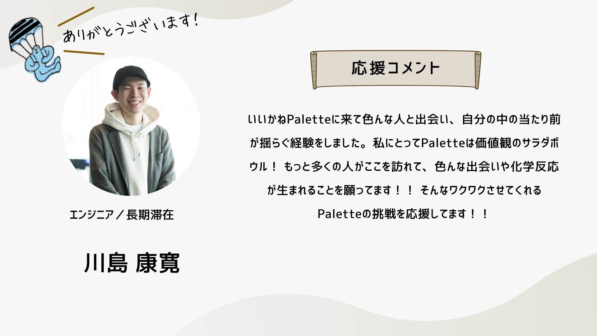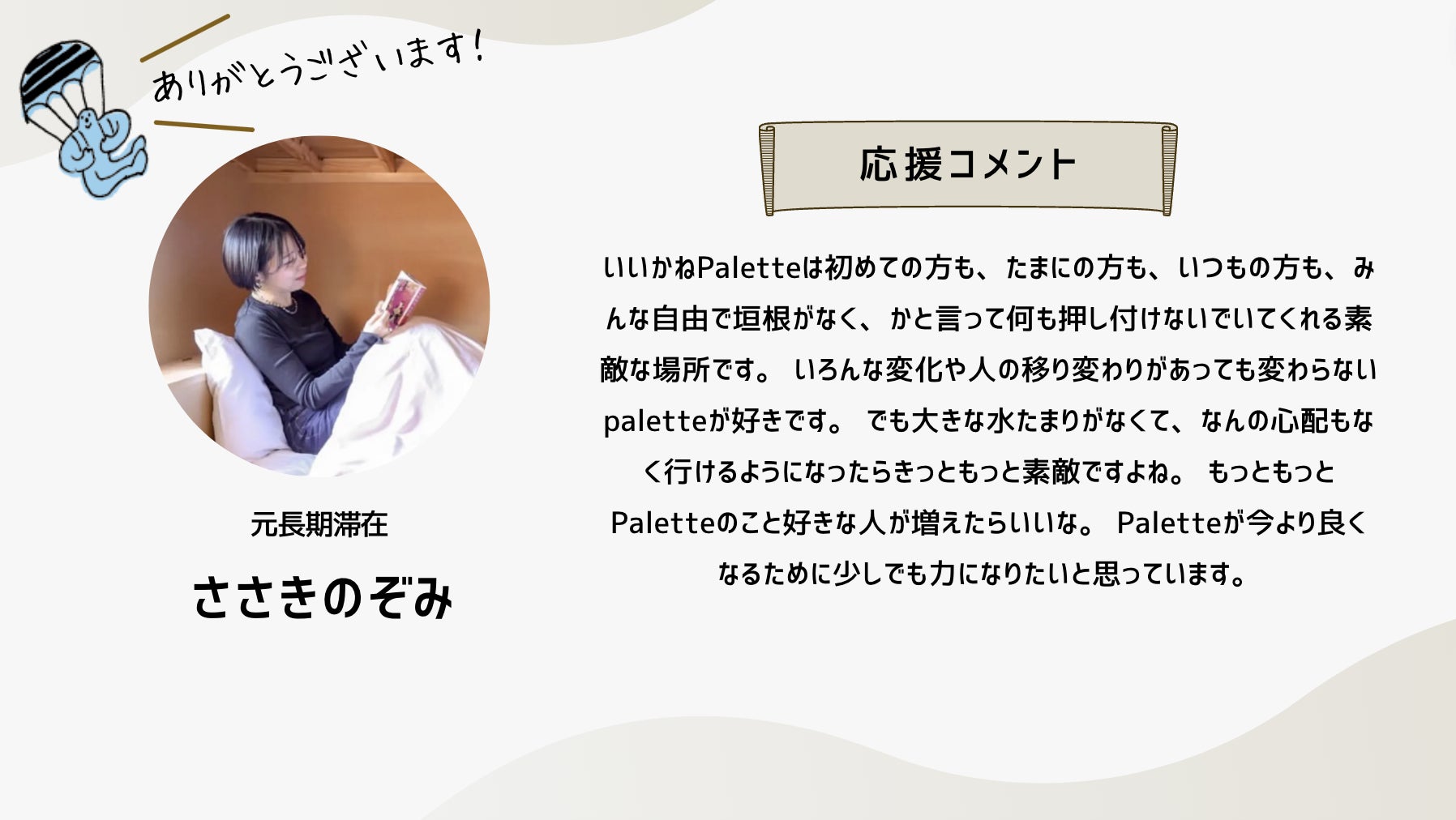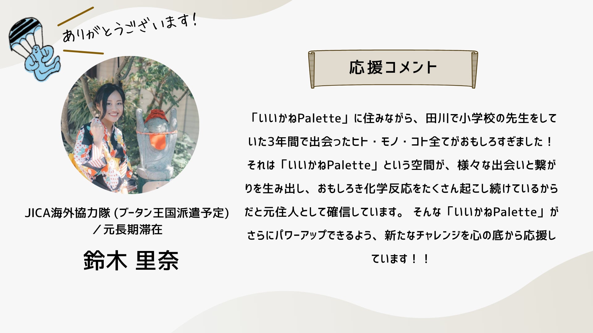 深井さんのコメントで支援決めてコテンにも入会しました。いつかいいかねパレットに泊まりたいです。