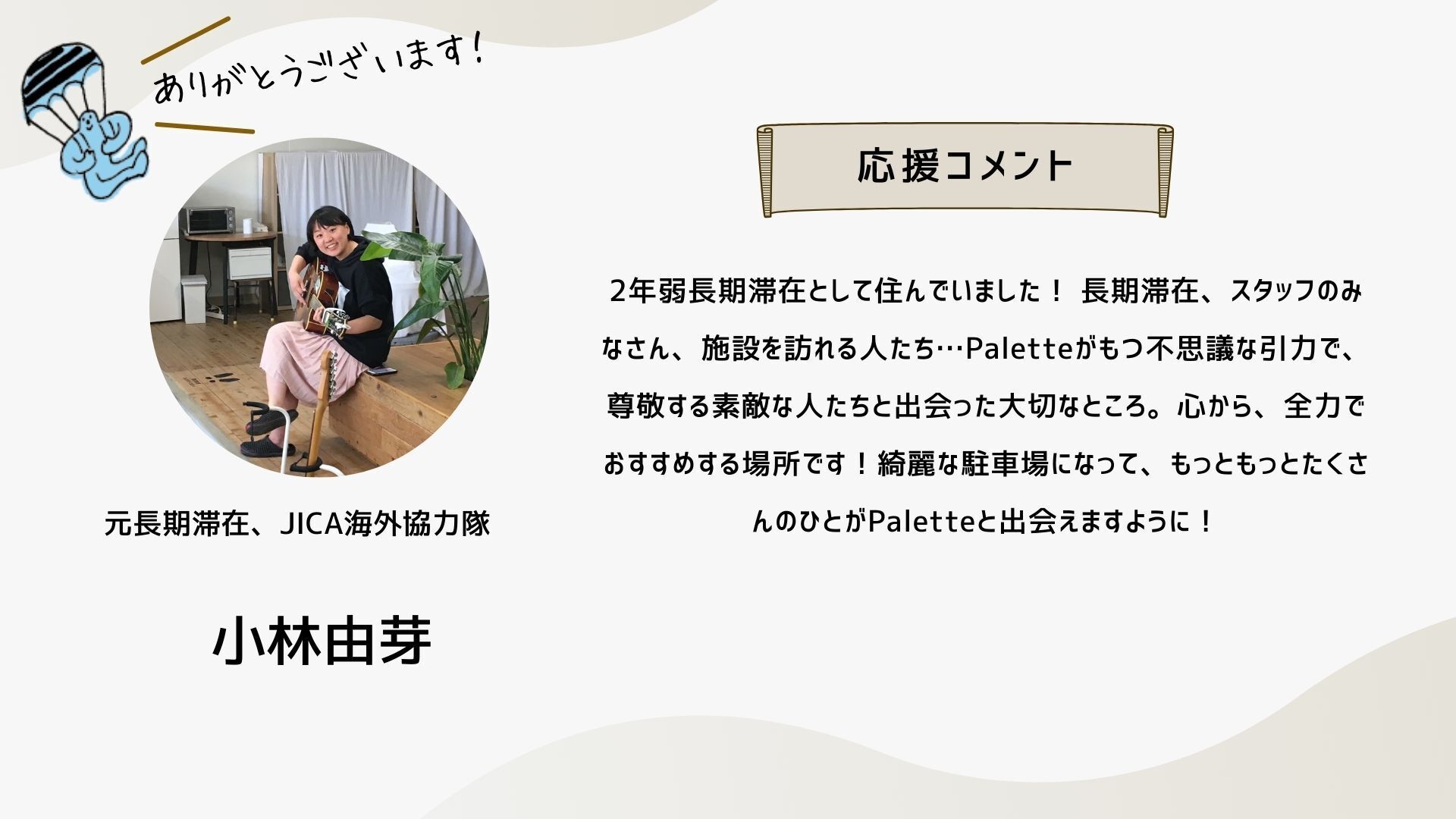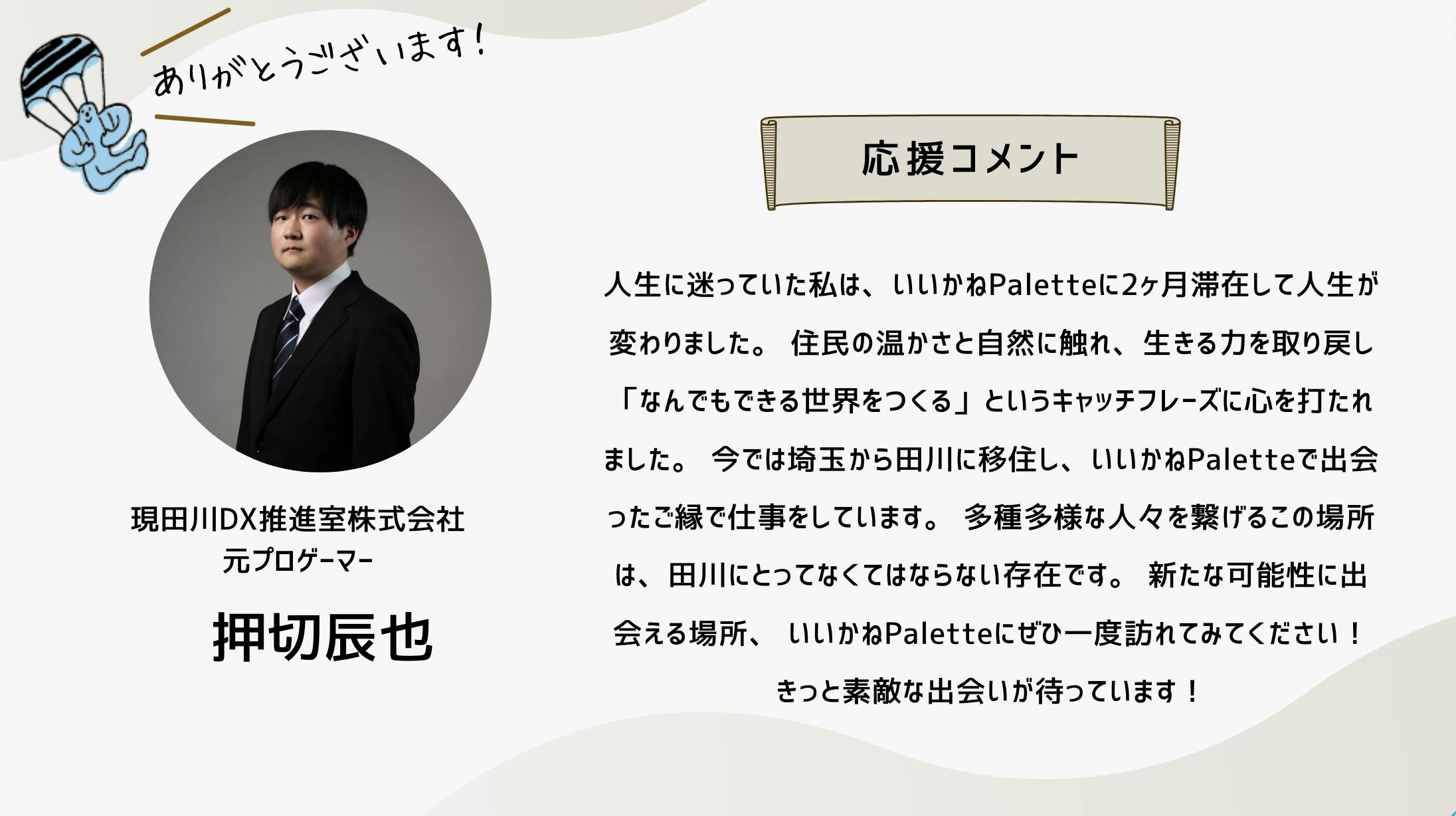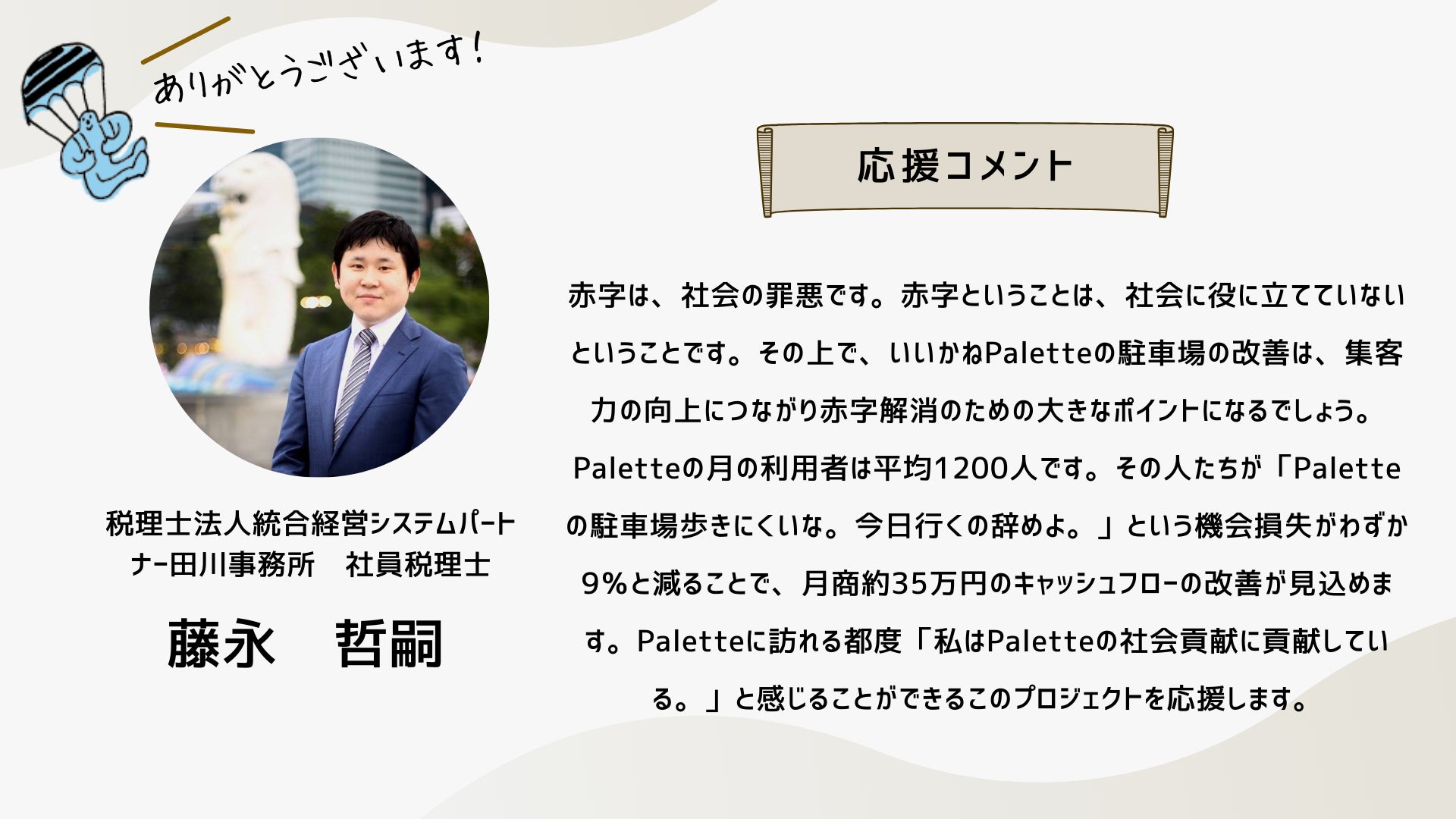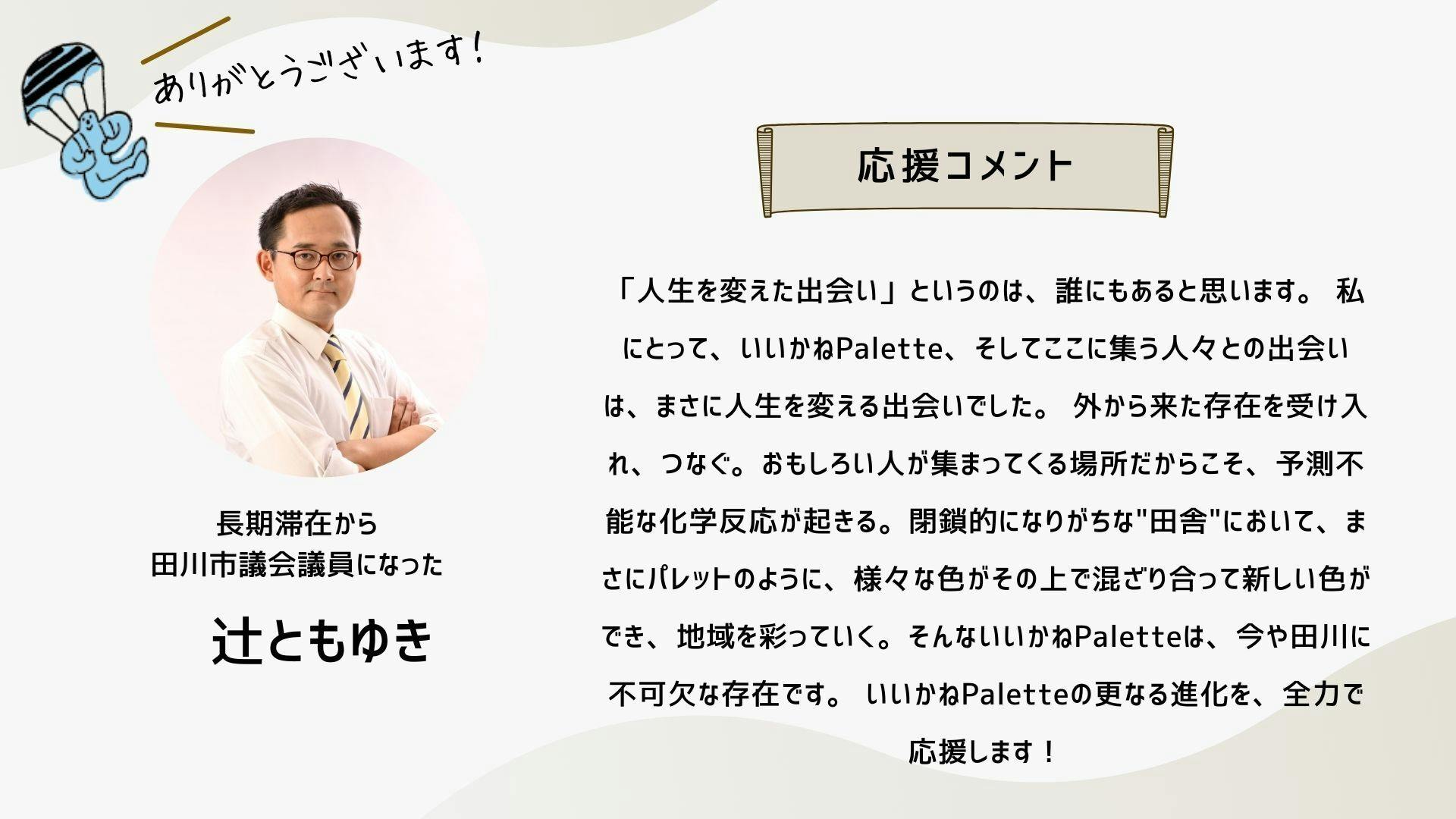 深井さんのコメントで支援決めてコテンにも入会しました。いつかいいかねパレットに泊まりたいです。