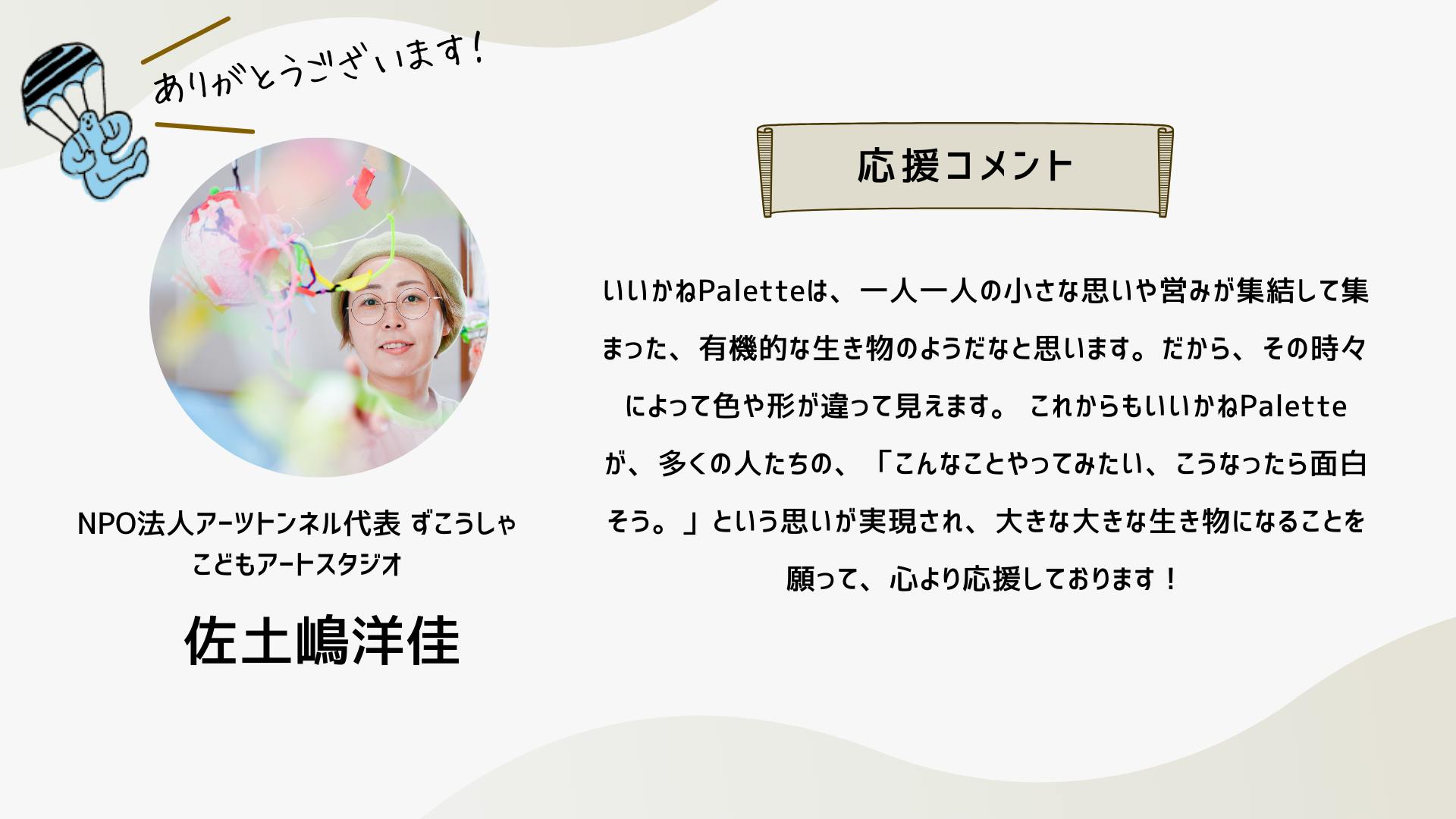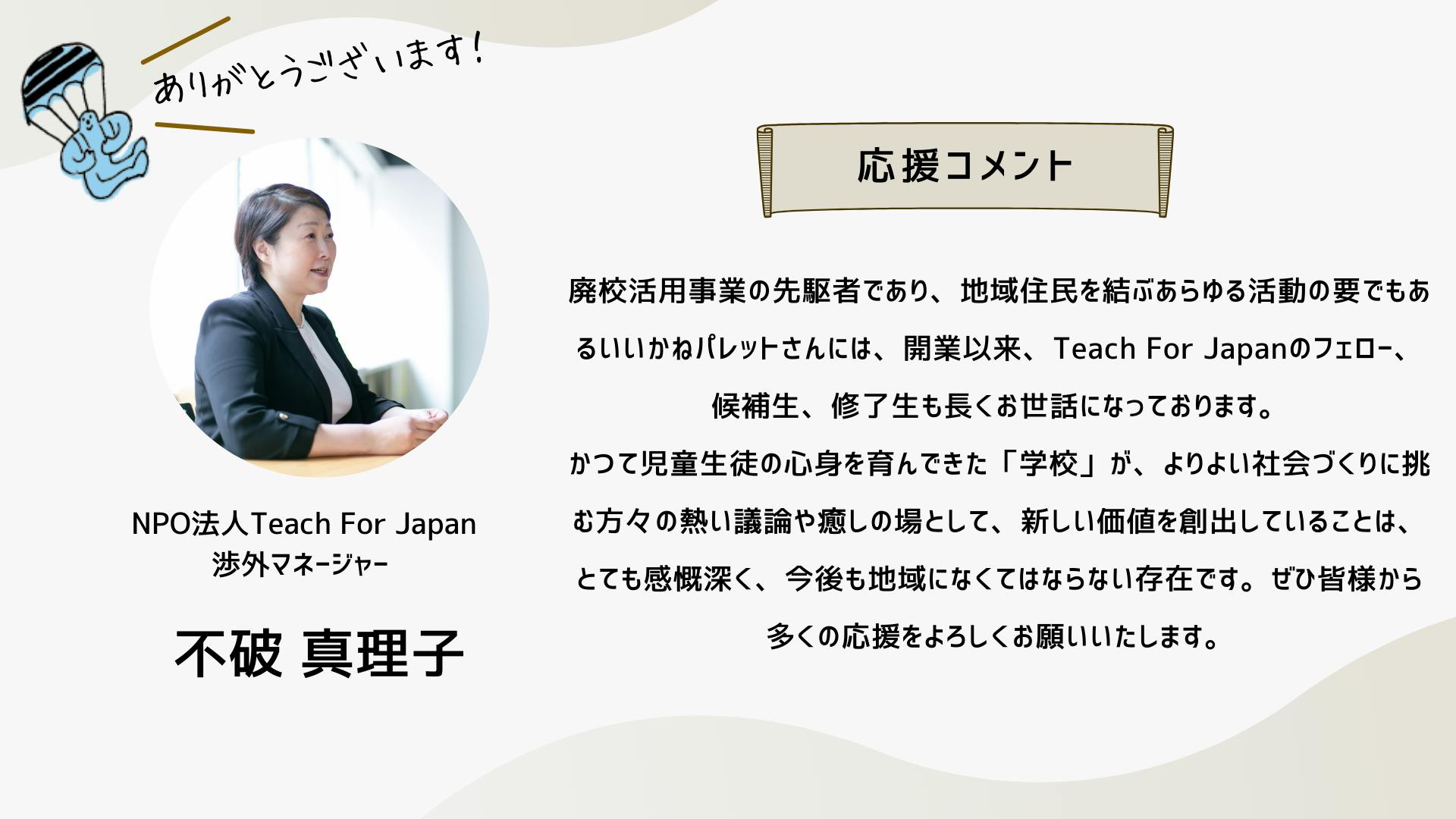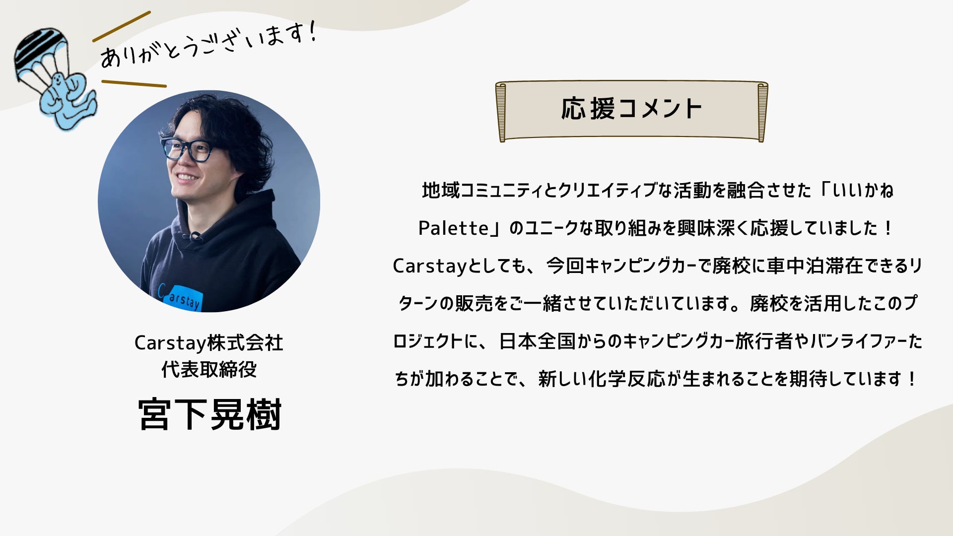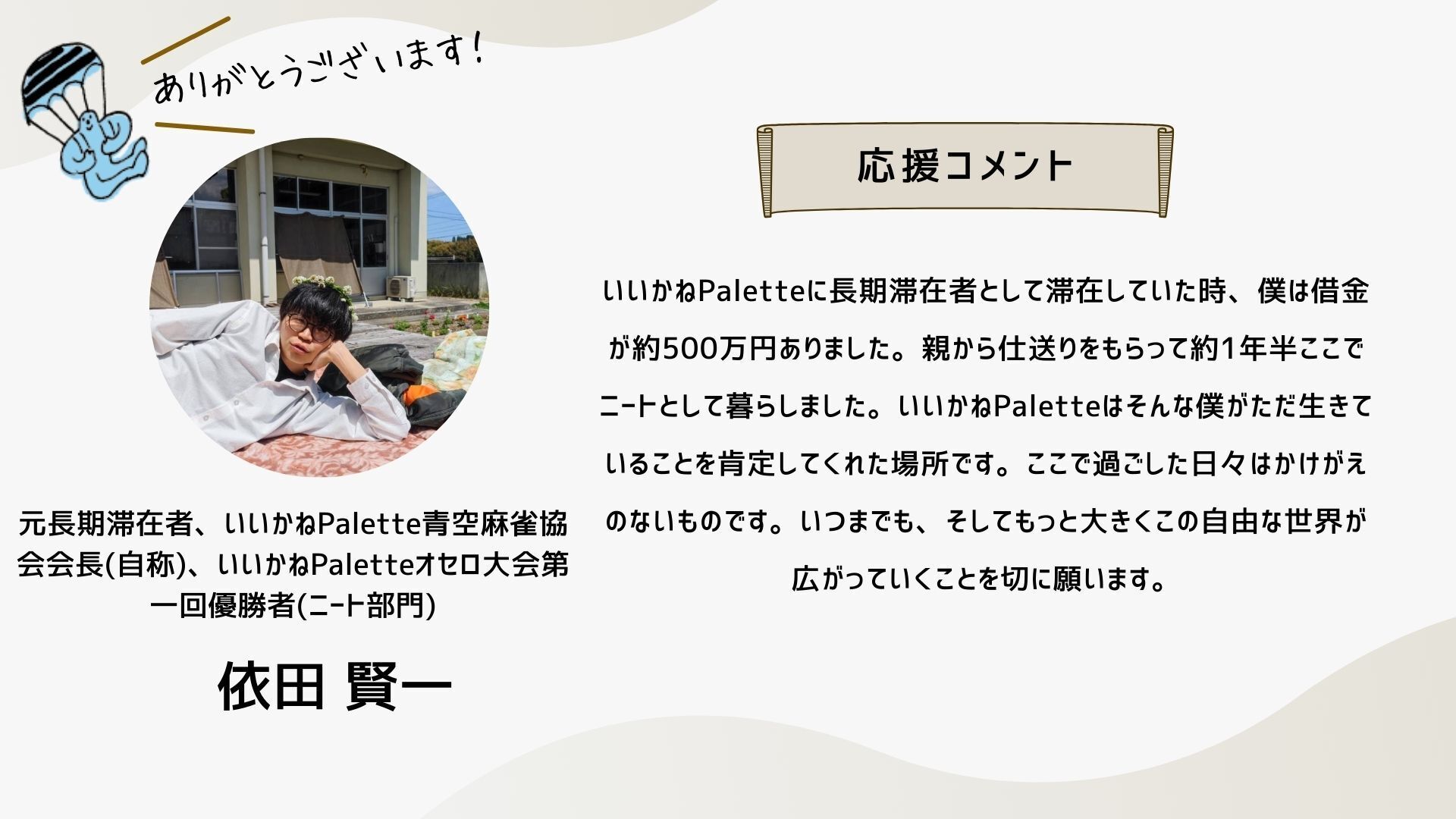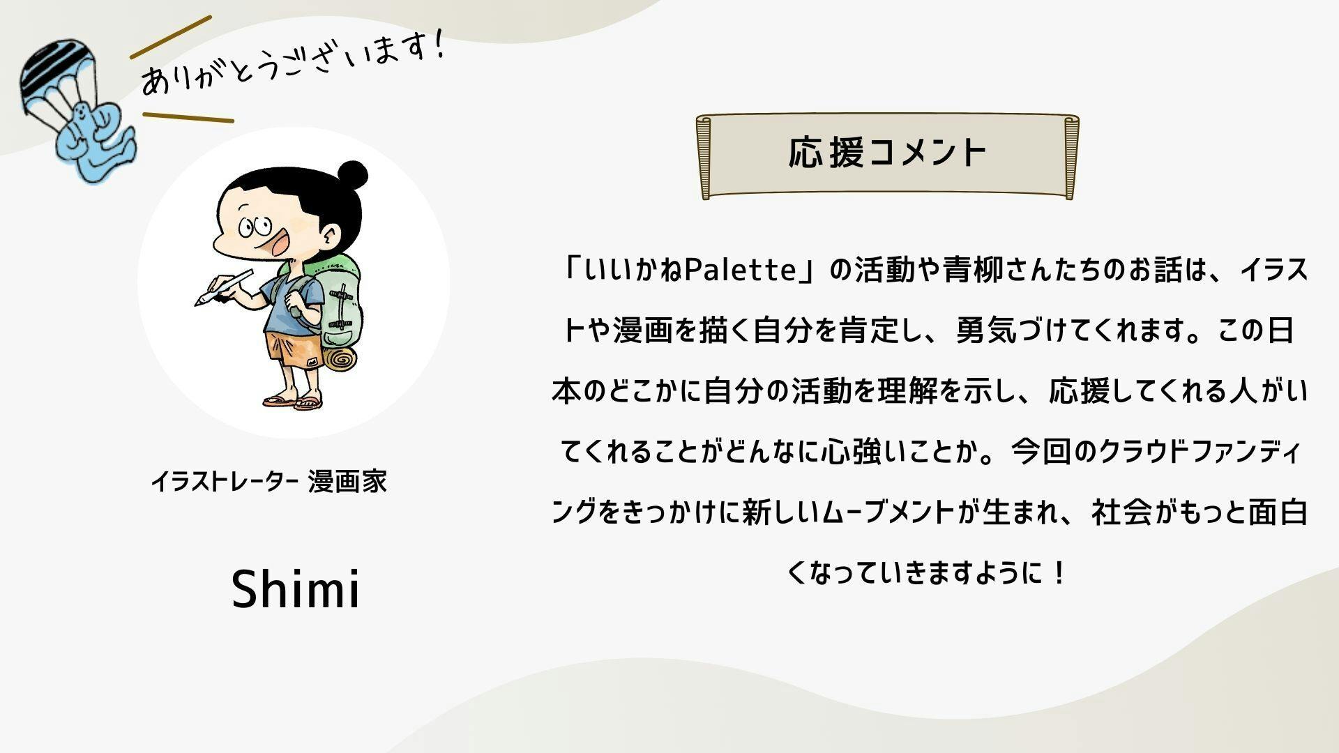 深井さんのコメントで支援決めてコテンにも入会しました。いつかいいかねパレットに泊まりたいです。